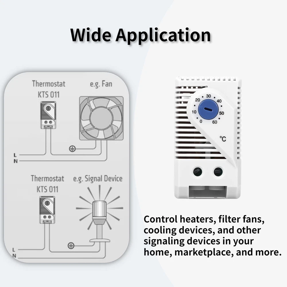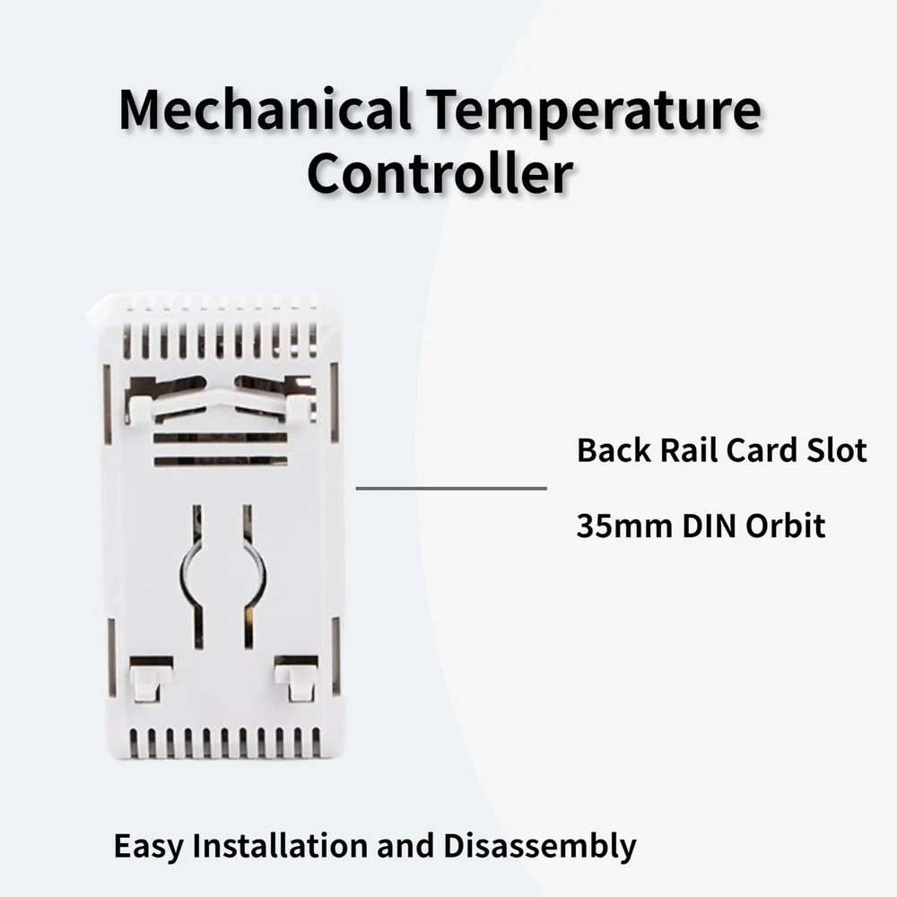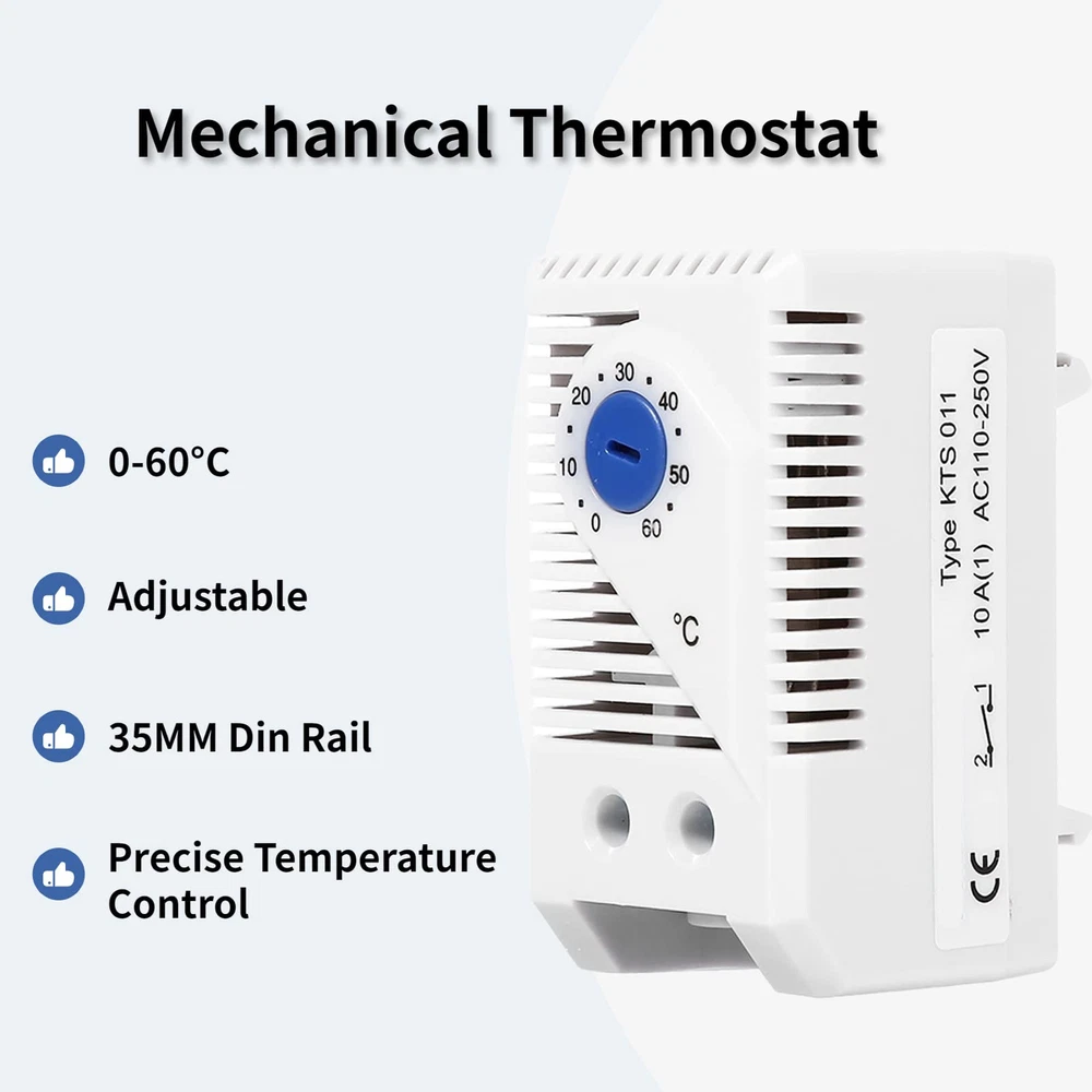Specifications: Condition: 100% Brand New Material: Plastic + Electronic component Color: Shown as picture Type: Blue Button, Red Button (Optional) Adjustable Temperature: 0℃-60℃ Voltage: 110V-250V Sensor Element: Temperature sensing material Type: Quick action Resistance: <10mΩ Service Life: >100,000 cycles Switch Maximum Capacity: 250VAC, 10(2)A / 110VAC, 15(2)A DC 30W Wiring Mode: 2 pole terminal 2.5mm 2 wire Installation Method: 35mm DIN orbit Operating/Storage temperature: -20 to +80℃(-49 to +176℉) Protection Level: IP20 Size(L x W x H): Approx. 60 x 43 x 33mm / 1.8 x 1.7 x 1.3inch Weight: Approx. 52g Package Included: 1 x Mechanical Thermostat 【0-60°C】Our mechanical thermostats have a temperature control range of 0°C to 60°C, ideal for controlling heaters, filter fans, cooling devices and other signaling devices in your home, market, etc. 【ADJUSTABLE】The adjustable temperature thermostat has a large data scale and adjustable buttons for easy and convenient adjustment. Switch maximum capacity: 250VAC, 10(2)A / 110VAC, 15(2)A DC 30W. 【EASY INSTALLATION AND DISASSEMBLY】The thermal control regulator is designed with standard rail clips and has a 4-foot seat, which is easy to install and disassemble. The 2-wire circuit interface on the bottom of the thermostat makes wiring more secure and safe. 【WIDE APPLICATION】Our thermostat switch is made of high-quality plastic material, with fine workmanship, environmental protection, safety and durability. Primarily used to control cooling applications such as filter fans and other signaling devices. 【SATISFACTION 】We promise that every customer is 100% satisfied with the purchase. If you have any questions about the purchase, please feel free to us. We will give you a professional and detailed reply within 24 hours. Click to buy now!