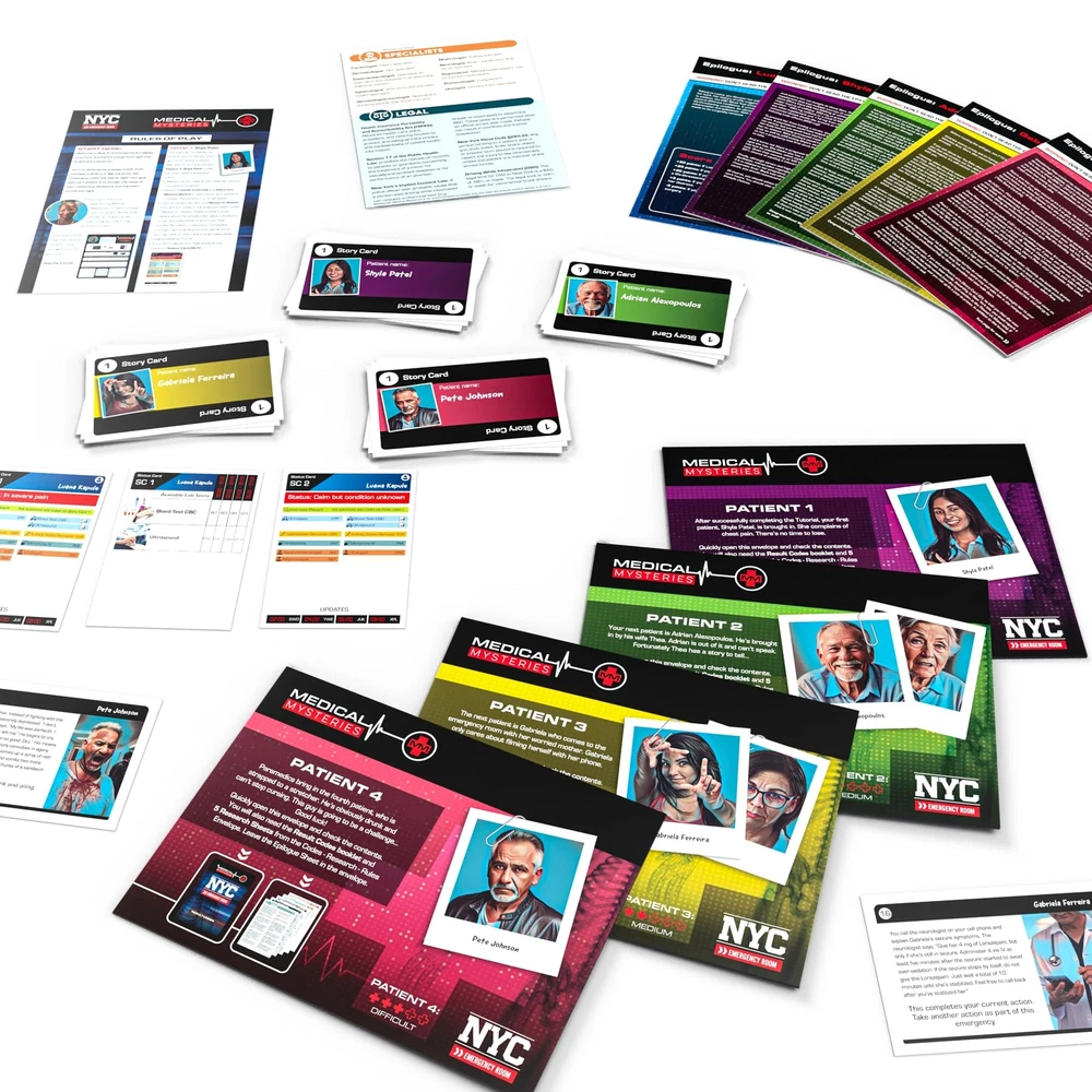Your patients' lives are in your hands. Will they survive the night? Work as a team to solve real life medical cases. Each patient has a mysterious medical condition and it is your job to diagnose and treat before it's too late. Do you have what it takes to save their lives? BE A NEW YORK CITY EMERGENCY ROOM DOCTOR: Medical Mysteries puts you in the shoes of an Emergency Room doctor, tasked with ensuring your patient survives the night - their lives are in your hands. Can you work with your team to examine, diagnose and treat your patient, before it's too late? INCLUDES 4 PATIENTS AND A TUTORIAL: This Medical Mysteries game includes 4 patient files to solve. Each patient comes into the Emergency Room with a mysterious medical condition that you’ll need to unravel before it’s too late. Also includes a Tutorial which walks you through a patient case so you feel prepared to treat and diagnose patients on your own before moving to the 4 main patients. Each case has a varying level of difficulty. EXAMINE, DIAGNOSE AND TREAT: As Emergency Room Doctors, it is your job to examine your patients’ mysterious symptoms, review their medical history and uncover hidden clues. Work together to diagnose the conditions. Follow clues, run tests, consult specialists and use your instincts to diagnose the patient, and finally make the right treatment decisions to help your patient survive the night. Then, work to determine the underlying cause of their condition. Earn points along the way for making the right treatment decisions and helping your patient survive the night. EASY TO LEARN AND PLAY: Medical Mysteries game includes a full case tutorial to walk you through how to play. Tutorial helps players navigate through their patient's treatment plan, and no prior medical knowledge is necessary. Each patient includes an intake interview, and an Electronic Medical Record to review and assess the case. IT’S A RACE AGAINST THE CLOCK: Each action you take progresses the game, and the clock. Your goal is to get your patient to survive the night. Continue testing and diagnosing until time runs out. GREAT FOR INDIVIDUALS, PARTIES, GROUPS AND COUPLES: Love watching Medical Shows? Love suspense and adventure? This game is for people of all ages who would enjoy being immersed in this brilliant adventure where science meets suspense!