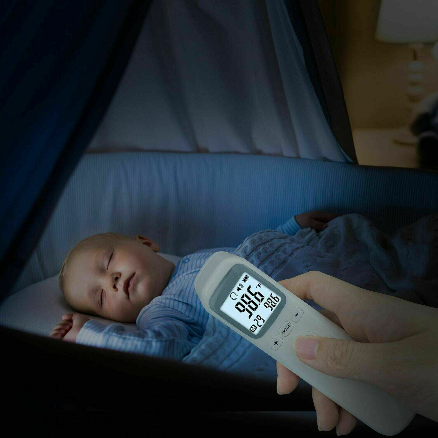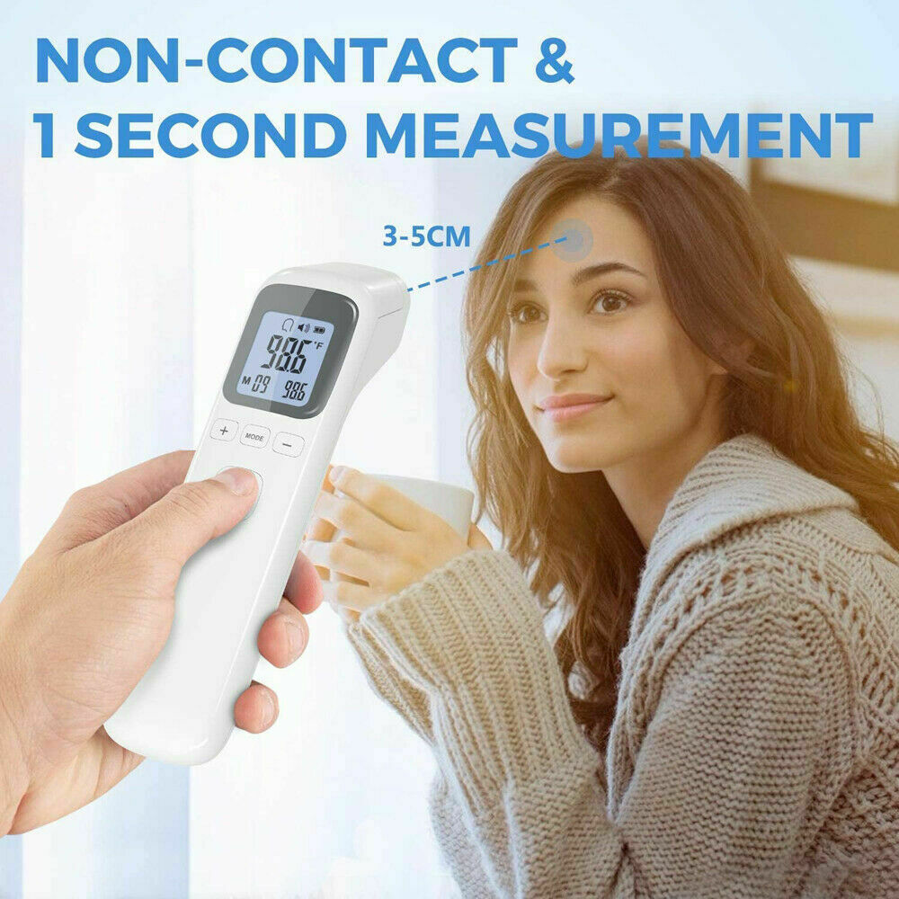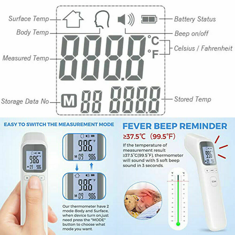 Product description Infrared Forehead Digital Thermometer, Temporal and Ear, Temperature Measurement for Adults Kids Infants and Baby, Accurate Instant Reading, Fever Alarm with Memory Function Product Features : Rapid temperature measurement: Simply point and activate, and within 1 second, results can be seen. 35 memory temperature readings Mute mode for readings for baby, infants, kids, and adults Temperature Alarm (default value is 100.4°F or 38°C) Measuring unit: Optional for Celsius ° / Fahrenheit ° Multi-function one key operation for body, object, forehead, and liquid temperature Automatic off function after 15 seconds Measuring Range: body mode: 93.2°F - 109.2°F or 34°C - 42.9°C Power by: 2 x AAA batteries (not included) Quick Start Guide °F/°C Switch: when the thermometer is on, press the "Mode" button about 2 seconds until F1 display , then press "+" / "-" button to switch between modes