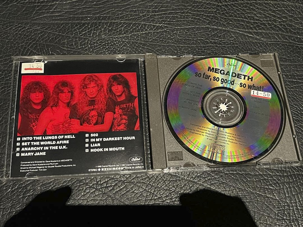 Items Detail: MEGADETH so far so good so what JAPAN 1st CD 3200yen 1988 THRASH METAL DISC:VG some slight used marks INSERT:VG+ no japanese poster, it has a sticker on the inside of cover OBI: with no obi Shipping Information for CDs: In the Shipping and handling ,We can see the first weight for your location.With the first weight,we can ship 1-4 CDs. If you want to buy more, Please don't pay before my invoice. The items will be shipped from China,packed very well with hard cardboard box and shipped with tracking numbers. If you have any questions, please contact me.