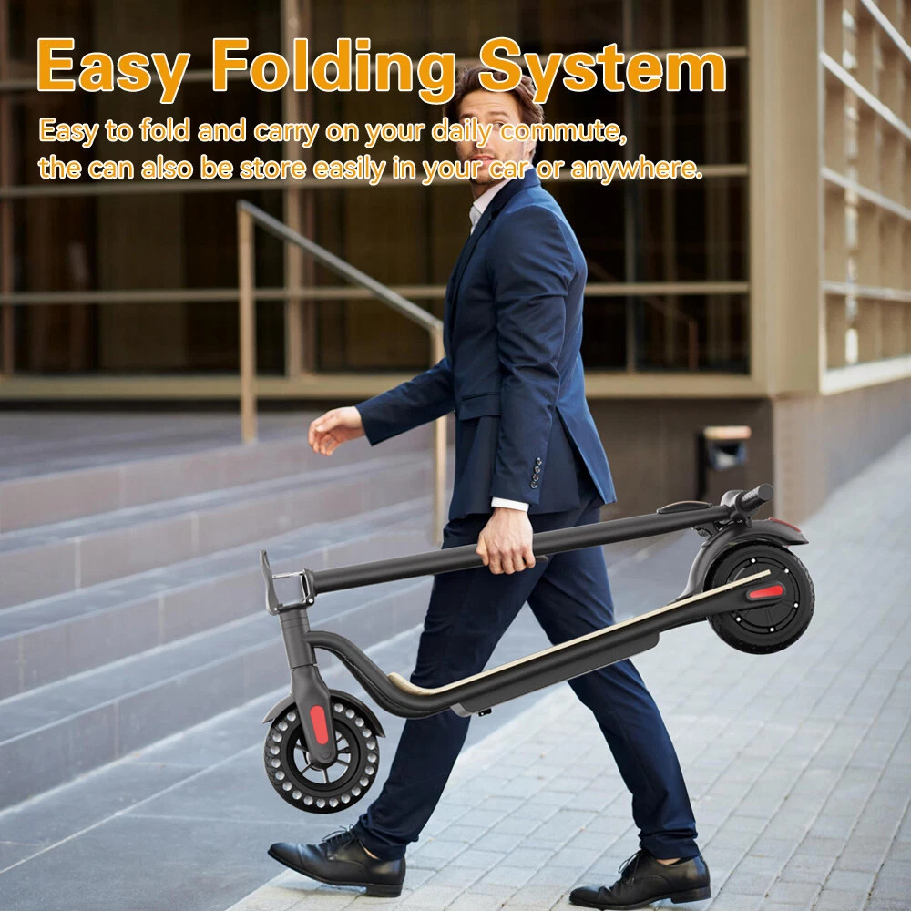 Features: 【 Anti-puncture solid tires 】The electric scooter uses 8.0-inch honeycomb shock-absorbing tires with high elasticity and wear resistance. The honeycomb tire does not require inflation, repair, maintenance.And it's don't worry about punctures.It also has a good anti-slip effect. 【 5.0 AH large capacity battery and more battery life 】Fitted with 5.0 Ah lithium-ion battery, the scooter can provide long full mileage 8-12km, up to 12km range.Full charged for only 3-4 hours, will hold climbing ability 20 degrees. 【 Three gears with headlight & rearlight 】Three gears (6.25MPH=10KM/H, 12.5MPH=20KM/H, 15.5MPH=25KM/H), easy to change through a button on the LED display which also shows the battery and the gear clearly. The low-speed gear prevents teenagers or children from driving too fast. LED Headlight and rearlight double insure your safety at night. 【 High level security 】This S10 electric scooter applies dual brake system (a motor electronic brake on the handlebar and a foot friction rear brake on the back wheel) with CE/UL/FCC/RoHS safety certification. The pedal is made of Malleable Maple Wooden, which is more durable. You can easily cross all kinds of roads, reduce bumps and keep you feel comfortable. 【 None-0 start 】The electric scooter applies a none-0 start for the safety consideration, please scroll for a distance to start. Features a bigger and longer deck, a double braking system, a long-range battery, and a One-step portable folding mechanism, the Megawheels electric scooters can bring a smooth and comfortable riding into your way.We provide professional technology support. Any question, just contact us, we will reply in 24 hours with satisfying solutions. 【 Delivery time and Service 】We have warehouses in the US, scooters can be delivered in 3-7 days. If you have any questions about the scooter, please feel free to contact us, we will help you in 24 hours. Specification: Brand: Megawheels Model: S10 Dimension: Unfolding 105 x 43 x 118 cm; Folding: 105 x 43 x 48 cm Net Weight: 11.9kg Color: Black Frame Material: Aluminium Tires: 8.0" Honeycomb Front Tire & Solid Rear Tire Max Load: 100kg Max speed: approx.25KM/h Speed level: Gear 1--Max 10km/h ; Gear 2--Max 20km/h; Gear 3--Max 25km/h Mileage: approx. 8-12km Grade Ability: 20 degree slope Working Temperature: -15°C-50°C Storage Temperature: -20°C-25°C Mode Type of Motor: Brushless hub motor Battery Type: High quality lithium battery Battery Capacitiy: 5.0 Ah Battery Voltage: 36V Charger Input Voltage: 100V-240V Charger Frequent: 50Hz/60Hz Charging time: approx. 3.5 hours Package Contents: 1 * Folding Electric Scooter 1 * Battery Charger 1 * User's Manual LCD Dashboard Long Battery life 8.0'' Anti-puncture Tires Three speeds (10km/h, 20km/h, 25km/h), easily changed via buttons on the LED display, also clearly showing remaining battery and headlight status. With a battery capacity of 5200mAh, this adult electric scooter has a lifespan of up to 8-12km (depending on road conditions and rider's weight), and the charging time is 3-4 hours. Honeycomb tires can prevent tire blowouts. You can drive freely on any road. You don't have to worry about tire blowouts,it can avoid trouble during driving. Before use, please kindly read the schematic diagrams and assembly steps of manual to assemble the front wheel: 1. Step on the base, lift the fork firmly to remove the base. 2. Remove the rubber plugs on both sides of the front fork, and unscrew the front axle with the two 6mm hexagon wrenches in the package. 3. When installing the front wheel (please pay attention to the direction of the tread of the tire, as shown in the lower right or the inflation port to the right), and tighten the front wheel axle. 4. Plug back the rubber plugs on both sides of the front fork. Note: Our products have been certified under UL2272 safety standards.