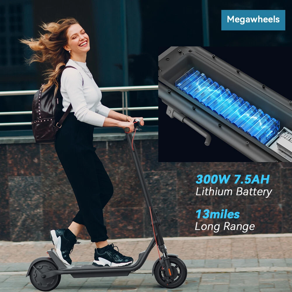 Features: Powerful Motor & Long Battery Life: The electric scooter is equipped with a peak 300W motor. The high-powered motor can easily navigate 10% slopes and is equipped with a 164Wh high-capacity lithium battery with a range of 13 miles, making it ideal for short-distance commuting and trips Safe & Comfortable Riding: This electric scooter adults is equipped with Electronic Brake and Drum Brake. Bright headlight and bell ensure safe riding at night.To ride safely, the electric scooter is equipped with a non-zero start function to ensure safe starting 3 Speed Modes & LED Digital Display: In order to meet the different needs of use from teens to adults, the electric scooter is equipped with 3 speed gears: low speed (3 mph), medium speed (9 mph) and high speed (15 mph). Riders can see real-time speed, speed mode, battery life and light icon with LED display Lightweight & Foldable Design: The adult electric scooter is equipped with one step folding system, and the weight of the electric scooter is only 32.85lbs, which is convenient for you to carry it up and down stairs or into the subway station. Also, it can be placed in the trunk of the car or any compact space. The folded size is 43.03"x17.32"x20.51" SMART APP CONTROL: Lets you lock and unlock these folding electric scooters for adults and monitor their riding status using the Tuya app. Enhanced Safety Features: Safety is a top priority with the A1C electric scooter. It comes with ultra-bright headlights, taillights, and a bell to enhance visibility and alert others to your presence, especially during nighttime rides. The scooter also features sensitive Electronic Brake and Drum Brake, providing reliable stopping power and reducing the risk of accidents. It is UL 2272 Certified. Warm Tips - The speed and range of electric scooters vary depending on weight, surface, temperature, battery and riding style. If you have any questions, please contact us Specification: Brand: Megawheels Model: A1C Dimension: Unfolding 43.03×17.32×45.08 in; Folding: 43.03×17.32×20.51 in Net Weight: 32.85lb Color: Black Tires: 8.5" Front & Rear Solid Tire Max Load: 100kg Max speed: approx.25KM/h Speed level: Gear 1--Max 3 MPH ; Gear 2--Max 9 MPH; Gear 3--Max 15 MPH Mileage: Approx. 13 miles Grade Ability: 10% Working Temperature: -10°C to 45 °C Storage Temperature: -20°C to 25°C Battery Capacitiy: 7.5 Ah Rated Power: 300W Charger Input Voltage: 100V-240V Charger Frequent: 50Hz/60Hz Charging time: approx. 5.5 hours Package : 1 * Electric Scooter 1 * Battery Charger 1 * User's Manual Note: This products have been certified under UL2272 safety standards.