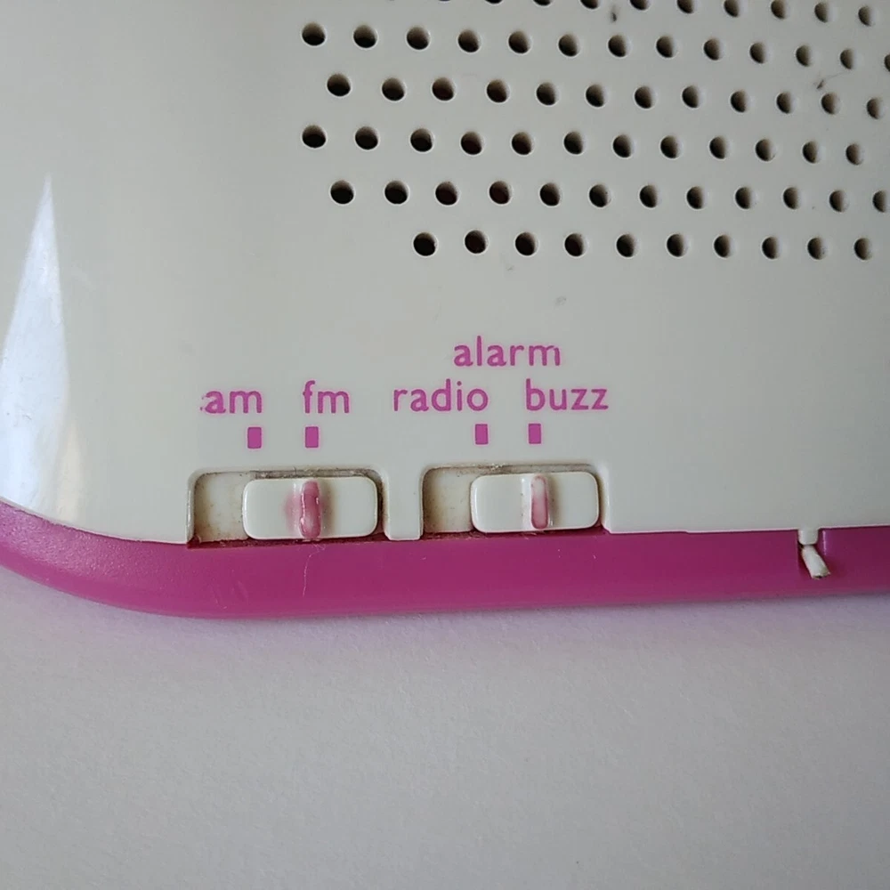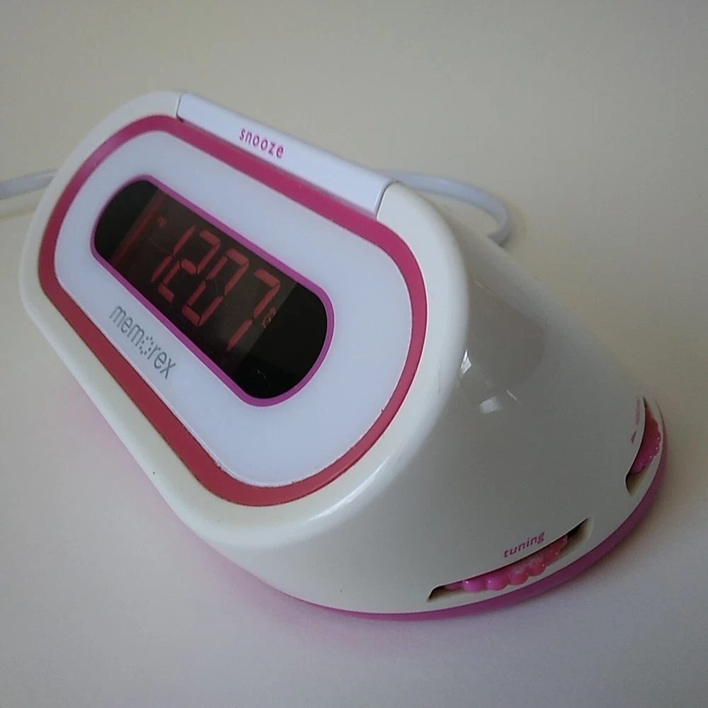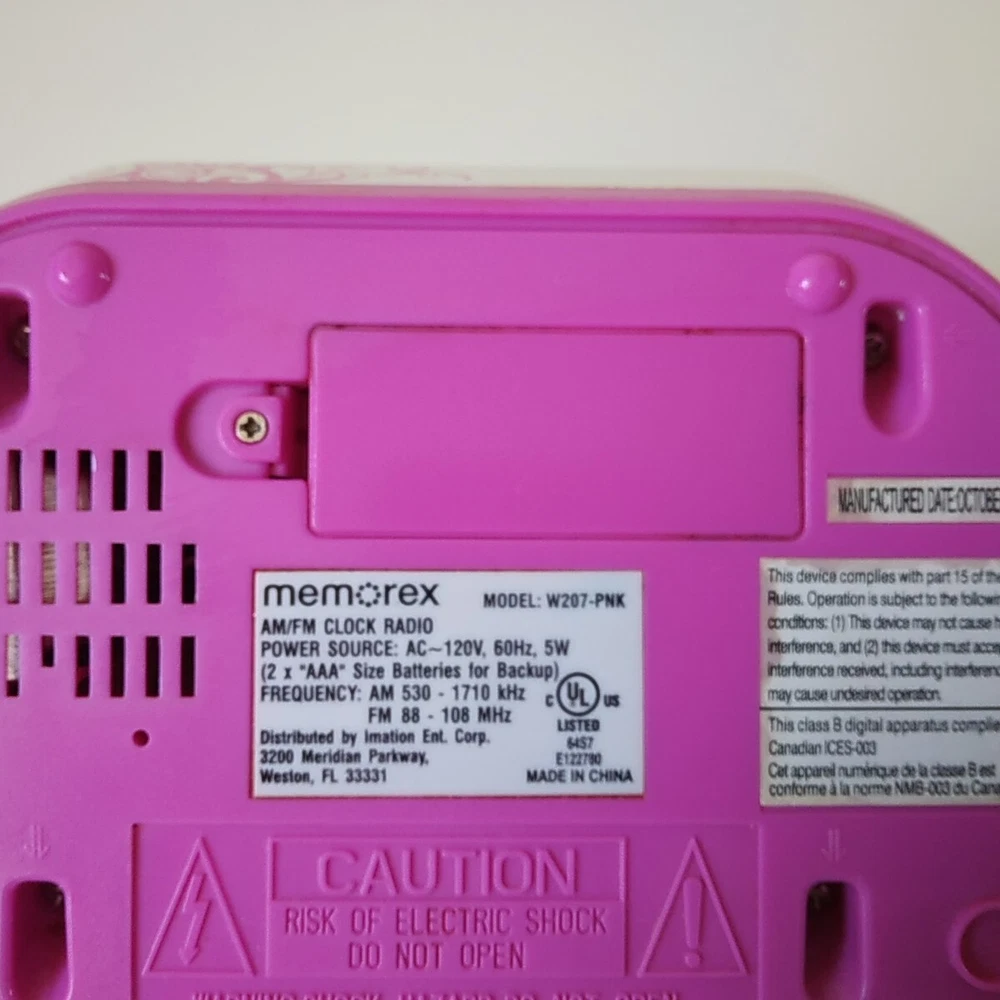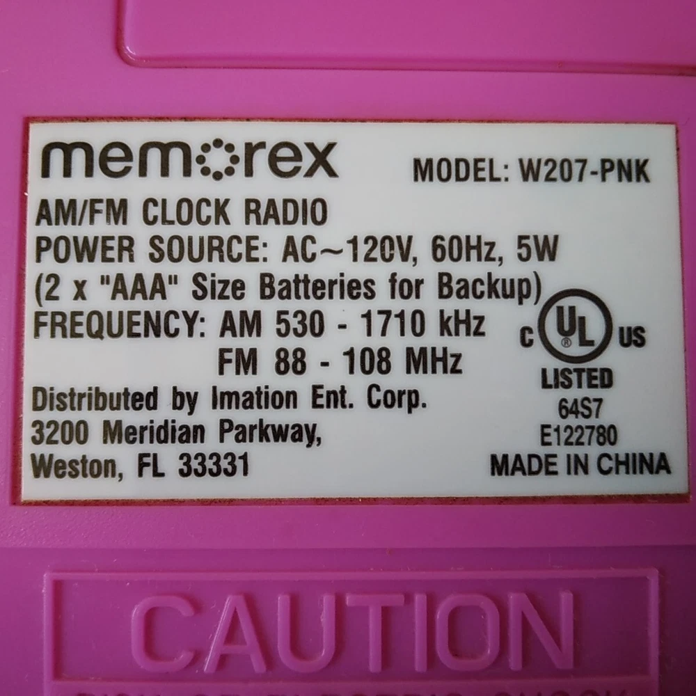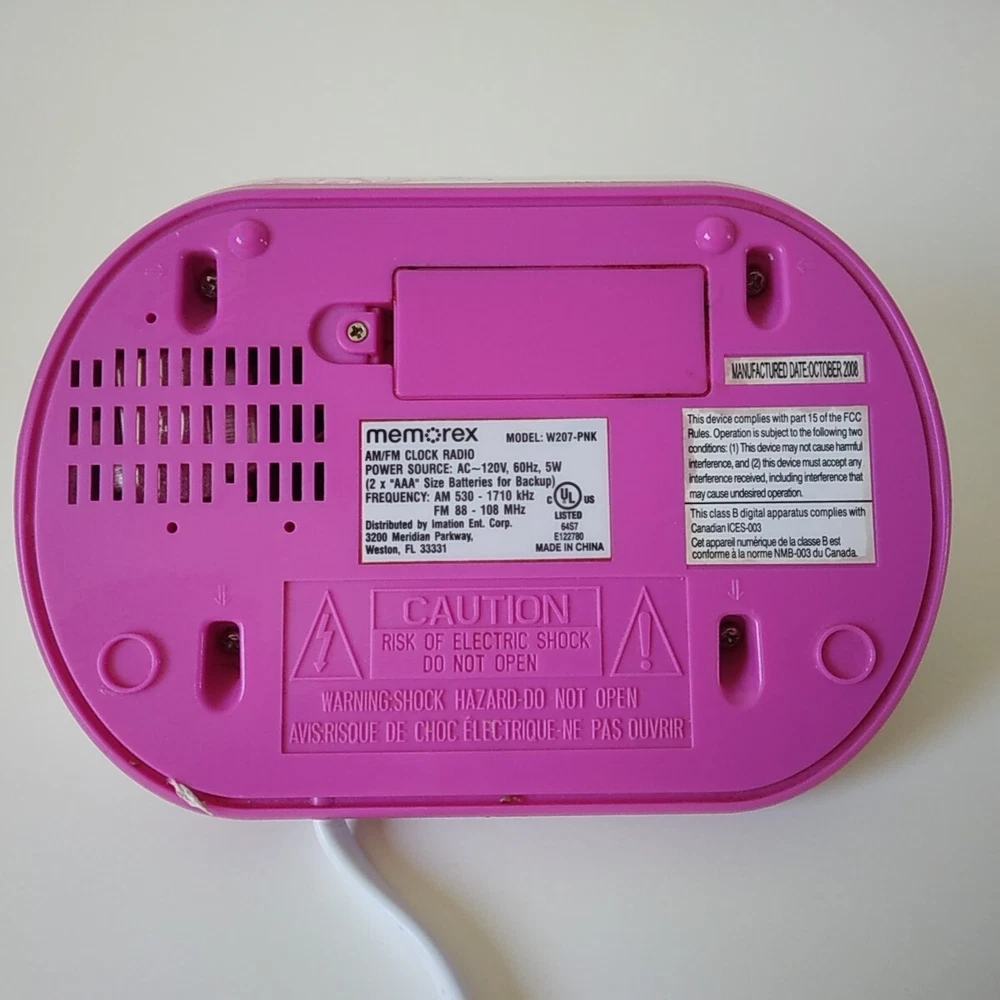 Memorex Model: W207-PINK Digital Radio Alarm Clock. This clock has been tested on all functions and works well. The alarm is a repeating beep. This clock is in good cosmetic condition. Minimal scratches. See pictures for a detailed look. Item will ship well protected. Thanks for the interest.