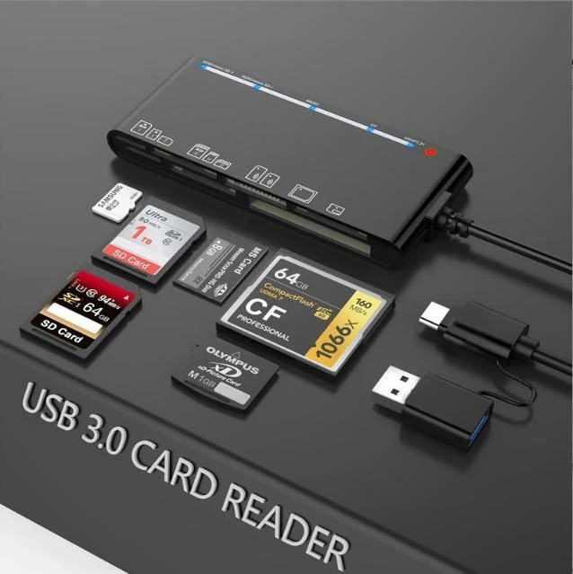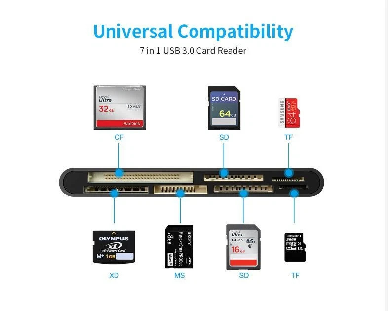 Memory Card Reader 7-IN-1 USB 3.0 High-Speed Adapter for Micro SD SDXC CF SDHC Specific attributes type:SD card.XD card,mermory stick card, cf card interface:USB Card slots: all in 1 installation: internal model number:rt-cr-324 material:ABS Support card:SD TF Memory card reader application: iusb pro key feature 1: usb3.0 memory card reader key feature 2:usb 3.0 card reader key feature 3:usb card reader warranty:12 months application:camera lantop pc color;black supported cards:XQD&CF