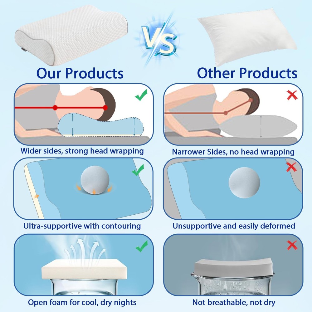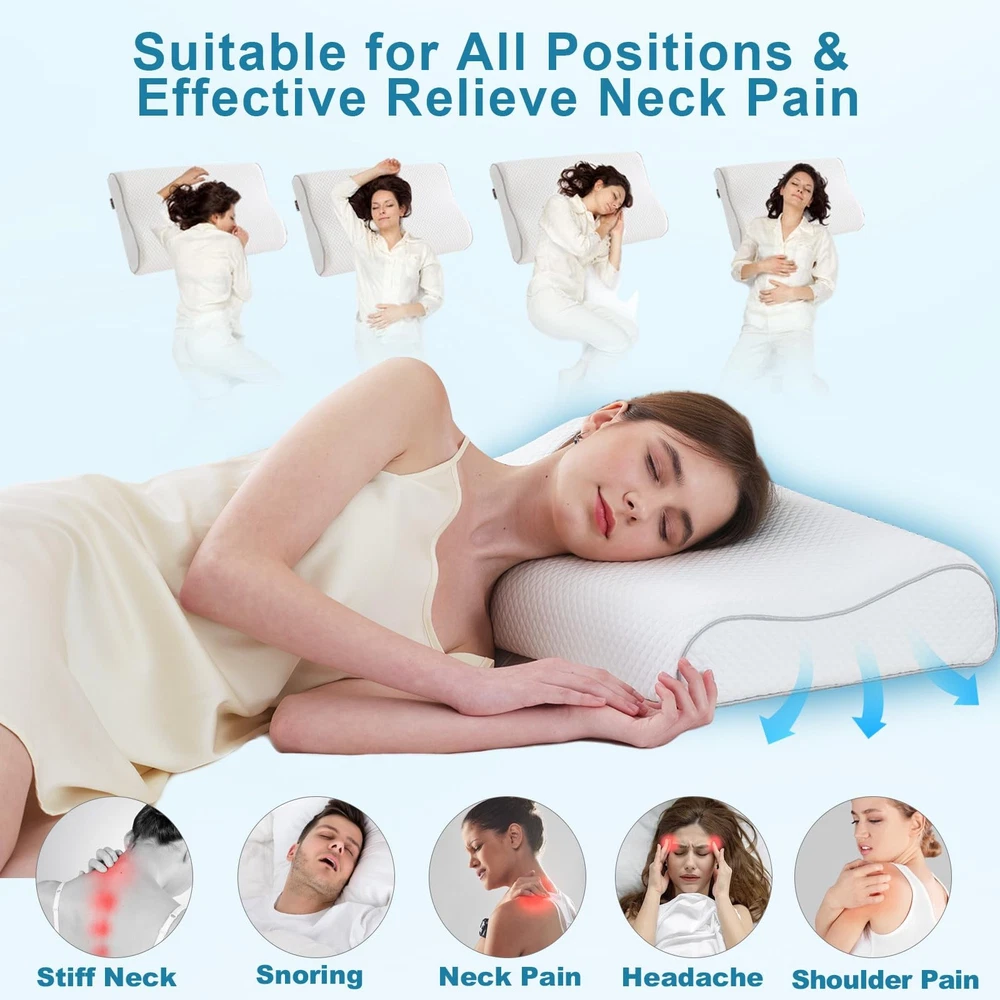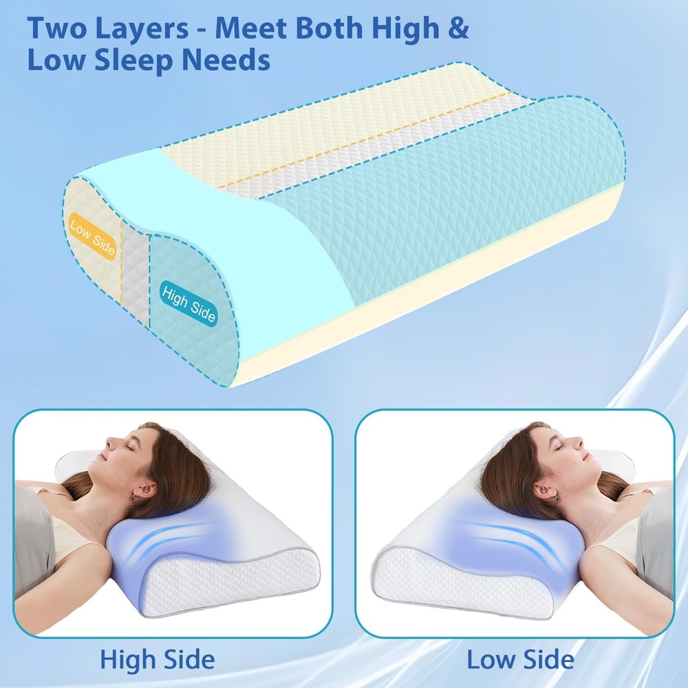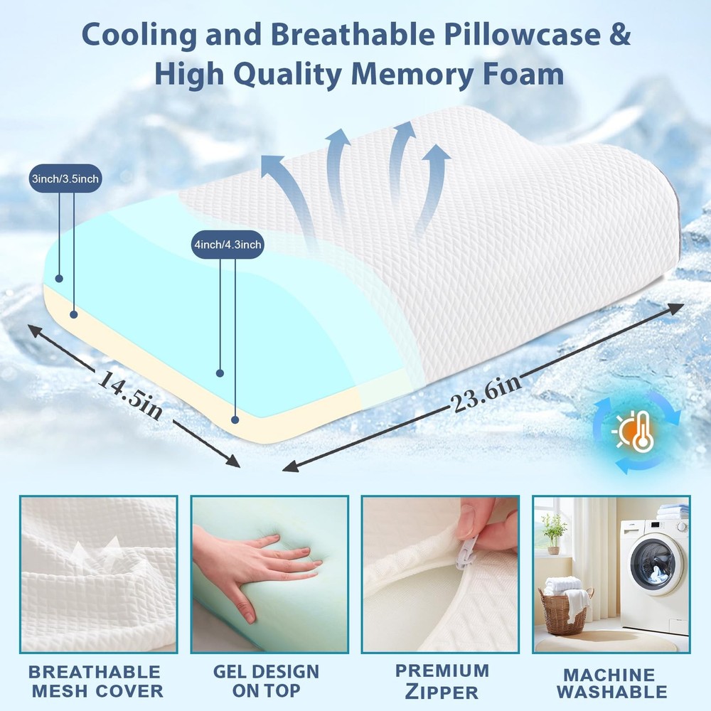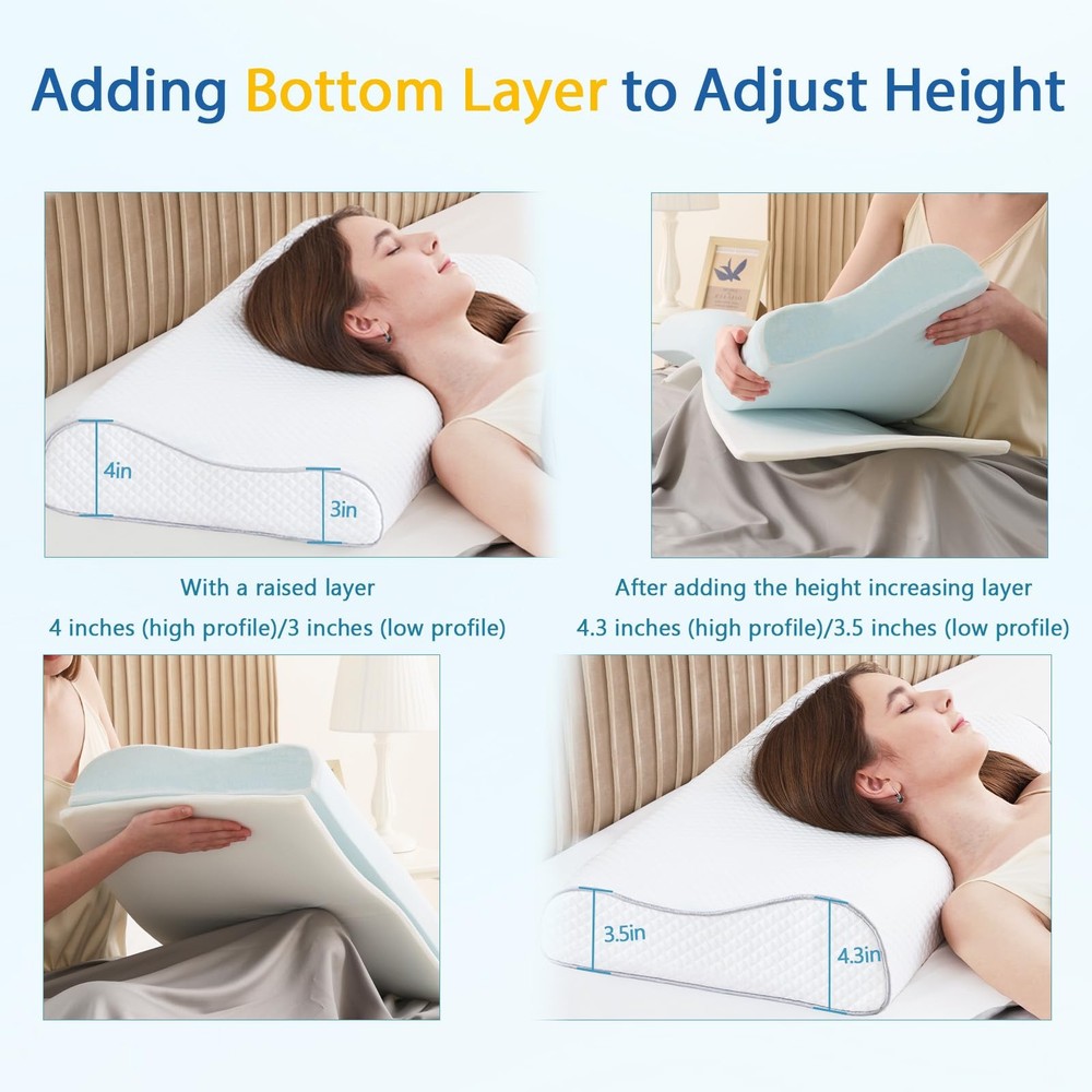 Memory Foam Pillows Cervical Pillow for Neck Pain Relief, Ergonomic Pillow for Shoulder Pain relief, Orthopedic Contour Pillow for side sleepers, Back and Stomach Sleeper with Cooling Pillowcase RELIEF AT NIGHT, REFRESHING IN THE MORNING!-Say goodbye to sleepless nights, have you ever been upset by poor quality sleep? Do you wake up with a stiff neck or back pain? Our ergonomically designed memory foam pillow perfectly supports your head, neck and shoulders. The cervical pillow contours naturally fit your spine, providing the right alignment and support to alleviate stress. Wake up feeling refreshed and no longer sore! Choose our orthopedic pillow, gives you a comfortable, quiet night's sleep 2 PERSONALISED HEIGHT OPTIONS-It is true that everyone's ideal sleeping height is different, choose the contour pillow that suits your height is an important guarantee to say goodbye to bad sleep, for this reason, our cervical pillow ergonomic design has 2 different heights (23.6*14.5*3/4 inches L*H*W or 23.6*14.5*3.5/4.3 inches L*H*W) for you to choose, you can choose a more suitable height according to your own sleep position and enjoy a comfortable sleep. This adjustable cervical support pillow is suitable for side sleepers, back sleepers, stomach sleepers and low pillow sleepers SLOW REDOUND MEMORY FOAM-The Cervical Pillow is made of high-density CertiPUR-US and Oeko-Tex certified slow rebound memory foam, and maintains its shape and firmness over time. This orthopaedic pillow is firm enough to support your head, neck, shoulder and back muscles, providing support when you lie on your back or side, while being soft enough to ensure maximum comfort and body relaxation BREATHABLE & REMOVABLE PILLOWCASE-This pillow for side sleepers comes with a high quality pillowcase that is soft and breathable. The pillowcase is zipped, removable, machine washable and skin friendly. The ergonomic pillowcase is made of cold silk technology fabric that fits perfectly against the skin. The soft and breathable fabric stays cool all night long for a comfortable night's sleep EXQUISITE GIFTS AND PREMIUM SERVICE-Our memory foam pillow will reduce sleepless nights and provide you with quality sleep. this contour memory foam pillow is a great gift for your family and friends. suitable for seniors, students, office workers, etc. made with precision art, durable, high quality, safe and reliable packaging. everyone's foam pillow experience may vary, if you have any questions please contact us! After opening the package, the product itself will have a certain memory foam smell, which is non-toxic and harmless. We recommend ventilation for 24-28 hours before use, which is a normal phenomenon. The foam pillow will return to its original shape within 72 hours after unpacking
