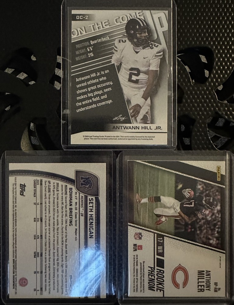 6 cards pictured included: 1. 2024 Leaf Draft On the Come Prospect Antwann Hill Jr. #OC-2. 2. 2024 Bowman Chrome U Rookie Seth Henigan #162. 3. 2018 Donruss Rookie Phenom Prizm Relic Anthony Miller #RP-AM. 4. 2021 Chronicles DP Illusions Rookie Kenneth Gainwell #121. 5. 2021 Prizm DP Rookie Kenneth Gainwell #113. 6. 2020 Sage Draft Rookie Patrick Taylor Jr. #78.