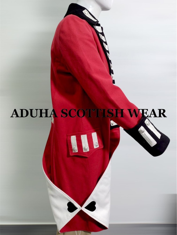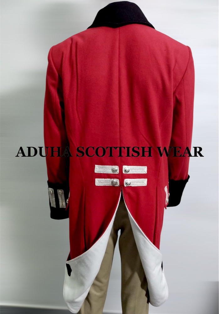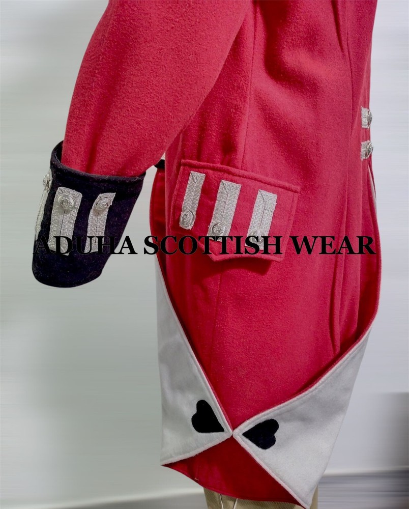New Revolutionary War Regimental Army Uniform, Historical Tailcoat, Red Wool, CHARACTERTISTICS: 100% Wool Custom Fit Style. Main color : Red / Custom color are available Professionally stitched UNIFORMS TYPE: Napoleonic Uniform Napoleonic Uniform Reproduction British Napoleonic Uniform Blue Napoleonic British Officer Uniform Uniform MATERIAL TYPE: Wool