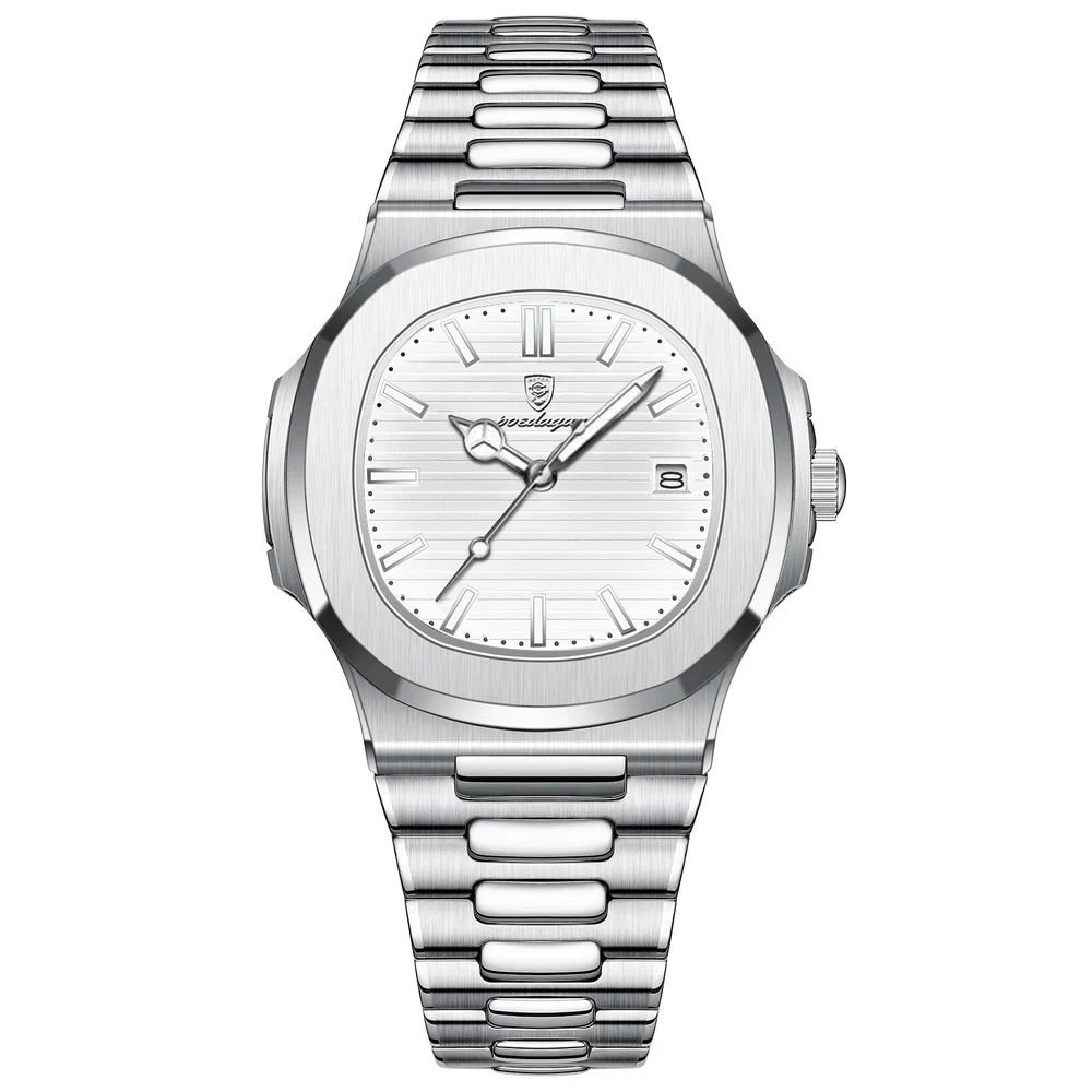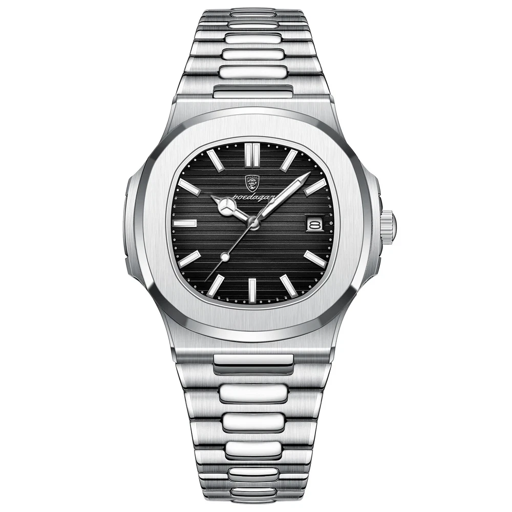 Specifications Case Thickness 10mm Band Width 20mm Band Material Type STAINLESS STEEL Case Shape Square Dial Window Material Type Hardlex Boxes & Cases Material Paper Model Number 613 Dial Diameter 40mm Feature Luminous,Auto Date,Complete Calendar,DIVER,Water Resistant,swim,luminous hands Water Resistance Depth 3Bar Clasp Type Push Button Hidden Clasp Band Length 20cm Case Material STAINLESS STEEL Movement Quartz Style Fashion & Casual Brand Name POEDAGAR Origin Mainland China Certification CE Item Type Quartz Wristwatches