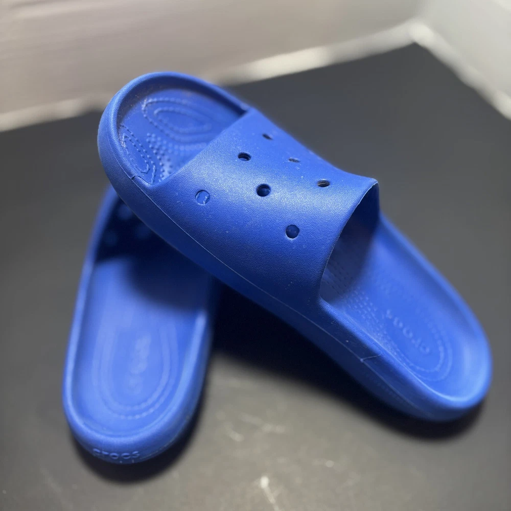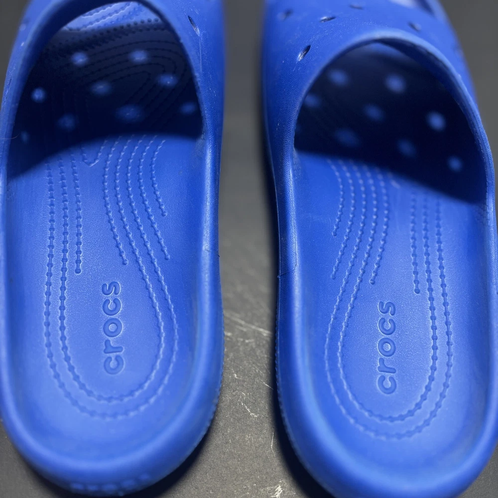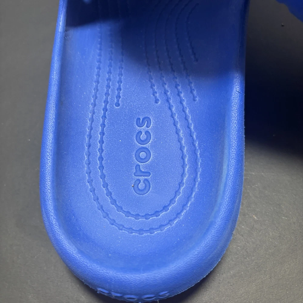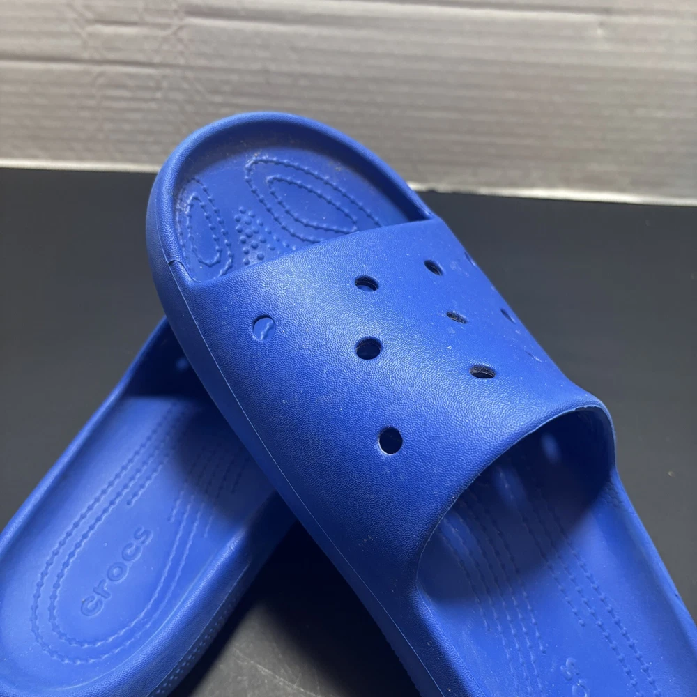 These Crocs slides are unisex and come in a blue color, suitable for both men and women. Designed with a slip-on and a round toe shape, they are perfect for casual wear and travel. With a solid pattern and a comfortable rubber outsole, these slides are great for outdoor activities and sports. The size is suitable for a men's 10 or women's 12, featuring a foam insole and a synthetic lining for added comfort. Ideal for the summer, fall, and spring seasons, these Crocs slides offer a stylish and practical option for everyday wear.