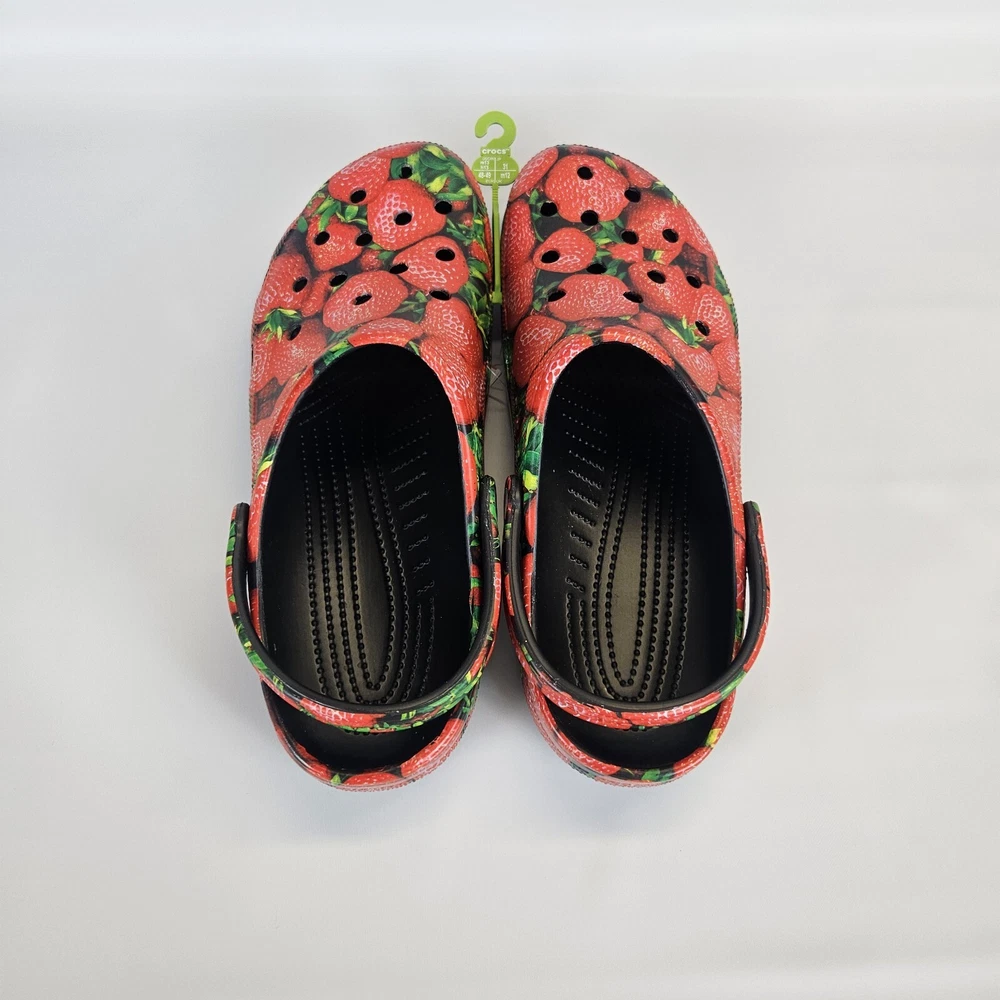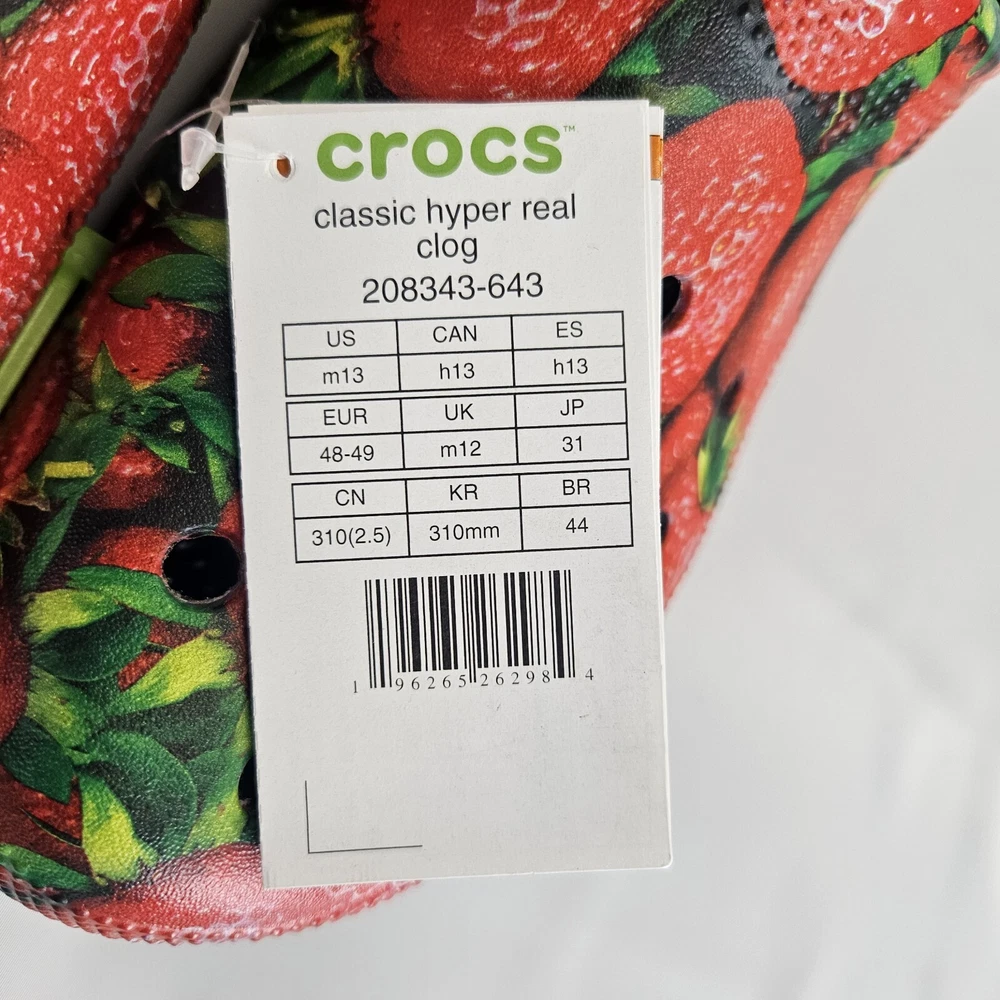Pattern:StrawberriesProduct Line:Crocs Hyper Real ClogsType:CasualCustomized:NoVintage:NoFeatures:Breathable, ComfortBrand:CrocsClosure:Slip OnDepartment:MenTheme:Botanical, City, College, Food & Drink, Nature, Outdoor, Beach, Gardening, Water, WeekendModel:CROCS Hyper Real StrawberryUS Shoe Size:13Upper Material:Syntheticgtin13:does not applyColor:Red MulticolorStyle:ClogUPC:does not apply