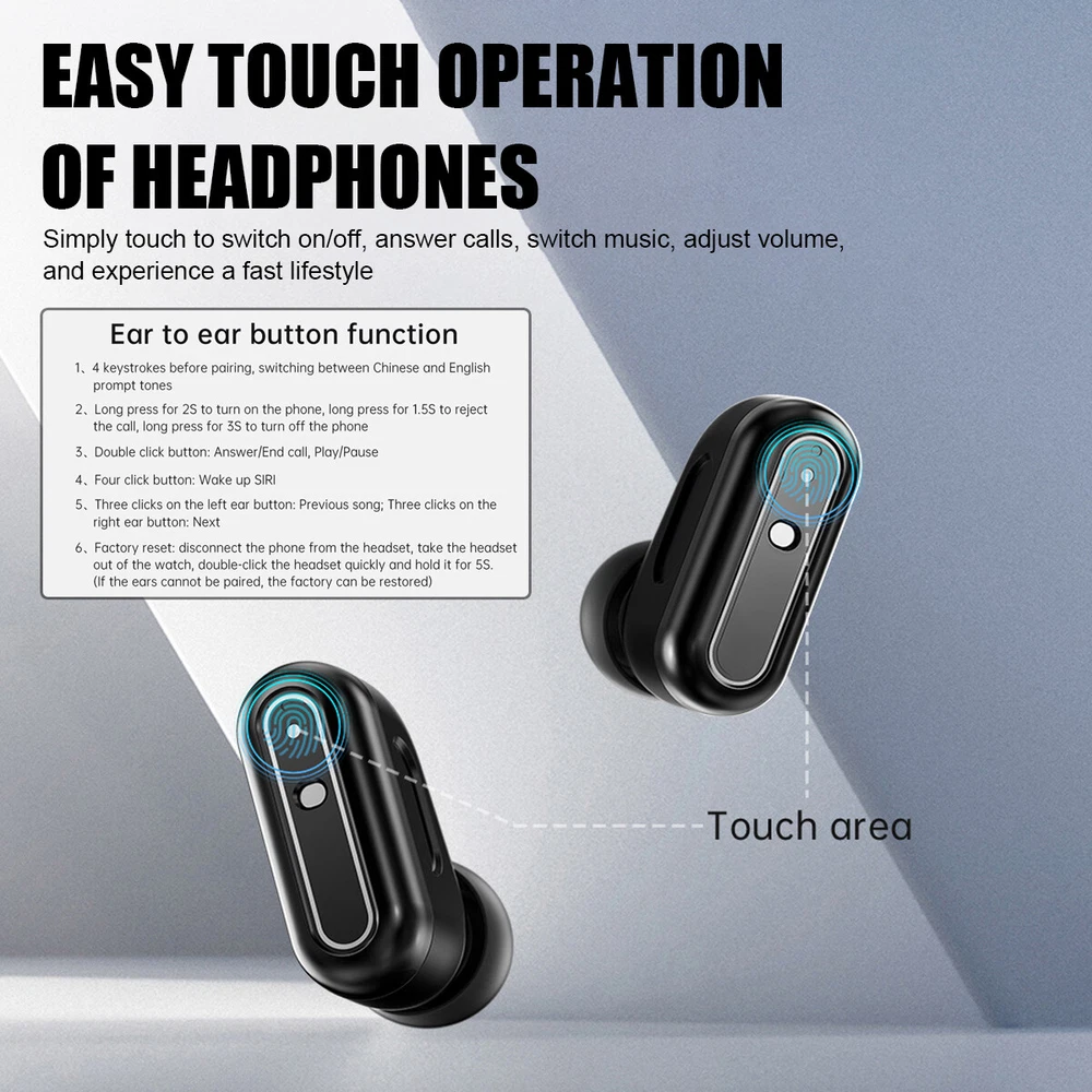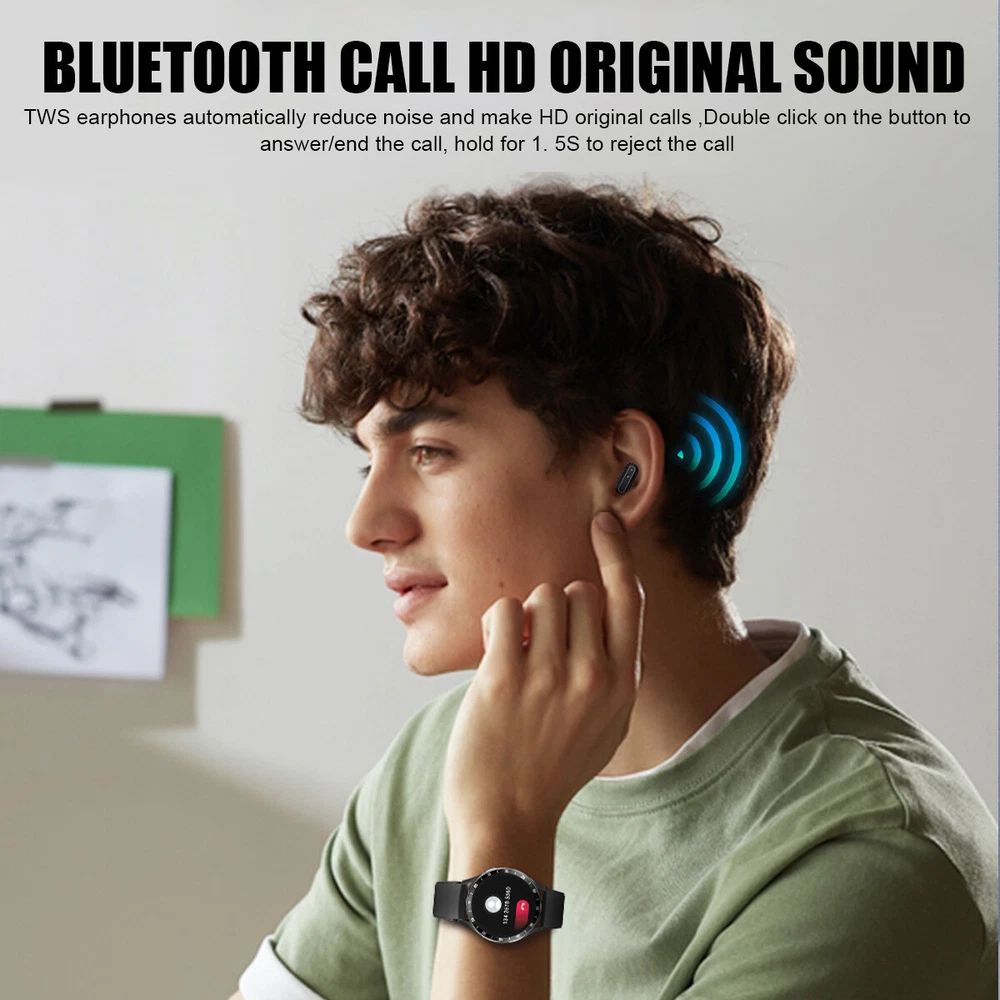 Product Description Features: New design for 2 in 1: Smart watch with TWS bluetooth earbuds, perfect combination of smart watch, bluetooth headphone. All metal steel dial, full of high-tech feeling. 1.39 Inch Large Screen Smart Watch:With 1.39" large screen, super Retina HD display, 360*360 HD resolution, the Smart Watch has better color saturation, the picture quality is more delicate and clear. 10+ watch dials can be used, and you can define your own theme. Make/Receive Calls & Support Notifications: After connecting to bluetooth, you can directly dial the phone number on the screen to answer the call. When you smartphone receive calls and messages (like SMS, Skype, Facebook, Twitter, WhatsApp, Line, Viber.), it will push to TWS earbuds watch. Make our lives more convenient and intelligent. Powerful Battery: Build-in 240mAh polymer battery for watch and 25mAh polymer battery for earbuds. Large capacity and low power consumption design offers longer endurance. 8-12 days Standby. The smart watch can charge the earphones for 2-3 cycles times. More Application: With IP67 waterproof, the smart watch can connect with Android ios cell phone, it has multi language, information alert, alarm clock, bracelet, health monitoring(24h continuous heart rate, sleep, blood pressure), Exercise records (pedometer, calories, mileage),Time, week, date. Built in NFC function makes this watch a smart lock key for your house or office, no more worries about forgetting take keys when go out. Specifications: Material: Metal, silicon Screen size: 1.39 inches, resolution 360 x 360; Bluetooth-compatible version: call Bluetooth-compatible 5.0/data Bluetooth-compatible 4.0; Music time: 3.5 hours; Charging time: 1-2 hours; Memory: 192KB RAM+1024KB ROM+128MB UI-Flash; Compatible system: Android 4.4 and above; compatible for ios 8.0 and above; APP software: FitCloudPro; Features:Bluetooth call, full touch, heart rate, shake and take photos, call reminder / rejection, information reminder, Multi Sport mode,weather,NFC Main functions: multi-language, information reminder, alarm clock, looking for bracelet, health monitoring, exercise record (pedometer, calorie, mileage), time, week, date, information reminder Watch battery:250mAh polymer battery Earbuds battery:25 mAh polymer battery for each earbud APP name: FitCloudPro App supports languages: English, Chinese Simplified, Chinese Traditional, German, French, Arabic, Czech, Greek, Spanish, Japanese, Persian, Italian, Korean, Dutch, Polish, Portuguese, Russian, Finnish , Swedish, Thai, Hungarian, Slovak, Croatian, Albanian, Turkish, Ukrainian, Hindi 26 languages Watch Support: English, German, French, Arabic, Czech, Greek, Spanish,Persian, Italian, Dutch, Polish, Russian, Finnish , Swedish, Thai, Hungarian, Slovak, Croatian, Albanian, Turkish, Ukrainian, Hindi The function of the button on the earbuds: 1. Press the button 4 times before pairing --- Chinese and English prompts to switch; 2. Long press 2S to turn on the phone, hold for 1.5 seconds to reject the call, and hold for 3 seconds to turn off; 3. Double click the button --- answer/hang up the phone; 4. 4 click the button --- wake up compatible for SIRI; 5. Double click the button --- play/pause; 6. Triple click the left ear button: previous song; triple-click the right ear button: next song); 7. Reset the headset to factory settings: When the headset is turned off, press and hold for 8 seconds. (If the two ears cannot be paired, you can restore the factory for re-pairing). Package included: Smart watch TWS earbuds (1 Pair) USB charging cable Instructions On Feb 11, 2025 at 23:45:50 PST, seller added the following information: