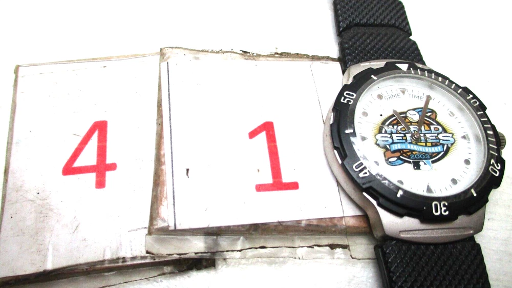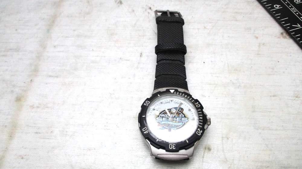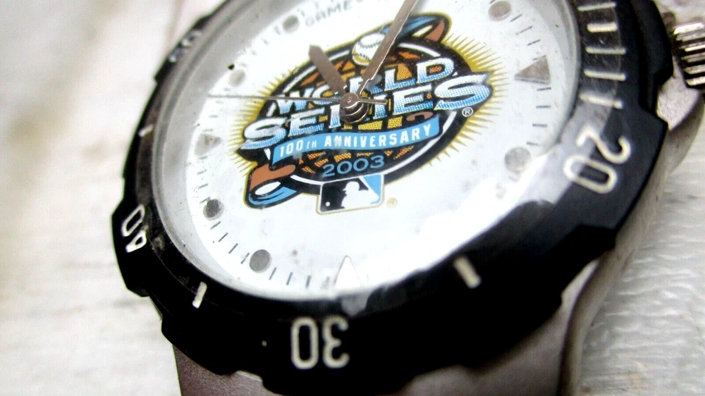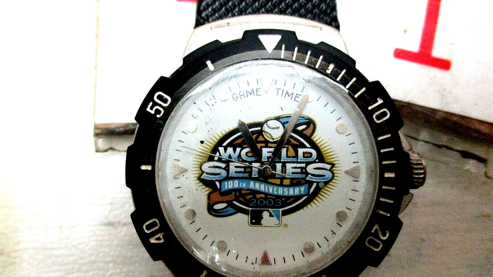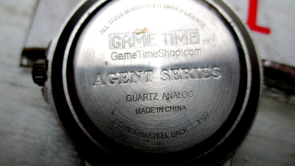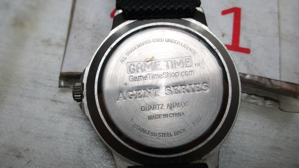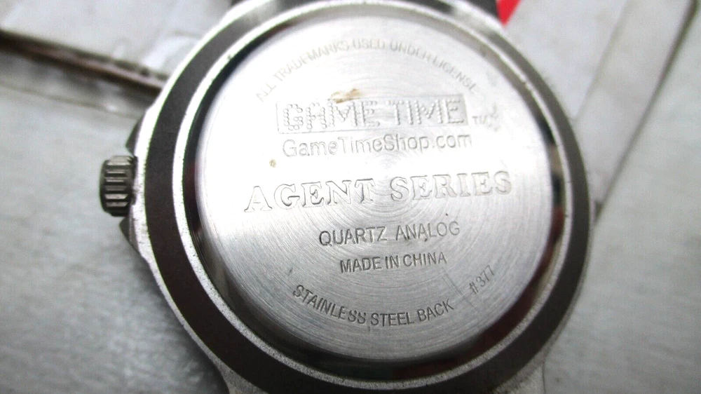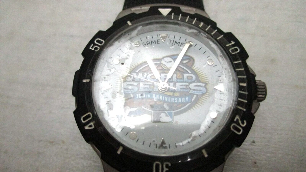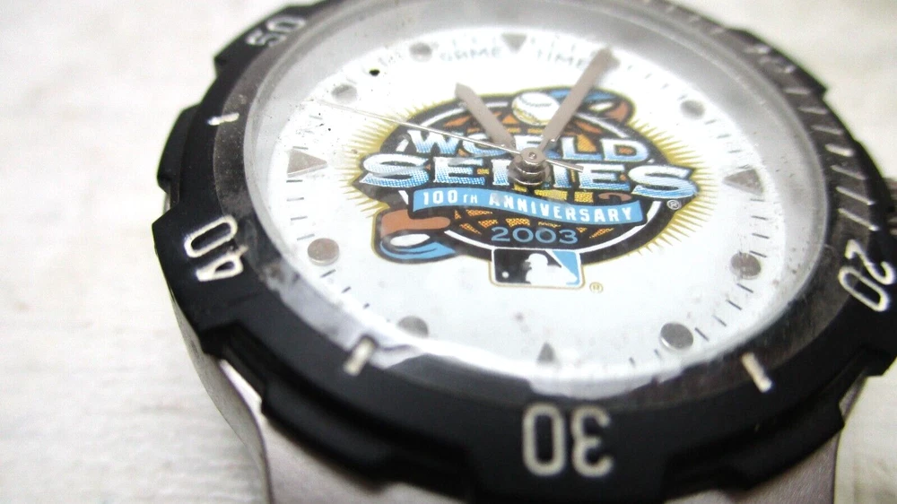 Men's 40mm Silver Tone Game Time Agent World Series 100th Anniversary Watch. I could not find any traces of use, with the film on the glass, the belt spike holes without damage looks like new to me. However, I marked the holes as used. Required battery installation. Good overall condition, the item may have some signs of cosmetic wear, but fully operational and functions as intended - see actual pictures for details. You will get exact same item what you see on LISTING PHOTOS. I accept return. Buyer pays return shipping. Please ask Questions before bidding or paying for item. Measure tape is not part of sale. Thank you for visiting my store.