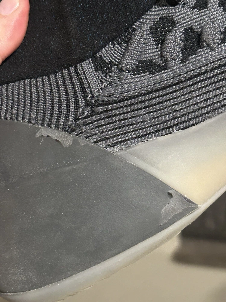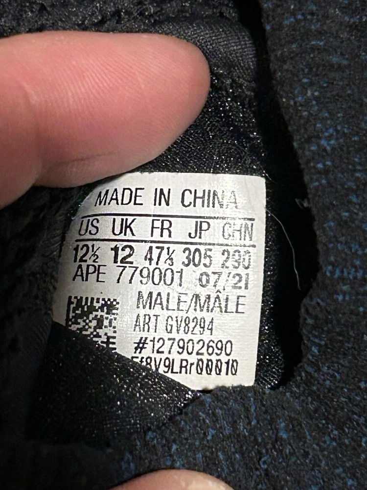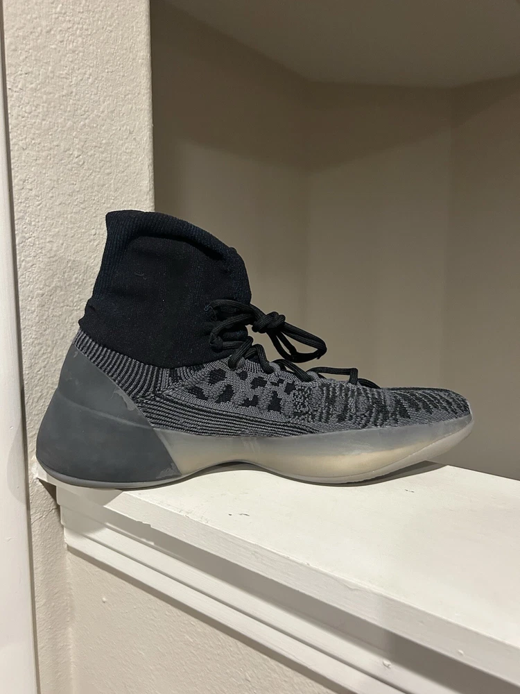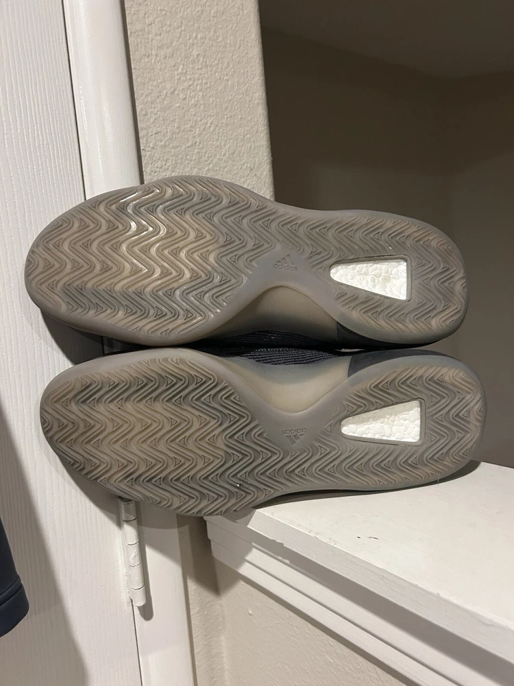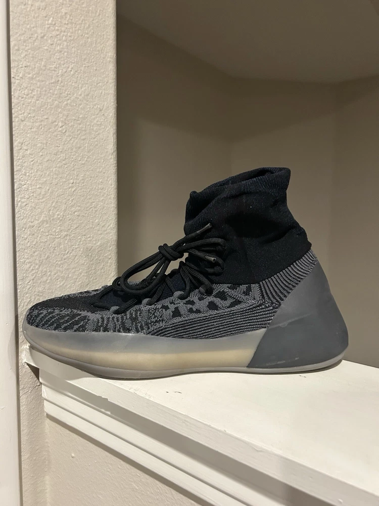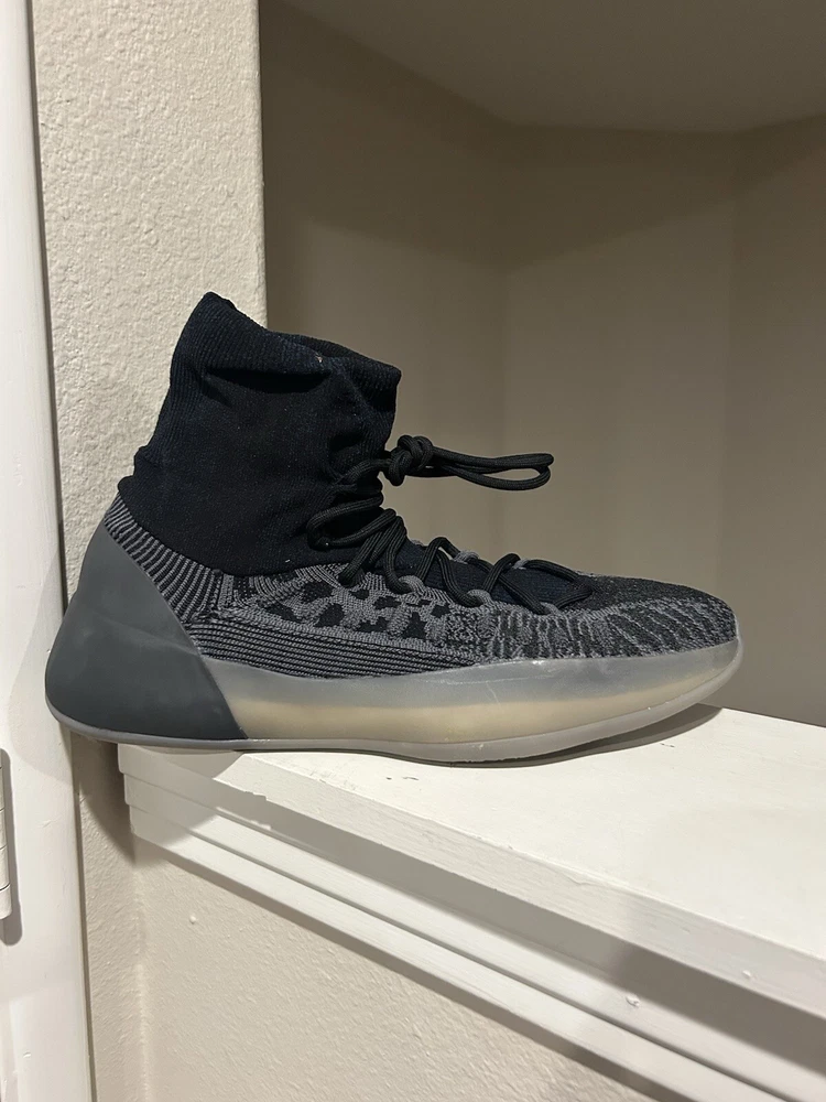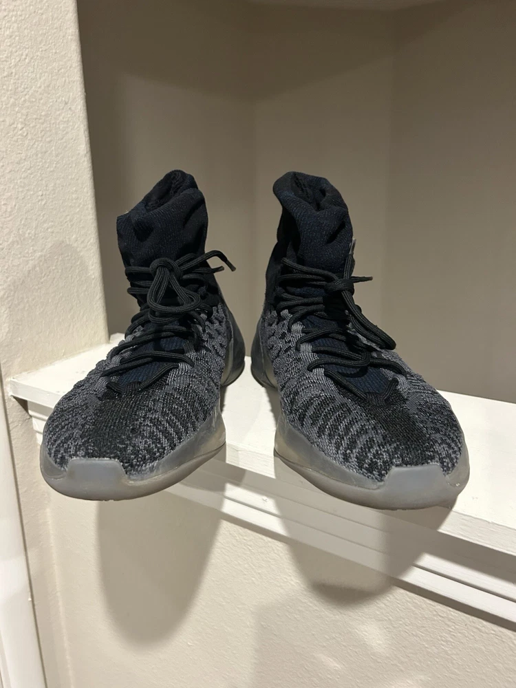 This is a men's adidas Yeezy basketball shoe in slate blue, featuring a high-top sneaker style with a lace-up closure. It is a size 12.5 with a standard shoe width. The shoe is made of Primeknit material and is designed for comfort and performance. The model is GV8294 from the adidas Yeezy product line, released in 2021.