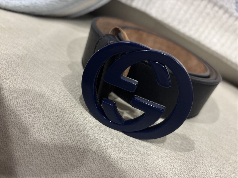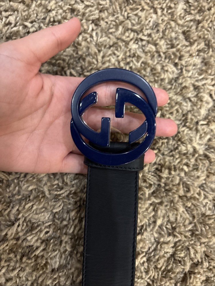 This is a men's Gucci belt in size 28, made of black and blue leather. It features a buckle with the Gucci logo and is designed as a dress belt. The belt is adjustable and was manufactured in Italy. The belt is black and the Gucci logo is blue.