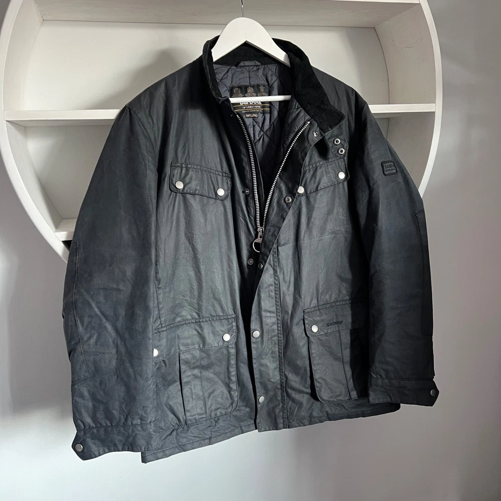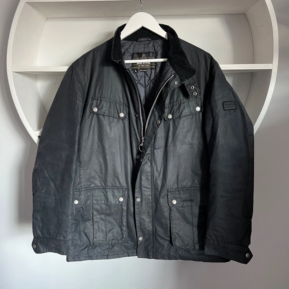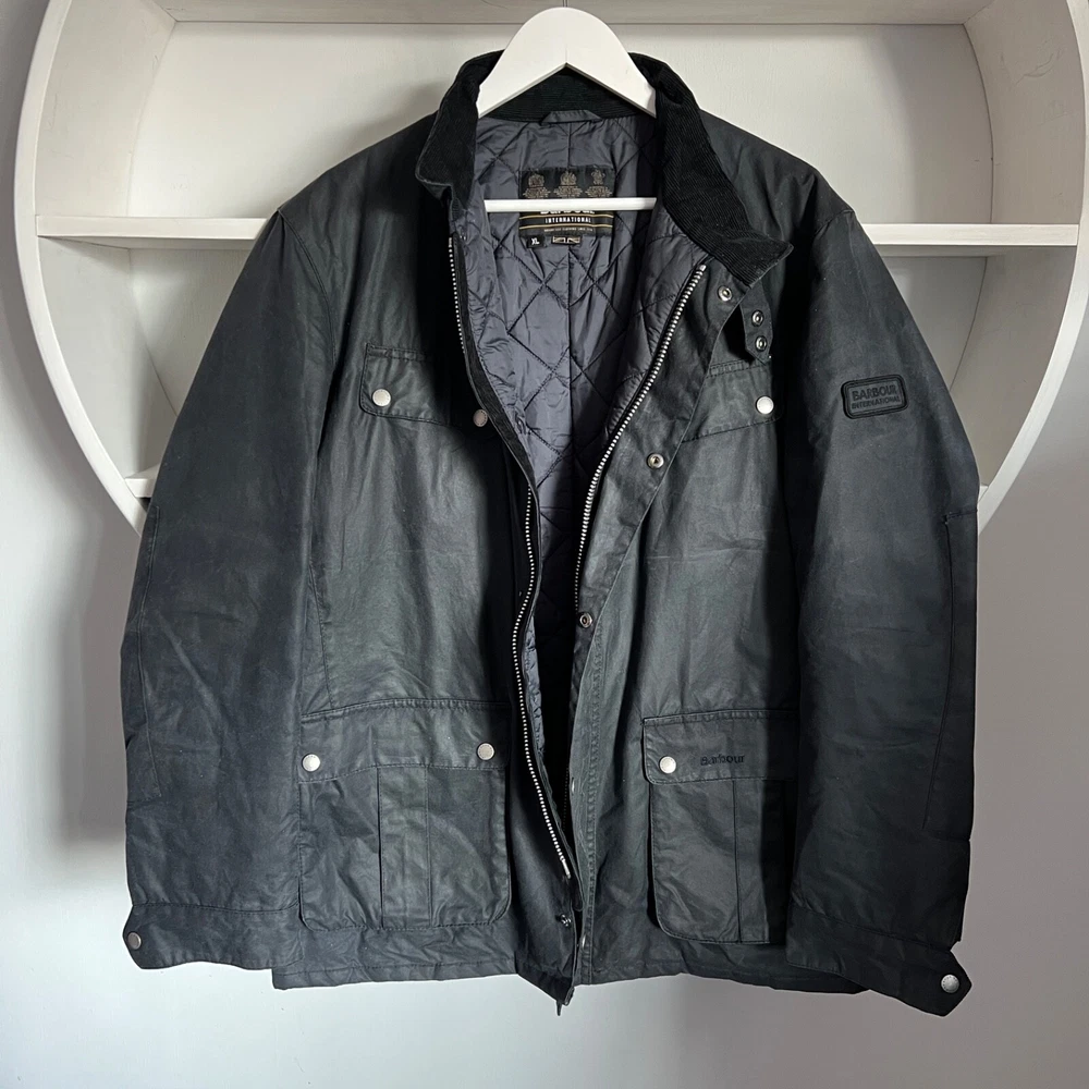 Men's BARBOUR INTERNATIONAL DUKE Waxed Cotton Navy Jacket Size XL Condition: excellent used condition, has small signs of wear, no defects Size: XL , but please check measurements below! Length back 75 cm / 29.5" Pit to pit 60 cm / 23.6" Shoulders 50 cm / 19.7" Sleeve length from shoulder 65.5 cm / 25.8" Feel free to ask any questions! Worldwide shipping with tracking from outside Ukraine, estimated time to US / UK / EU and other countries - from 15 to 25 days!