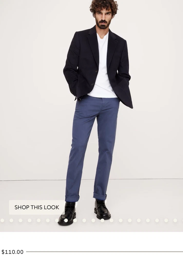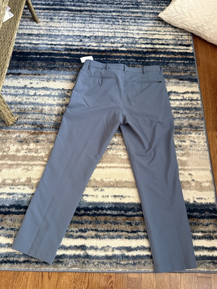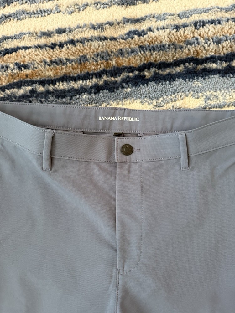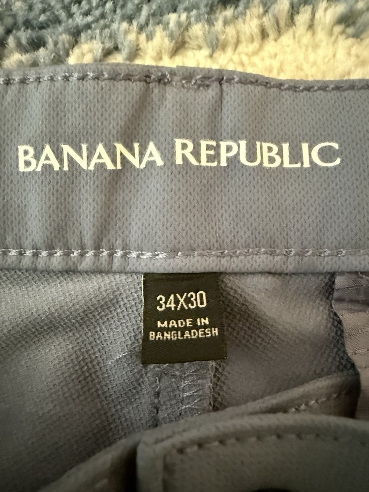 The product is a pair of Banana Republic dress pants in men's size 34x30 with a tailored fit. The pants are in a sleek blue color, making them suitable for formal and professional occasions. With a regular size type and designed specifically for men, these pants offer a stylish and sophisticated look for any dressy outfit.