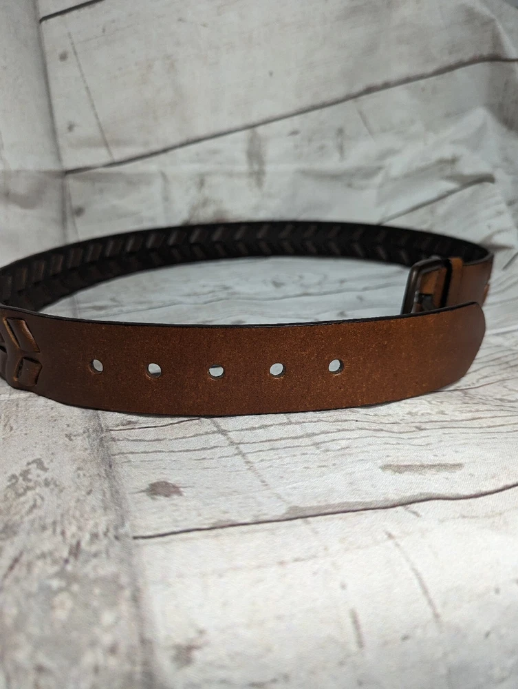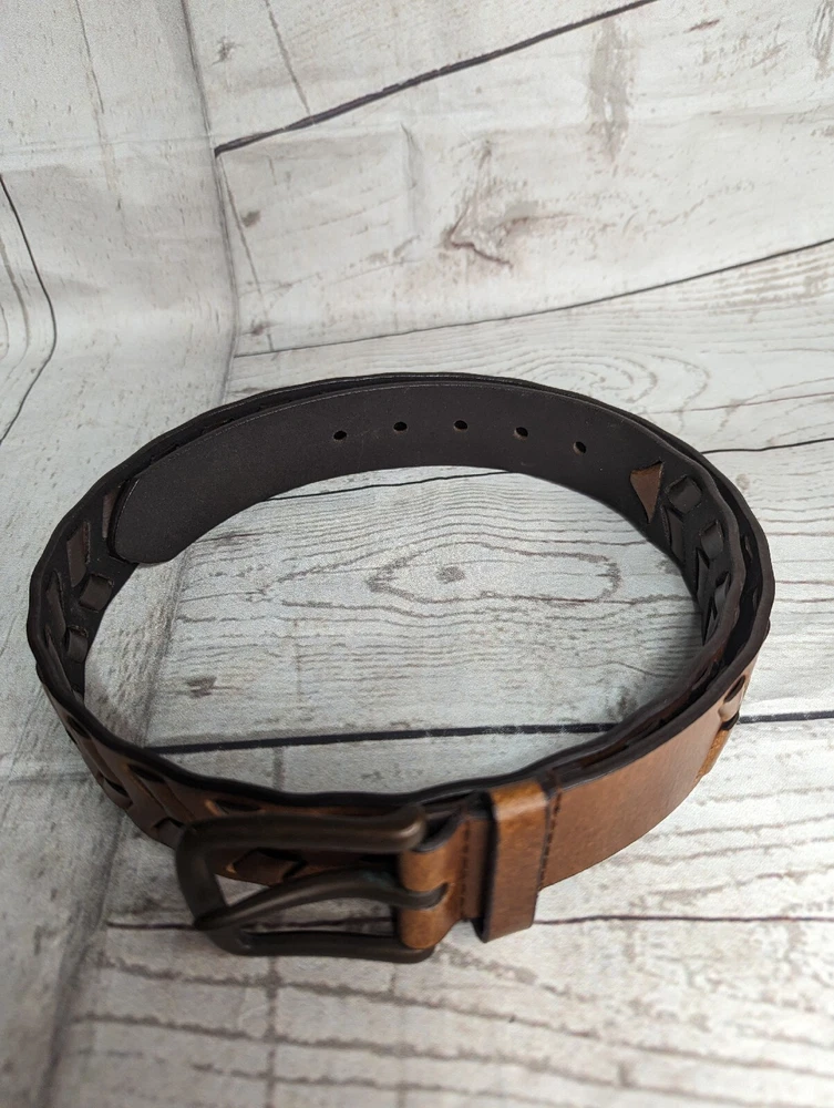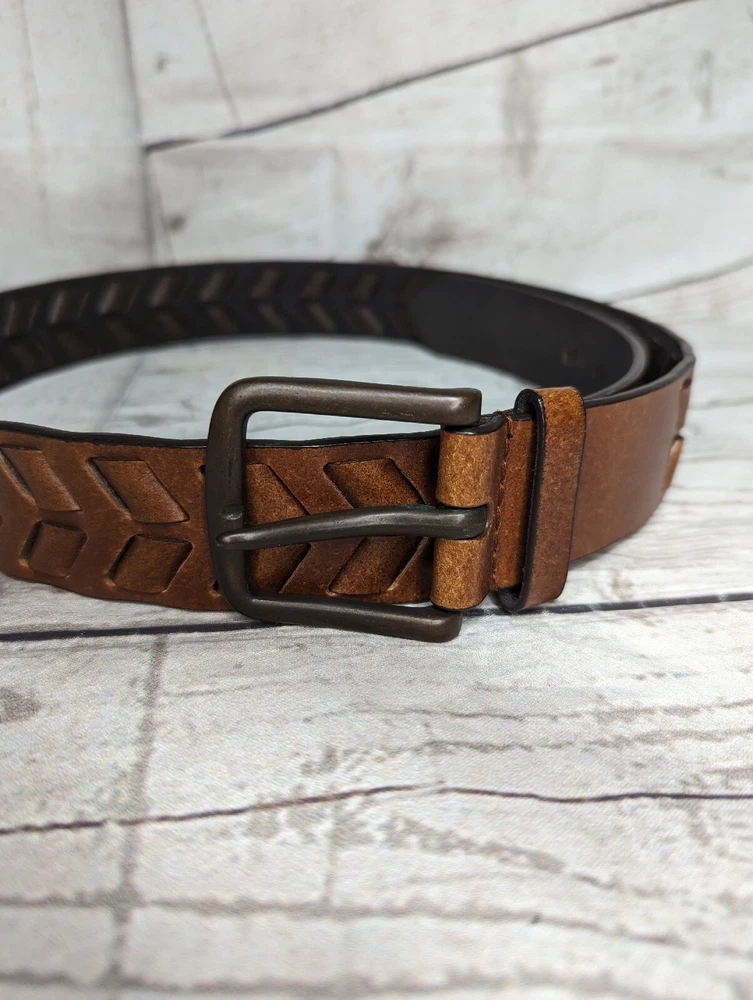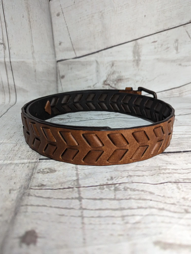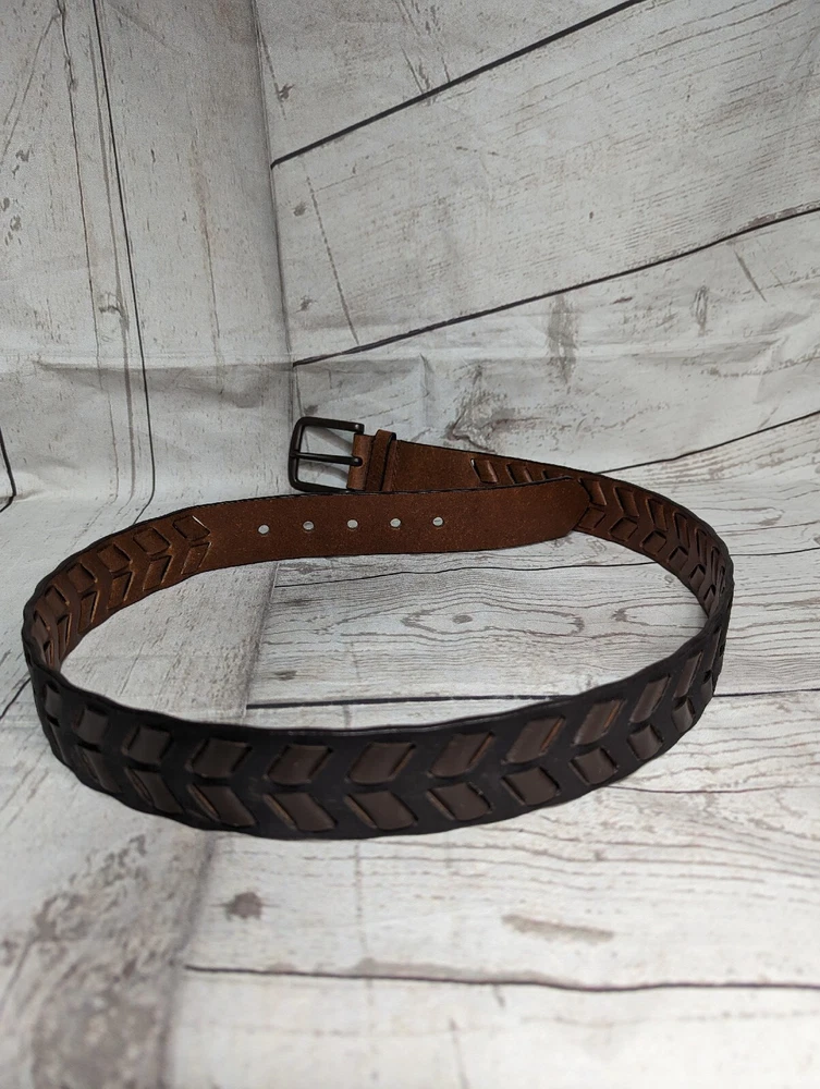 Men's Brown Faux Leather Woven Arrow Belt - Adjustable - Measures Approximately 44.5" L including buckle Good Pre-owned Condition
