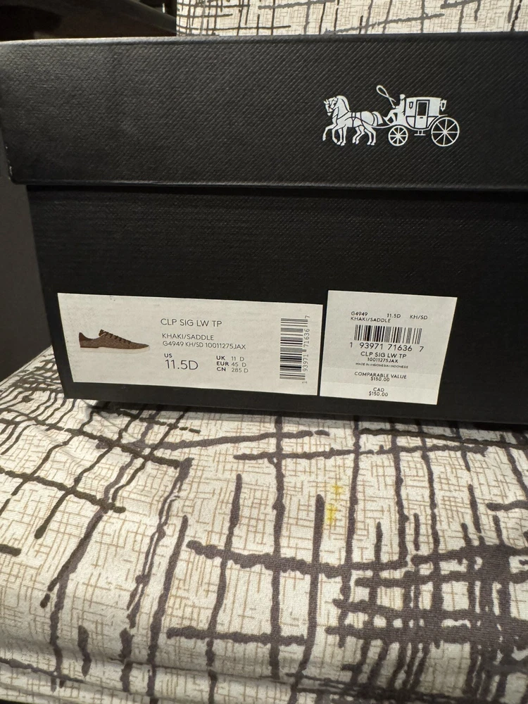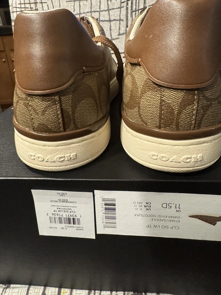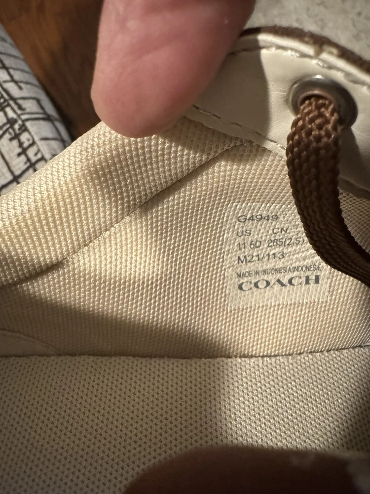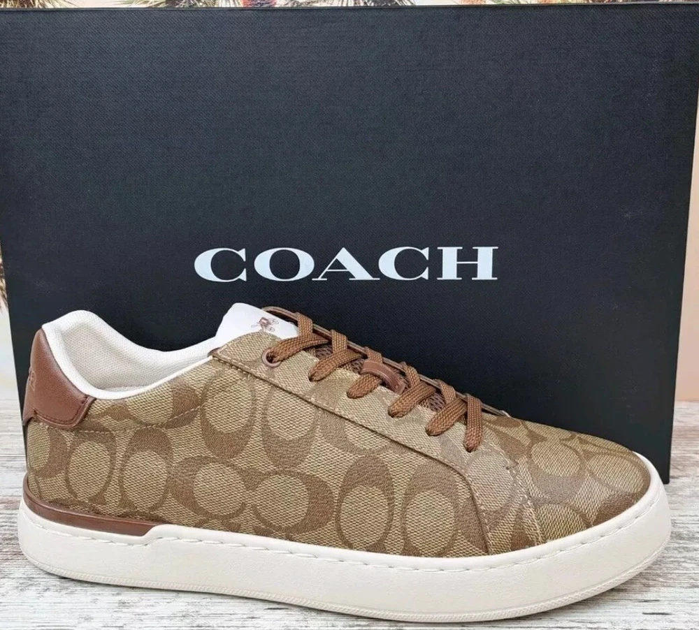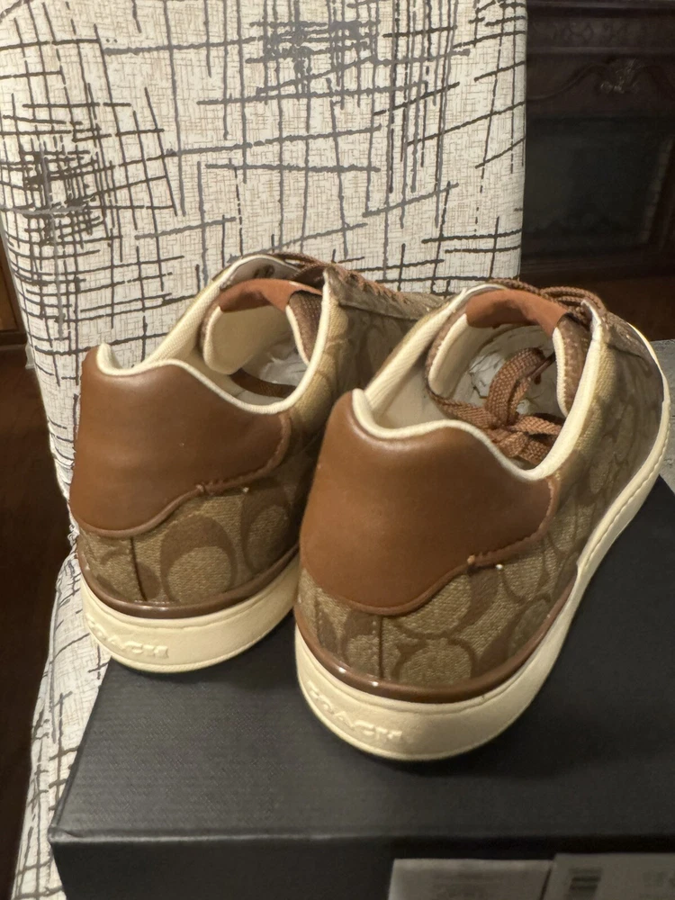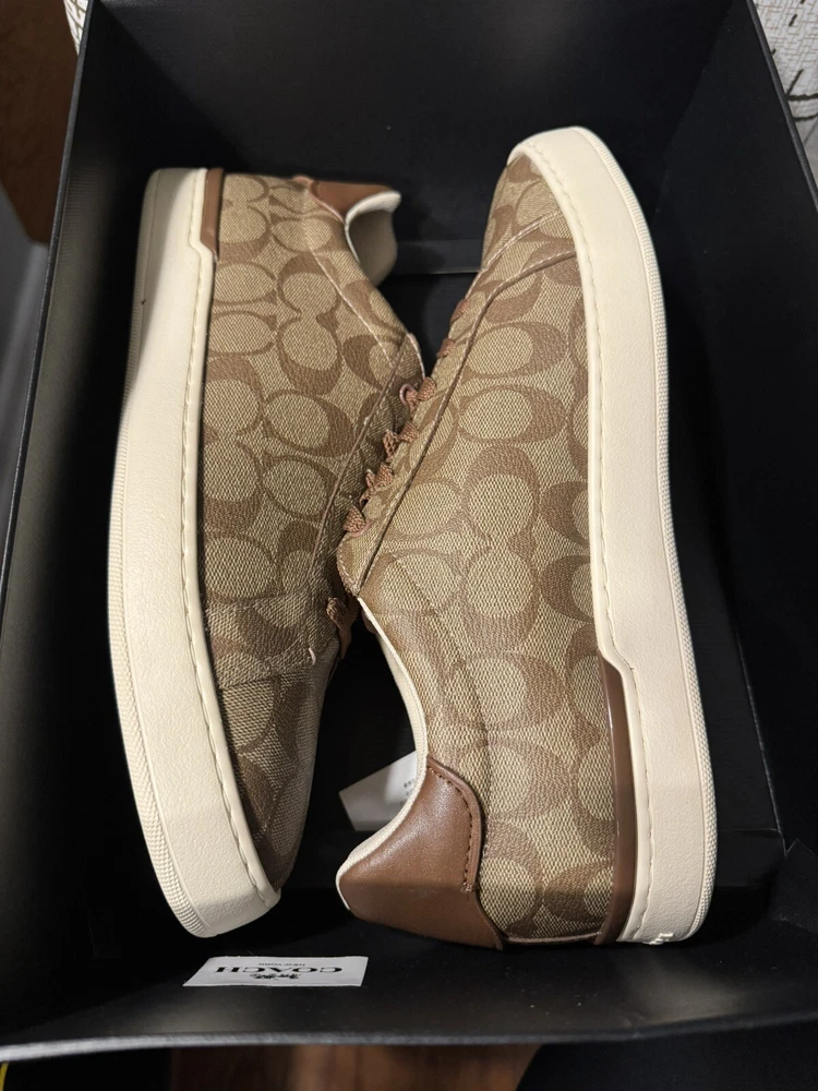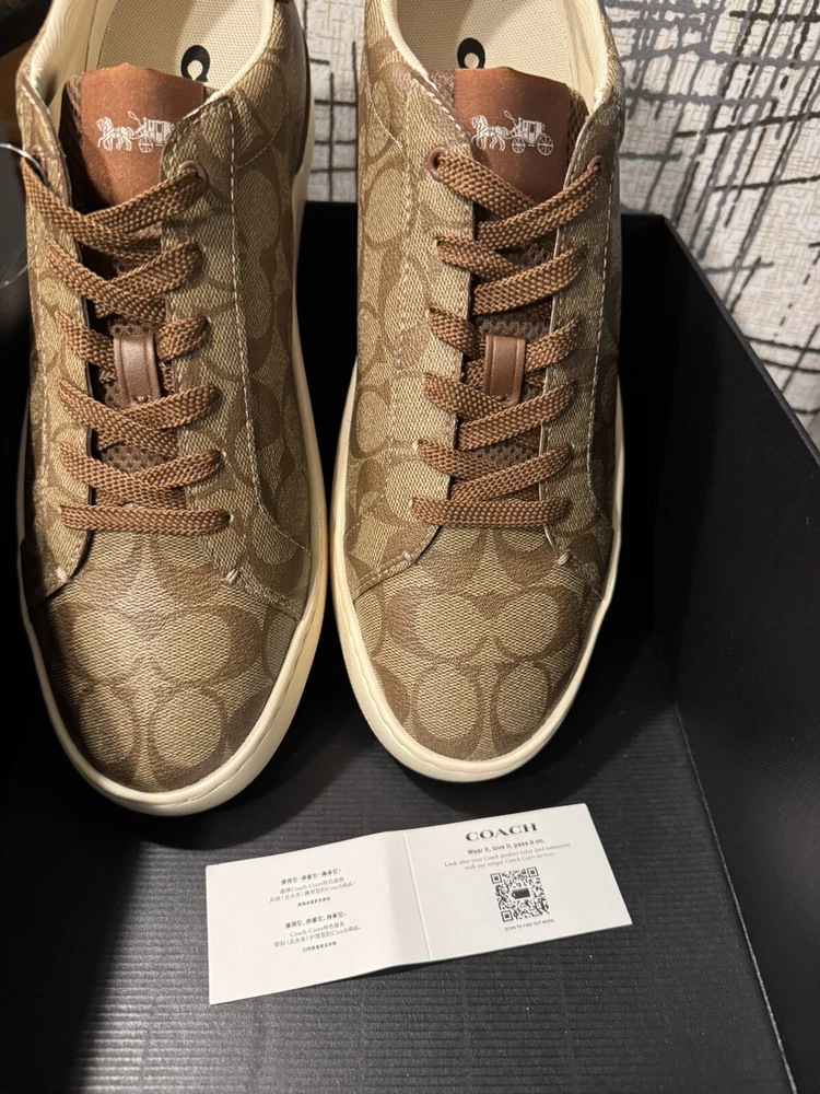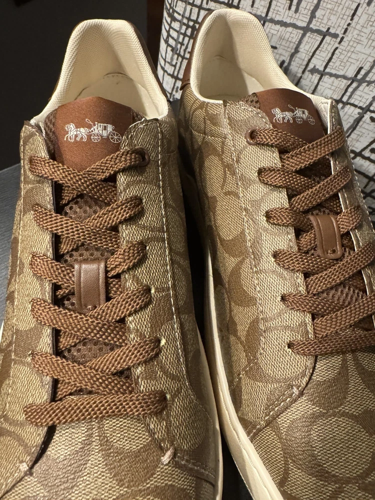 Mens COACH Signature Logo Coated Canvas Low Top G4949 Sneaker/ Shoe (Khaki/Saddle) Size 11.5 Coach Signature Logo Coated Canvas Sneakers DESCRIPTION Named for the bustling trail on New York City's West Side, our High Line sneaker combines sophisticated good looks with maximum comfort. Crafted of our Signature Logo print coated canvas and smooth leather, the low-top silhouette features a comfortable cushioned insole and a lightweight EVA outsole. feature: * Signature coated canvas and leather upper * Lace-up closure * Fabric lining and footbed * EVA outsole