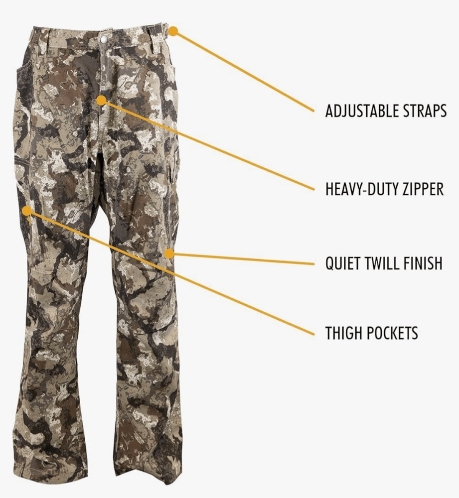 HOT SHOT Men’s Camo Performance Pant, Multi-Pocket Adjustable Waist Pants, Comfortable Year-Round Deer Hunting Gear for Men Size L Color Veil Cervidae Fabric type 57% Cotton, 41% Polyester, and 2% Spandex Origin Made in the USA or Imported Closure type Pull On Rise style High Rise About this item PERFORMANCE PANT: This Performance Pant by HOT SHOT utilizes 57% cotton, 41% polyester, and 2% spandex blend which is not only incredibly quiet but deters burrs from sticking. The gear is made with Realtree Edge camouflage to blend into your environment. DURABLE MATERIAL: This blend provides the ultimate durability without compromising on comfort and fit thanks to the slight amount of 4 way stretch as a result of the Lycra content. There is a loose fit in the legs to give you enough space to move. COMFORTABLE STRETCH FABRIC: Two-way stretch fabric was built into these 6 pocket pants for extra comfort and mobility. They also feature a vented crotch gusset and articulated knees