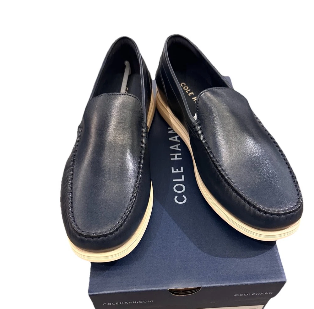 Men's Cole Haan Harwich Venetian loafers in a stylish navy blue and angora color combination. These slip-on dress shoes feature a solid pattern, round toe shape, leather upper and lining, with a lightweight and comfortable design. Ideal for going out in the city or a preppy look, these loafers have a cushioned insole, breathable outsole, and are suitable for all seasons.