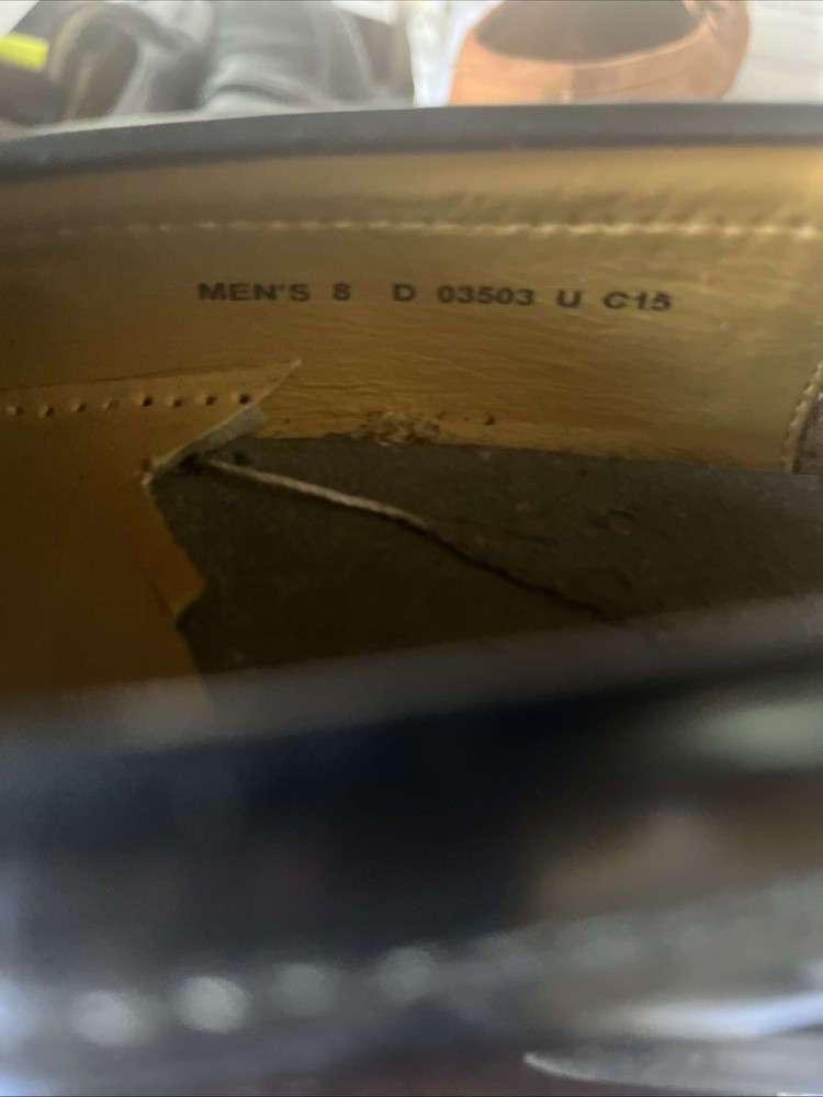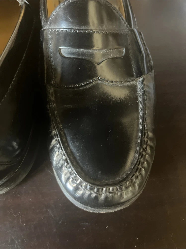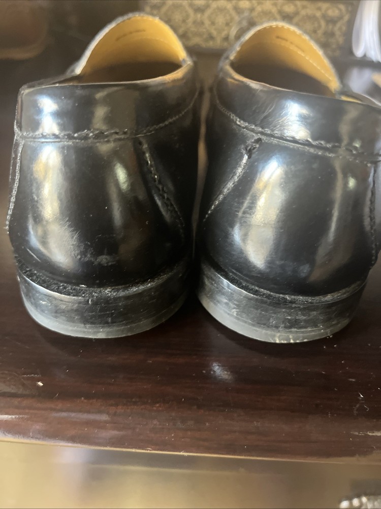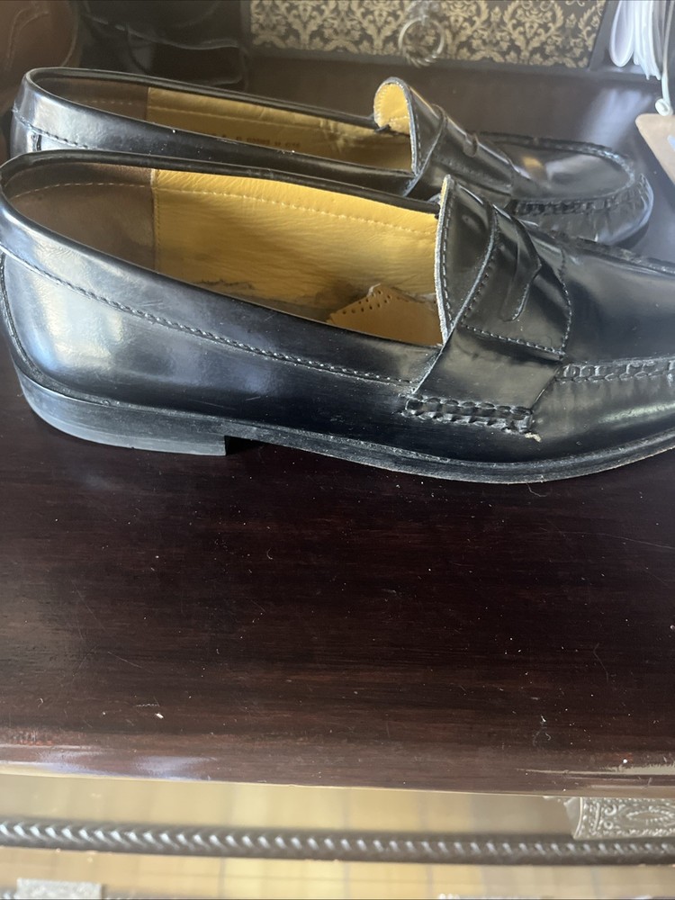 The product is a pair of Men’s Cole Haan Classic Black Penny Loafers in size 8D. These dress shoes are crafted from black leather with a D width and leather insole. The outsole is also leather, making them durable and stylish for any formal occasion. These loafers are part of the Cole Haan Pinch product line, combining classic design with modern comfort and quality. Ideal for those looking for a sophisticated and timeless addition to their wardrobe. These insoles were removed to accommodate orthotics. Otherwise they are in mint condition. If you utilize orthotics, these will be the perfect pair for you. Priced to sell!