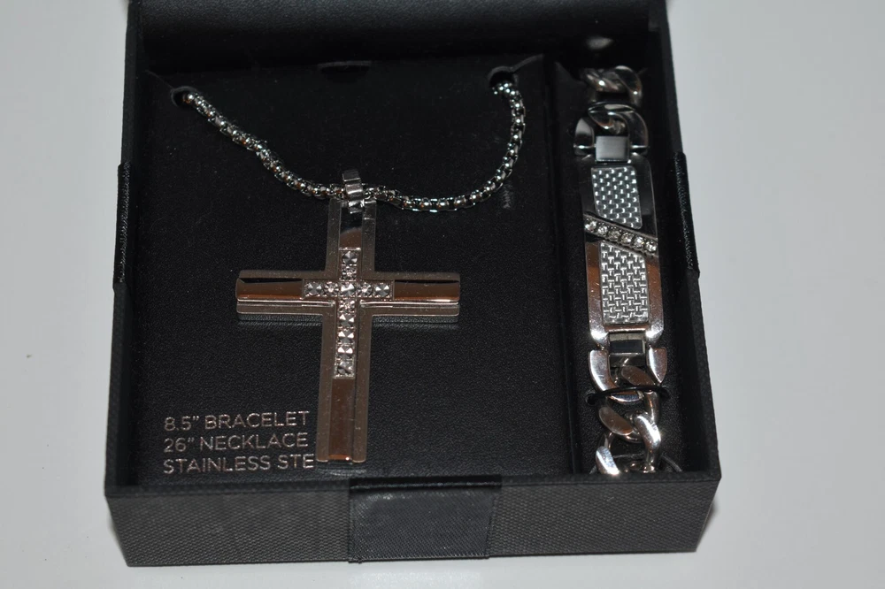 Men's Cubic Zirconia Stainless Steel Cross Necklace & Bracelet Set . Necklace has 26" chain with a cubic zirconia accented cross pendant. Cross pendant measures 2" by 1-1/8". Bracelet is 8-12" with cubic zirconia accents. New in box. Customer satisfaction is my # 1 Priority!! Please contact me if you are not satisfied with any aspect of your purchase before leaving any feedback. JB4