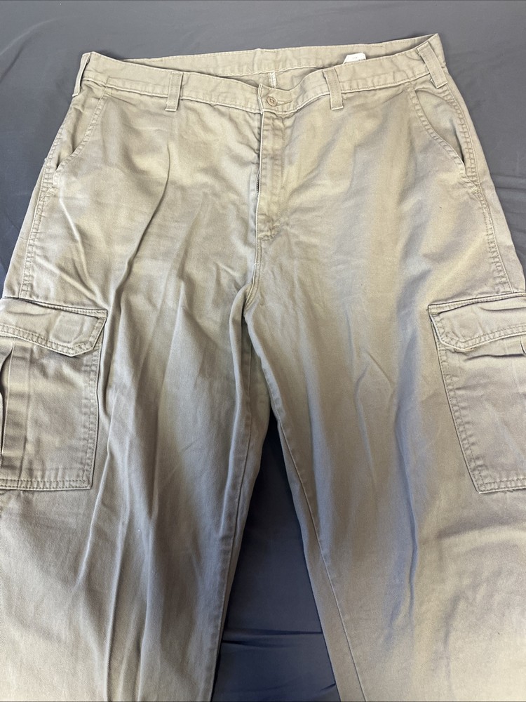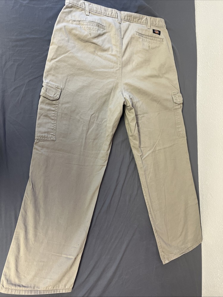 The Men's Cargo Work Pants by Dickies in beige are a versatile and durable option for various occasions. Made from a blend of polyester and cotton, these relaxed straight fit pants feature a mid-rise and a 32-inch inseam. They are adorned with cargo pockets and a logo accent, perfect for casual, workwear, or business settings. These wrinkle-resistant pants are easy to care for with machine washable fabric, making them a practical choice for year-round wear.