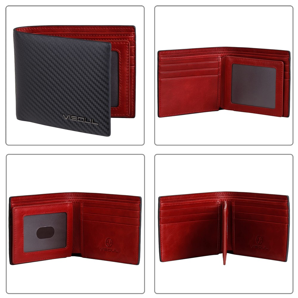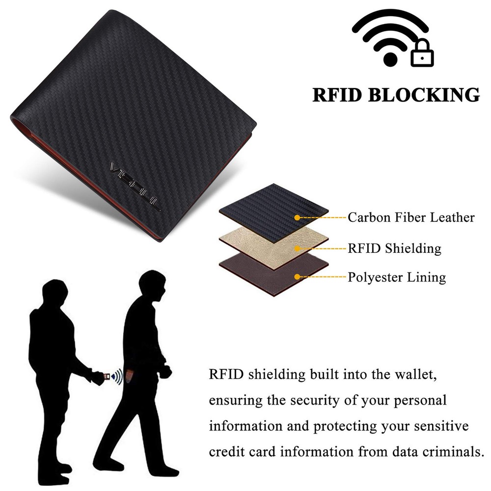 Carbon Fiber Leather and Cowhide: Carbon fiber leather outside and genuine cow leather inside; Carbon fiber leather, waterproof, high strength, fashionable looking and scratch-resistant; Genuine cow leather, even texture, soft, lightweight, durable, not easy to deformation; Simple looking design Tons of Compartments: 2 ID Card Flap, 6 Card Slots, 2 Cash Pockets, 2 Secret Slots; One big Clear ID pockets for your photo, one for drivers license; 6 standard-size credit card slots, it is easy to insert or take your cards; 2 cash pockets, keeping money separate from other things Designer Wallet for Men: Compact Size: 4.3 inches length, 3.6 inches width, you can put it in your back pocket; Contrast color design; Thumb slot on the ID window clear slot makes it easy to grab drivers license in a hurry; The 2 ID window pockets are made of semi-transparent style instead of transparent or mesh style, clear to see, anti fingerprints, not easy to scratch RFID Blocking Protection: RFID shielding built into the wallet, ensuring the security of your personal information; Protect your sensitive credit card information from criminals; RFID Blocking has been tested to extent and can be work in most cases, so you need take your card out when you use it What You Get: A leather bifold wallet; box packaging