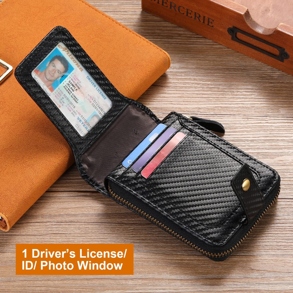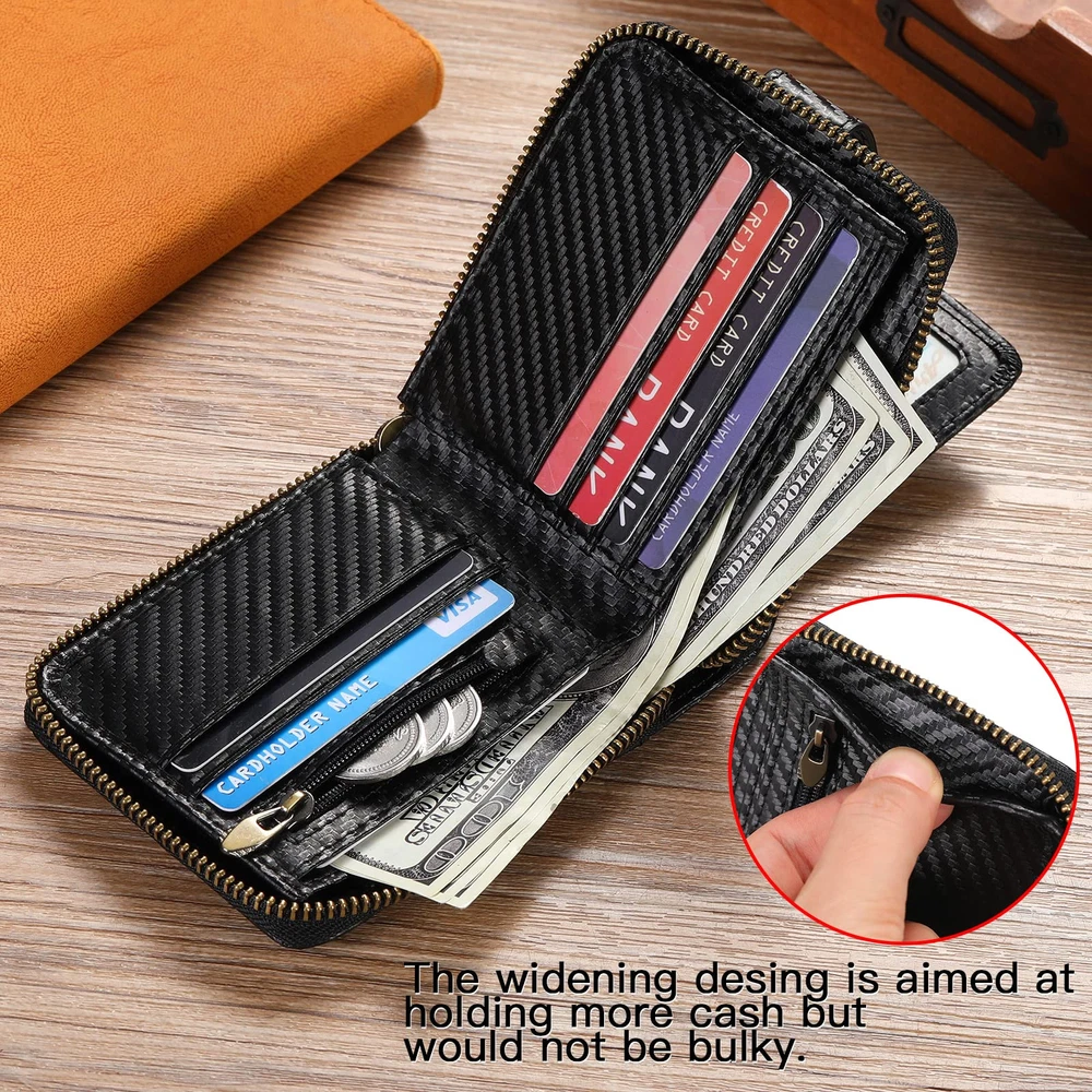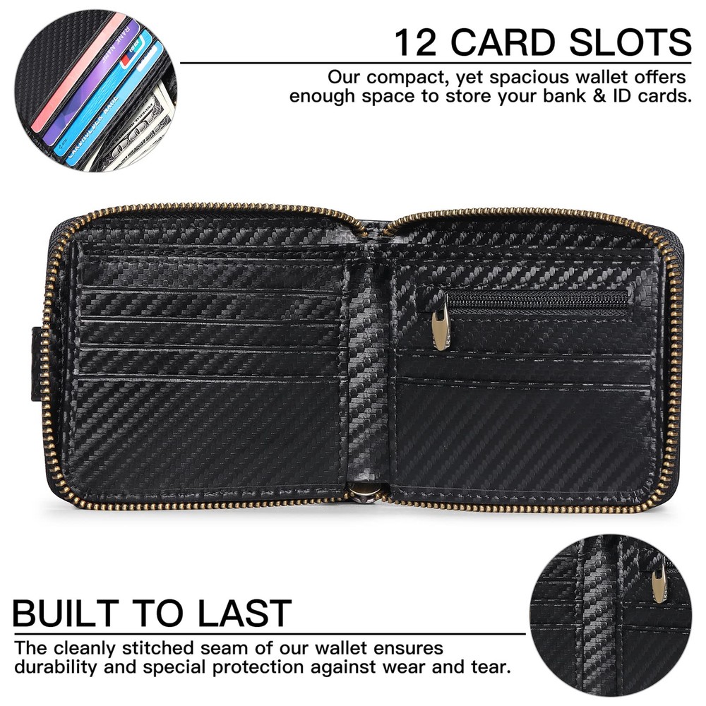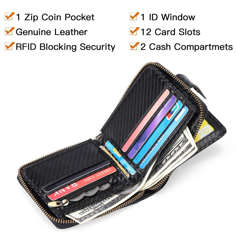 Men's Wallet with Zipper: Made of genuine leather, it has a smooth texture, soft and comfortable feel, and with age, it will become brighter and more tactile. Wrinkles, scars, or other subtle variations are characteristic of natural leather. Size for hand-held:This mens zipper wallets dimension: 5.12'' x 3.93'' x 1.2'' in , zipper wallet is easy to carry, just keep it in bag or trouser pocket. Wallet with Zipper: Large Capacity: 12 card slots + 2 cash compartments + 1 driver's license / ID/ photo window + 1 zip coin pocket. RFID Blocking: Our zipper wallet for men is equipped with blocking material, which blocks RFID signals and protects the private information stored on RFID chips from unauthorized scans. Quality & Function: The men's wallet zipper is made of strong brass and is strong to prevent items from falling, while being durable and stylish at the same time.