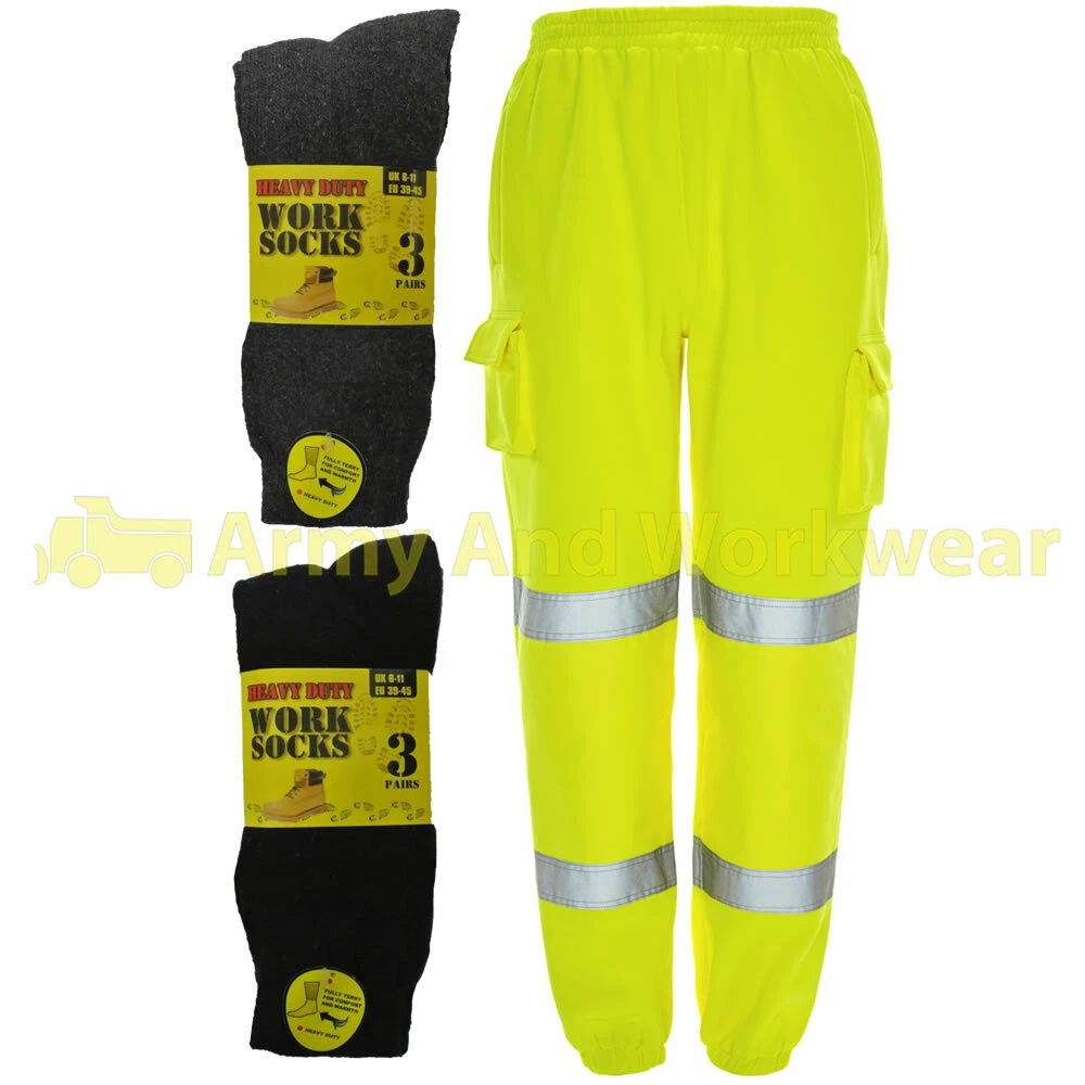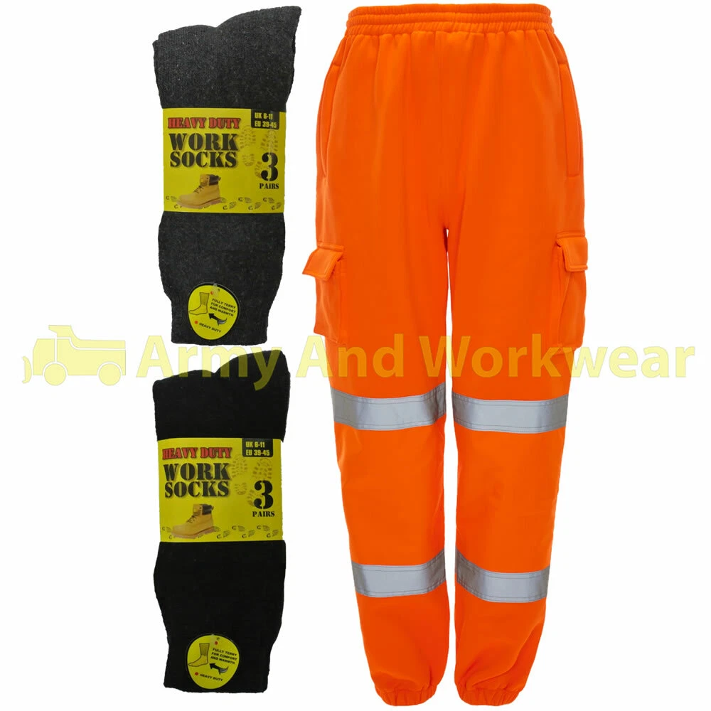 Mens High Visibility Jogging Bottoms + FREE SOCKS COLOURS Orange - GO/RT 3279 Rail Spec, EN471:2003 + A1:2007 Class 1 Yellow - EN471:2003 + A1:2007 Class 1 Black - Corporate/security colours SPEC - HI VIZ COLOURS Quality work jogging pants EC type CE approved EN471:2003 + A1:2007 Class 1 Retro reflective tape Two zipped hand warmer pockets One back pocket with Velcro flap One side phone pocket with Velcro flap One side Combat leg pocket with Velcro flap Thick elasticated waist & bottom hem Reinforced oxford fabric on knee area Fleece back sweatshirt fabric Adjustable draw cord waist 100% Polyester Condition: Brand New Machine washable Enhances your safety at nights and in low visibility situations SPEC - SECURITY COLOURS Quality work jogging pants Retro reflective tape Two zipped hand warmer pockets One back pocket with Velcro flap One side phone pocket with Velcro flap One side Combat leg pocket with Velcro flap Thick elasticated waist & bottom hem Reinforced oxford fabric on knee area Fleece back sweatshirt fabric Reinforced oxford fabric on knee area Adjustable draw cord waist 100% Polyester Condition: Brand New Machine washable Enhances your safety at nights and in low visibility situations SIZE HV Cuffed Joggers at Army and workwear SIZE WAIST INSIDE LEG LENGTH S 30 -34 30 M 32 -36 30 L 34 -38 30 XL 36 -40 30 2XL 38 -42 31 3XL 40 -44 31 High Visibility Jogging Bottoms + FREE SOCKS Orange - GO/RT 3279 Rail Spec, EN471:2003 + A1:2007 Class 1 Yellow - EN471:2003 + A1:2007 Class 1 Black - Corporate/security colours EN471:2003 + A1:2007 Class 1 One back pocket with Velcro flap One side phone pocket with Velcro flap One side Combat leg pocket with Velcro flap Thick elasticated waist & bottom hem Reinforced oxford fabric on Fleece back sweatshirt fabric Enhances your safety at nights and in low visibility situations One back pocket with Velcro flap One side phone pocket with Velcro flap One side Combat leg pocket with Velcro flap Thick elasticated waist & bottom hem Reinforced oxford fabric on Fleece back sweatshirt fabric Reinforced oxford fabric on Enhances your safety at nights and in low visibility situations HV Cuffed J