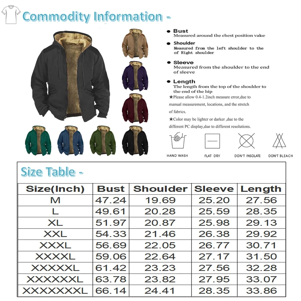 Men\\'s Solid Color Jacket Men\\'s Spring And Autumn Casual Trend Zipper Hooded Jacket Please check the Size Chart before order. If you are not sure the size, please send message to us. Features: 1 .It is made of high quality materials, enought for your daily wearing. 2.Stylish and fashion design make you more attractive. 3.Great for Daily,Casual,I am sure you will like it! 4. Wearing it will make you look more handsome. Product information: Gender:Men Occasion:Daily,Casual Sleeve Length:Long Style:Casual,Fashion Fit:Fits ture to size How to wash:Hand wash Cold,Hang or Line Dry What you get:1 PC Men Coat Size Bust Shoulder Sleeve Length M 120cm/47.24\\'\\' 50cm/19.69\\'\\' 64cm/25.20\\'\\' 70cm/27.56\\'\\' L 126cm/49.61\\'\\' 51.5cm/20.28\\'\\' 65cm/25.59\\'\\' 72cm/28.35\\'\\' XL 132cm/51.97\\'\\' 53cm/20.87\\'\\' 66cm/25.98\\'\\' 74cm/29.13\\'\\' XXL 138cm/54.33\\'\\' 54.5cm/21.46\\'\\' 67cm/26.38\\'\\' 76cm/29.92\\'\\' XXXL 144cm/56.69\\'\\' 56cm/22.05\\'\\' 68cm/26.77\\'\\' 78cm/30.71\\'\\' XXXXL 150cm/59.06\\'\\' 57.5cm/22.64\\'\\' 69cm/27.17\\'\\' 80cm/31.50\\'\\' XXXXXL 156cm/61.42\\'\\' 59cm/23.23\\'\\' 70cm/27.56\\'\\' 82cm/32.28\\'\\' XXXXXXL 162cm/63.78\\'\\' 60.5cm/23.82\\'\\' 71cm/27.95\\'\\' 84cm/33.07\\'\\' XXXXXXXL 168cm/66.14\\'\\' 62cm/24.41\\'\\' 72cm/28.35\\'\\' 86cm/33.86\\'\\' Size:M Bust:120cm/47.24\\'\\' Shoulder:50cm/19.69\\'\\' Sleeve:64cm/25.20\\'\\' Length:70cm/27.56\\'\\' Size:L Bust:126cm/49.61\\'\\' Shoulder:51.5cm/20.28\\'\\' Sleeve:65cm/25.59\\'\\' Length:72cm/28.35\\'\\' Size:XL Bust:132cm/51.97\\'\\' Shoulder:53cm/20.87\\'\\' Sleeve:66cm/25.98\\'\\' Length:74cm/29.13\\'\\' Size:XXL Bust:138cm/54.33\\'\\' Shoulder:54.5cm/21.46\\'\\' Sleeve:67cm/26.38\\'\\' Length:76cm/29.92\\'\\' Size:XXXL Bust:144cm/56.69\\'\\' Shoulder:56cm/22.05\\'\\' Sleeve:68cm/26.77\\'\\' Length:78cm/30.71\\'\\' Size:XXXXL Bust:150cm/59.06\\'\\' Shoulder:57.5cm/22.64\\'\\' Sleeve:69cm/27.17\\'\\' Length:80cm/31.50\\'\\' Size:XXXXXL Bust:156cm/61.42\\'\\' Shoulder:59cm/23.23\\'\\' Sleeve:70cm/27.56\\'\\' Length:82cm/32.28\\'\\' Size:XXXXXXL Bust:162cm/63.78\\'\\' Shoulder:60.5cm/23.82\\'\\' Sleeve:71cm/27.95\\'\\' Length:84cm/33.07\\'\\' Size:XXXXXXXL Bust:168cm/66.14\\'\\' Shoulder:62cm/24.41\\'\\' Sleeve:72cm/28.35\\'\\' Length:86cm/33.86\\'\\'