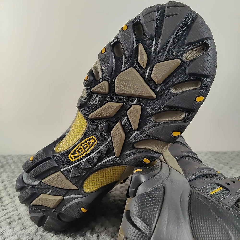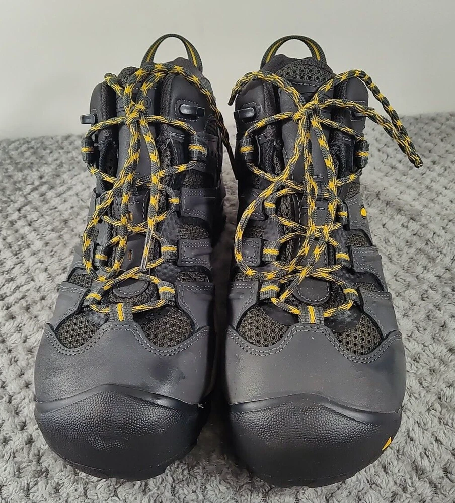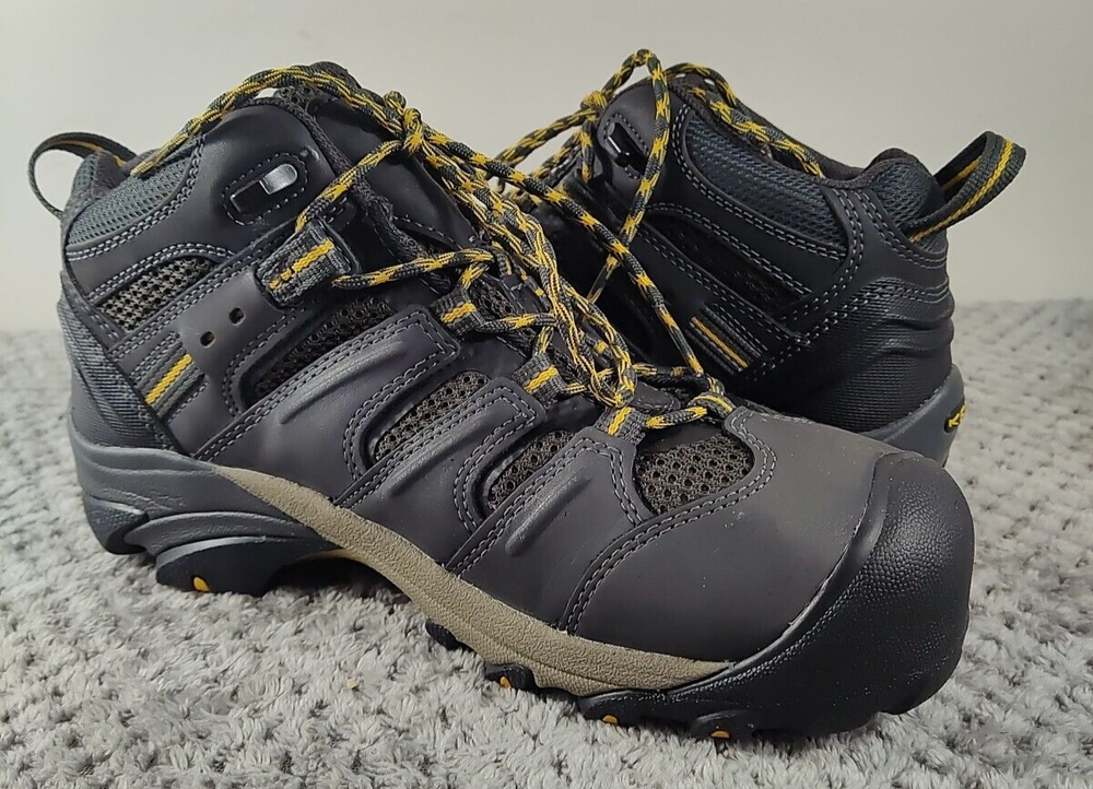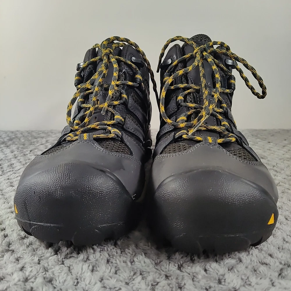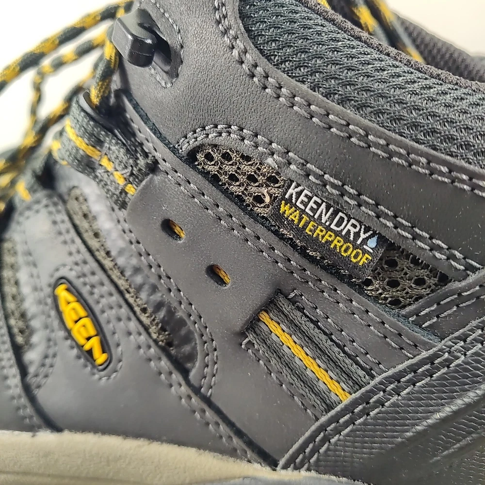 KEEN Utility Lansing Mid Waterproof Steel Toe Work Boots for Men Raven/Tawny Olive Size 8.5M Packed with performance features, KEEN Utility® Lansing Mid Waterproof Steel Toe Work Boots for Men deliver all-day comfort, support, and stability on the job. The Lansing Mid's supportive waterproof leather uppers protect and support feet all-day long, while the moisture-wicking linings and KEEN.DRY waterproof/breathable membrane technology inside keep feet dry and comfortable through all conditions. Anatomically correct, asymmetrical steel toes offer ASTM F2412-18 and F2413-18 M I/75 C/75 EH-rated protection at the jobsite with a roomier, more comfortable toe box than standard safety toe designs. Removable, long-lasting polyurethane footbeds with enhanced arch support offer cushioned comfort, boosted by the shock absorbing performance of the Lansing Mid's CMEVA midsoles. Lightweight torsional stability shanks boost support through the midfoot area and stabilize the boot over uneven surfaces. Non-marking, oil- and slip-resistant rubber outsoles meet ASTM F1677-96 MARK II and F2913-19 SATRA Non-Slip testing standards. Average height: 4". Average Weight: 23.1 oz. Waterproof and comfortable steel toe work boots Waterproof leather uppers Moisture-wicking textile linings KEEN.DRY waterproof /breathable membrane technology Anatomically correct, asymmetrical steel toes - meet ASTM F2412-18 and F2413-18 M I/75 C/75 EH standards Removable, long-lasting polyurethane footbeds with enhanced arch support Lightweight, shock absorbing CMEVA midsoles Lightweight torsional stability shanks - boost mid-foot support and stability Oil- and slip-resistant, non-marking rubber outsoles Meet ASTM F1677-96 MARK II and F2913-19 SATRA Non-Slip testing standards Reflective webbing from toe to heel adds visibility