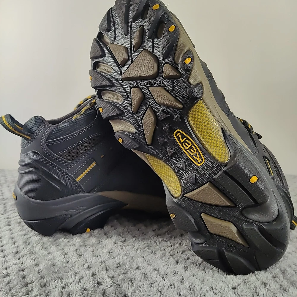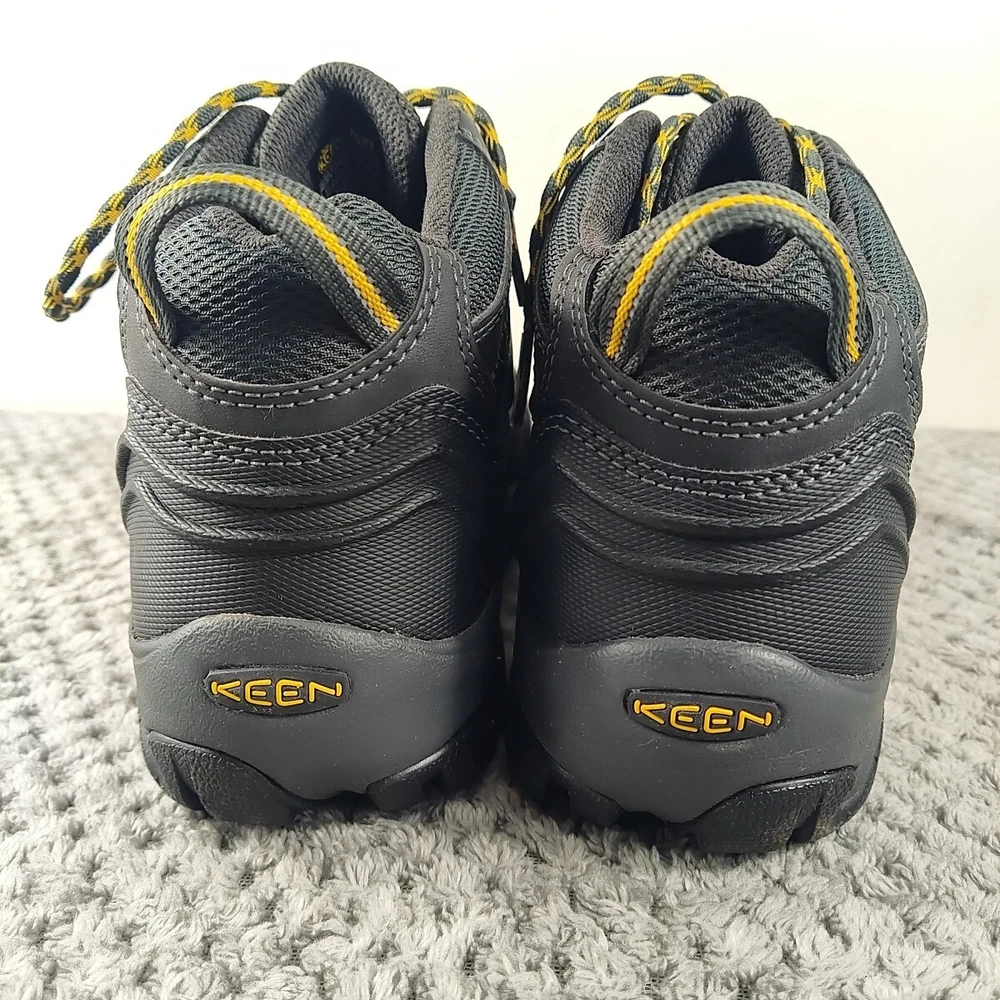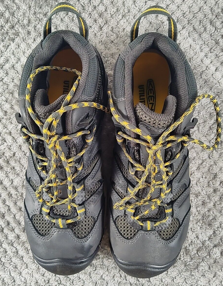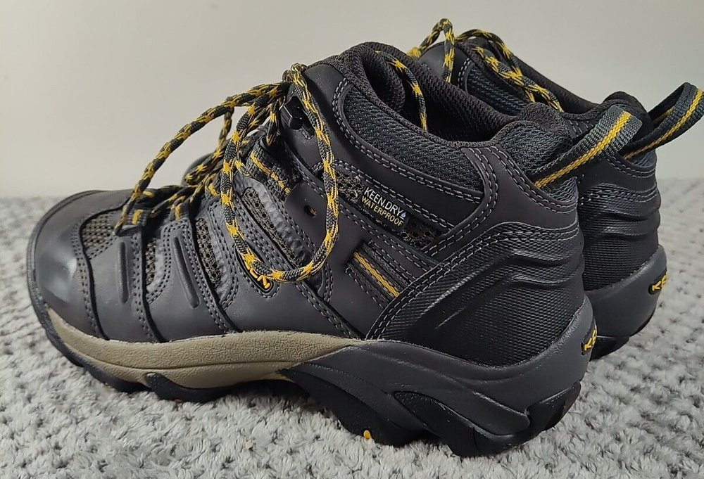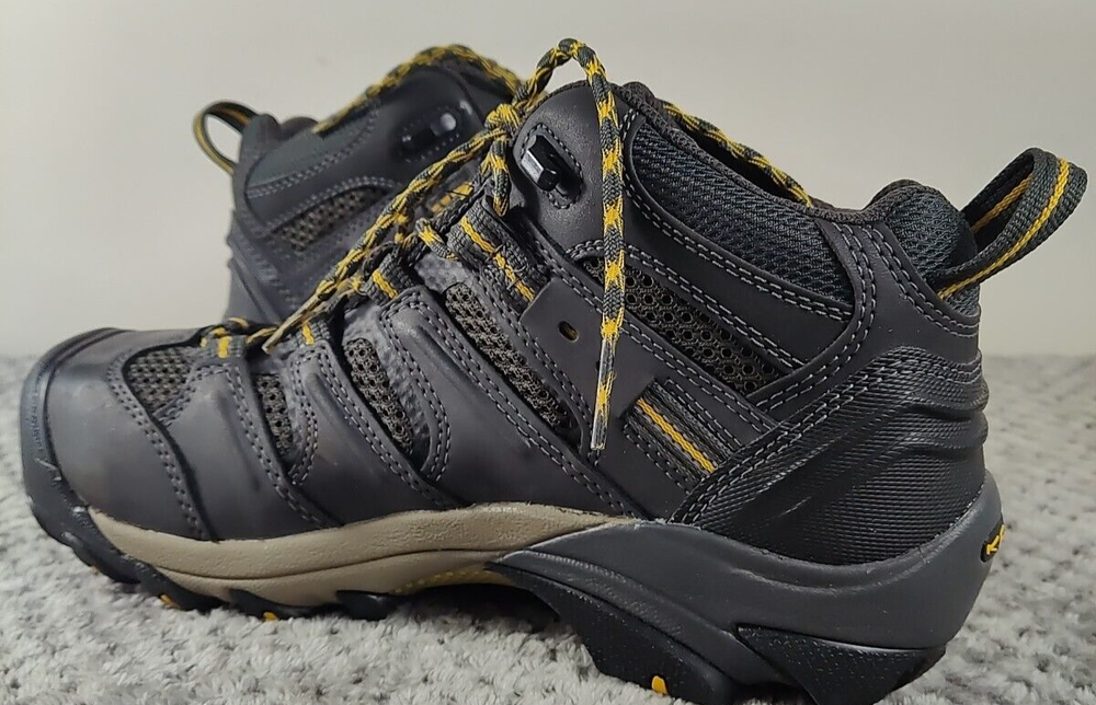 KEEN Utility Lansing Mid Waterproof Steel Toe Work Boots for Men Raven/Tawny Olive Size 8.5M Packed with performance features, KEEN Utility® Lansing Mid Waterproof Steel Toe Work Boots for Men deliver all-day comfort, support, and stability on the job. The Lansing Mid's supportive waterproof leather uppers protect and support feet all-day long, while the moisture-wicking linings and KEEN.DRY waterproof/breathable membrane technology inside keep feet dry and comfortable through all conditions. Anatomically correct, asymmetrical steel toes offer ASTM F2412-18 and F2413-18 M I/75 C/75 EH-rated protection at the jobsite with a roomier, more comfortable toe box than standard safety toe designs. Removable, long-lasting polyurethane footbeds with enhanced arch support offer cushioned comfort, boosted by the shock absorbing performance of the Lansing Mid's CMEVA midsoles. Lightweight torsional stability shanks boost support through the midfoot area and stabilize the boot over uneven surfaces. Non-marking, oil- and slip-resistant rubber outsoles meet ASTM F1677-96 MARK II and F2913-19 SATRA Non-Slip testing standards. Average height: 4". Average Weight: 23.1 oz. Waterproof and comfortable steel toe work boots Waterproof leather uppers Moisture-wicking textile linings KEEN.DRY waterproof /breathable membrane technology Anatomically correct, asymmetrical steel toes - meet ASTM F2412-18 and F2413-18 M I/75 C/75 EH standards Removable, long-lasting polyurethane footbeds with enhanced arch support Lightweight, shock absorbing CMEVA midsoles Lightweight torsional stability shanks - boost mid-foot support and stability Oil- and slip-resistant, non-marking rubber outsoles Meet ASTM F1677-96 MARK II and F2913-19 SATRA Non-Slip testing standards Reflective webbing from toe to heel adds visibility