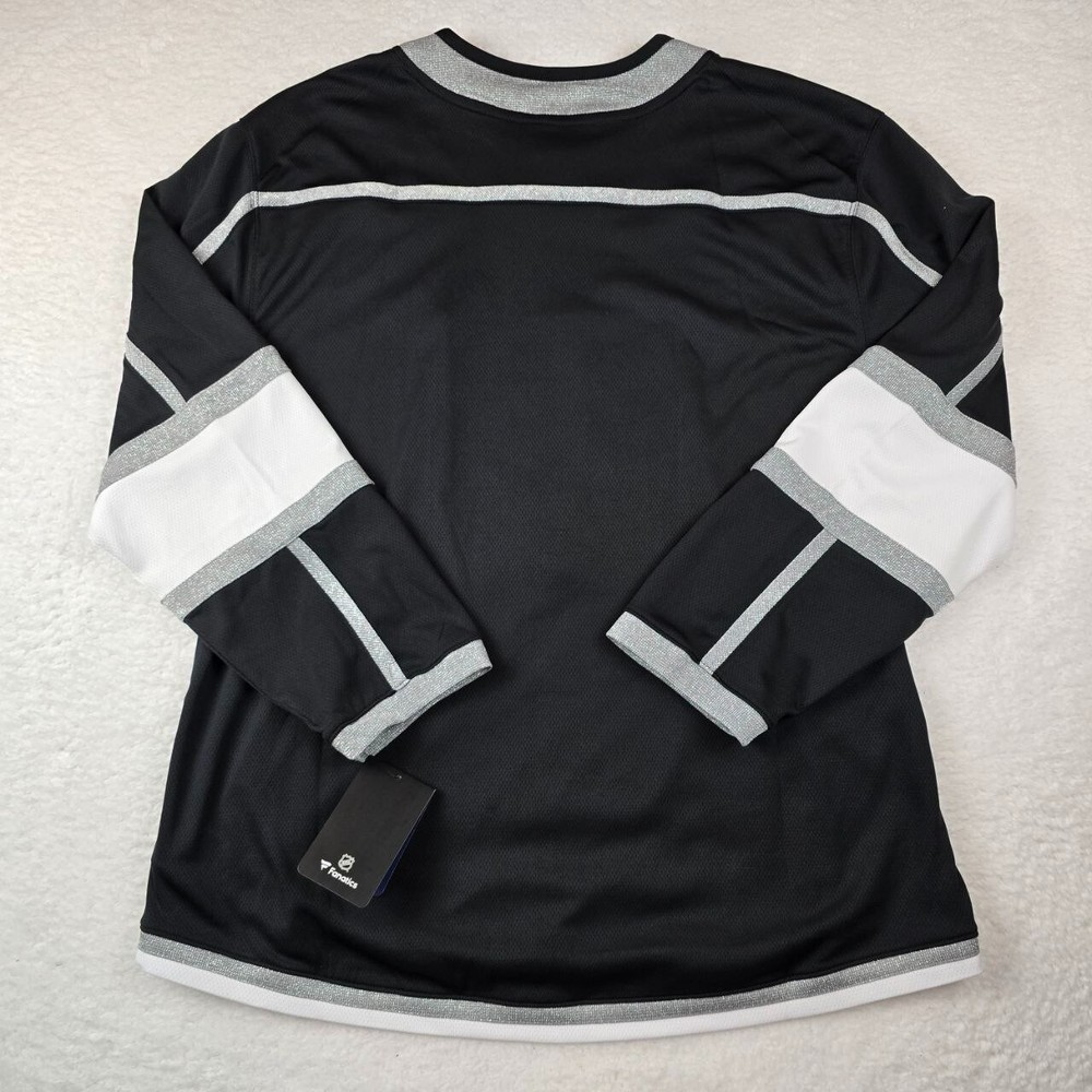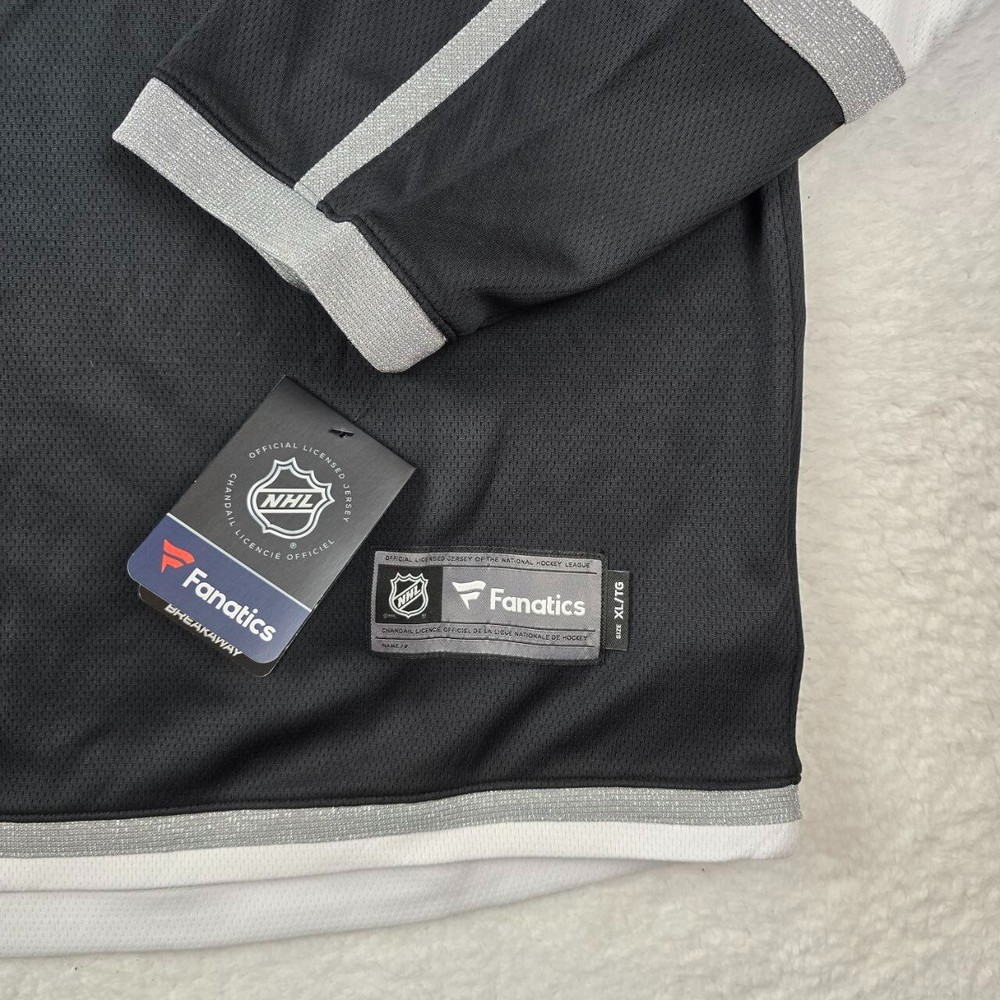 Show your support for the Los Angeles Kings with this officially licensed Fanatics home breakaway hockey jersey. This men's size XL jersey is perfect for any fan of the National Hockey League (NHL). The black color and Los Angeles Kings team logo make it a great addition to any fan's collection. Whether you're watching the game from the stands or playing on the ice yourself, this jersey is a must-have for any true hockey fan.