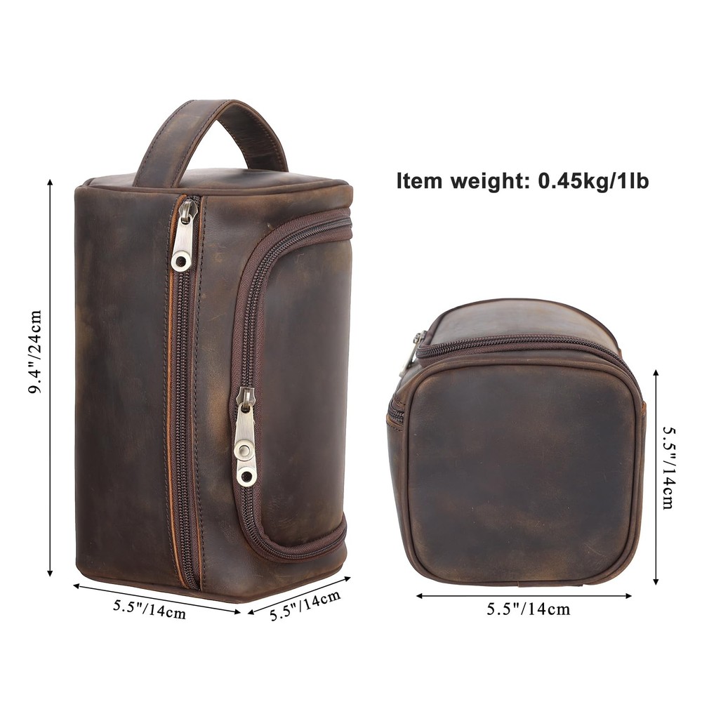 About Us brand has been specializing in leather bags since 1985, our bags are handcrafted by experienced and well skilled artisans. Full grain cowhide leather bags are unique in design and combine both function and style, providing users with more convenient way for daily life, premium quality of products and high-Effective service. About Leather The distinguishing feature of leather is that surface have disorderly wrinkles, scratches that present the style of retro. If you don't like scratches, you can apply colorless mink oil to the surface of the leather and the scratches will disappear. The leather looks brighter as it ages and more times of use. Leather Care Apply colorless leather oil and rub it gently until the product is blended properly. Let it air dry. Leather Smell It has a natural smell that will disappear after a few days in a dry, cool, ventilated place. Product Dimensions 9.4" L x 5.5" W x 5.5" H Net Weight: 1lbs/ 0.45kg 1lbs Purchase with Confidence We provide 1 Year Quality Guarantee and Excellent Customer Service. We will be responsible for any problems(non-human damage) within one year from the date of your purchase. 【Premium Quality】This mens leather toiletry bag is made of 2mm thick full grain cowhide leather, processed with crazy horse leather technology to enhance durability and maintain the natural pores and texture of cowhide. Its retro look makes it unique and popular; Outfitted with ykk plastic zippers, reinforced handle and water-resistant interior lining, it is the portable toiletries organizer for leisure and travel 【Large Opening and Capacity】Dimension: 9.4" L x 5.5" W x 5.5" H, weights 1lbs. The unique double zipper main compartment features an extra wide opening for easy access to internal toiletries. The external zipper pocket and inner mesh pocket can be sorted to store small items such as toothbrushes and electric trimmers 【Portable and Practical】The stainless steel hook allows to hang the toiletry kit on towel racks, coat hooks and other places, keeping them organized. There are four brass rivets on the bottom to keep the leather dry from water on the sink counter 【Multi Purpose】It accommodates a variety of travel toiletries and shaving supplies. The versatile travel bathroom bag is suitable for overnight, camping, business travel and everyday use. It would be a great gift for people that love to travel 【Purchase with Confidence】We provide 1 year quality commitment and excellent customer service! If you have any problems with our products, please reach us and we take care of all quality-related issues