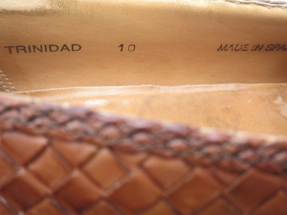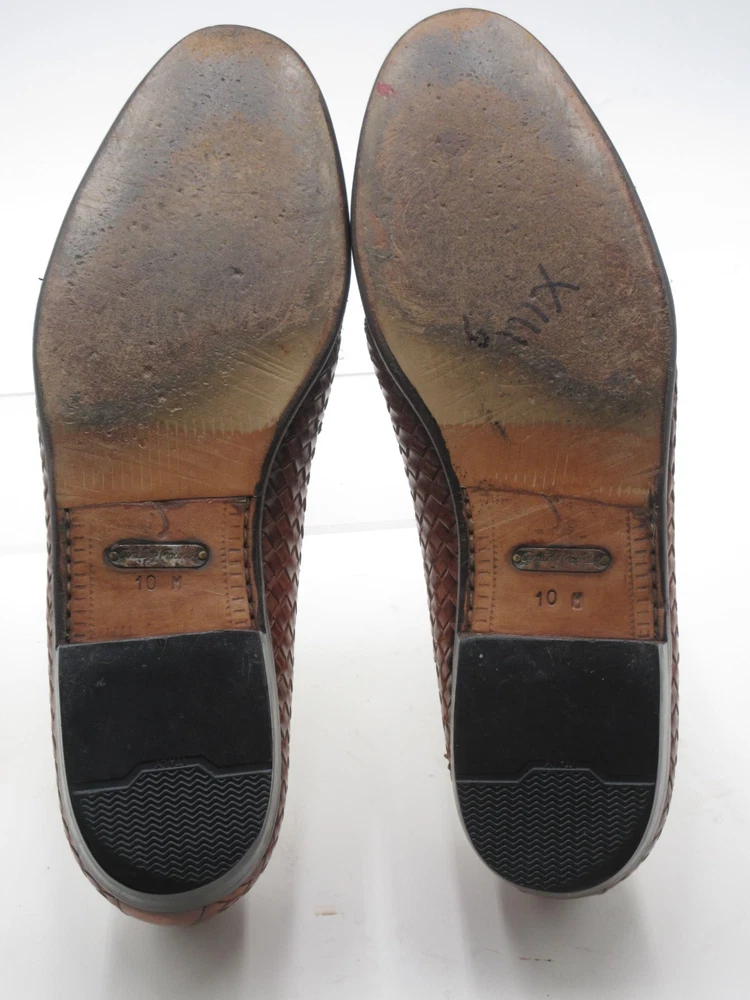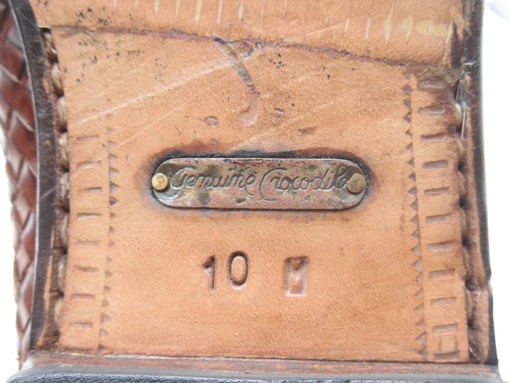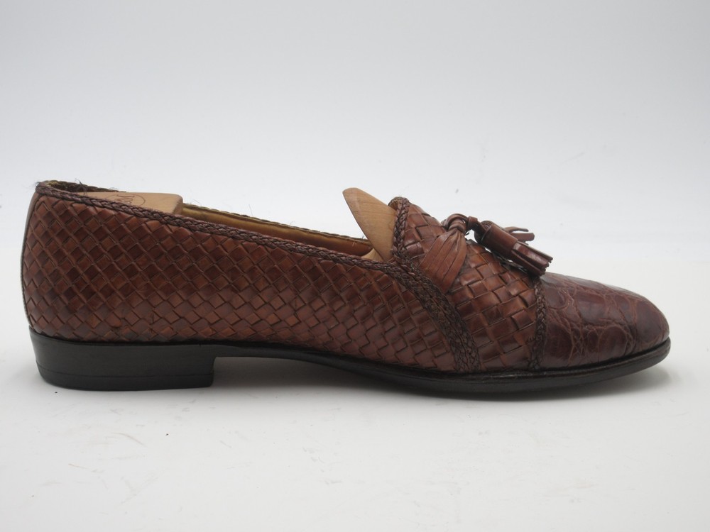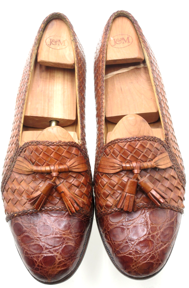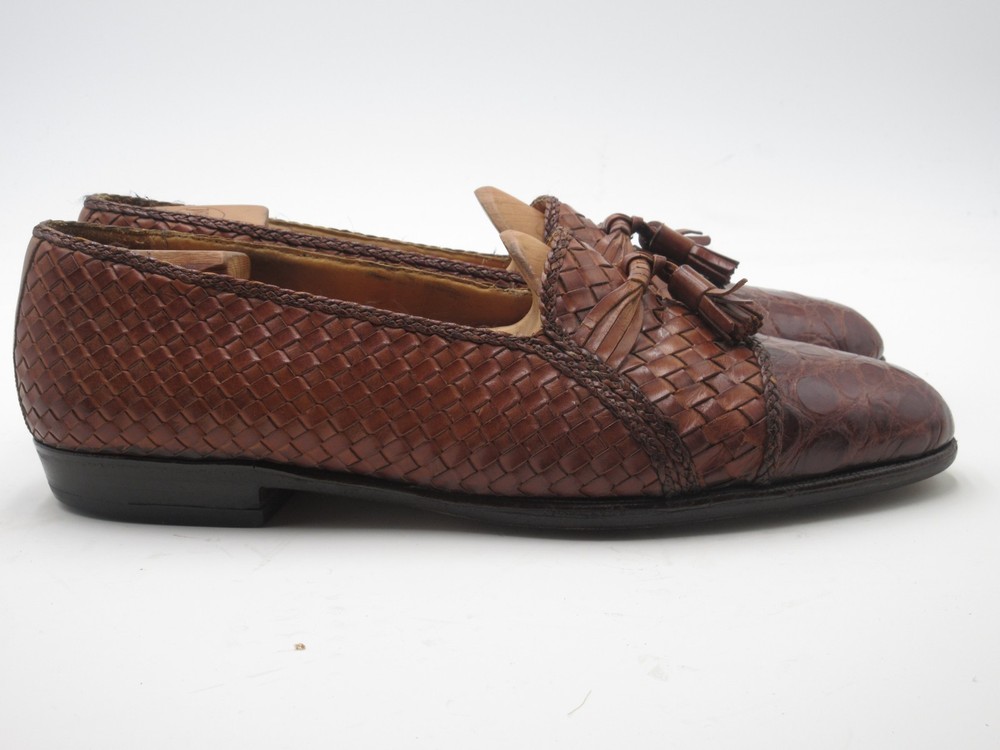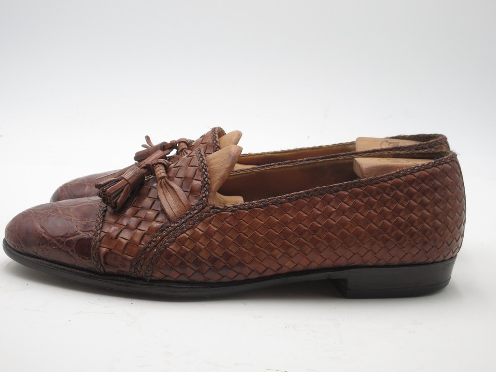 Men's pre-owned, brown woven g enuine crocodile skin & calf uppers, apron toe tasseled loafers by Mezlan Trinidad in size 10 M. Made in Spain. In good used condition. The outer sole measurements are; 11 7/16 " long & 3 15/16 " wide. Please email me your questions. The shoe trees are not included. BUYERS WITH FEEDBACK SCORE OF LESS THAN 10 ARE REQUIRED TO PAY IMMEDIATELY. COMBINED SHIPPING AVAILABLE LOW BALL BIDDERS WILL BE BLOCKED FROM FUTURE LISTINGS <div style="text-align:center"><a style="text-decoration:none" href="http://mostpopular.sellathon.com/?id=AC1350830"><img src="http://www.sellathon.com/Resources/Images/countercredit.gif" border="0"></a></div>