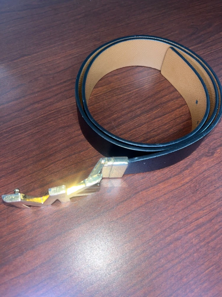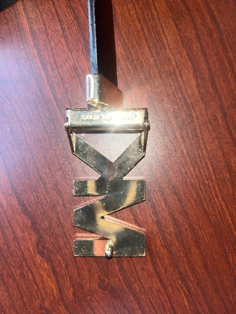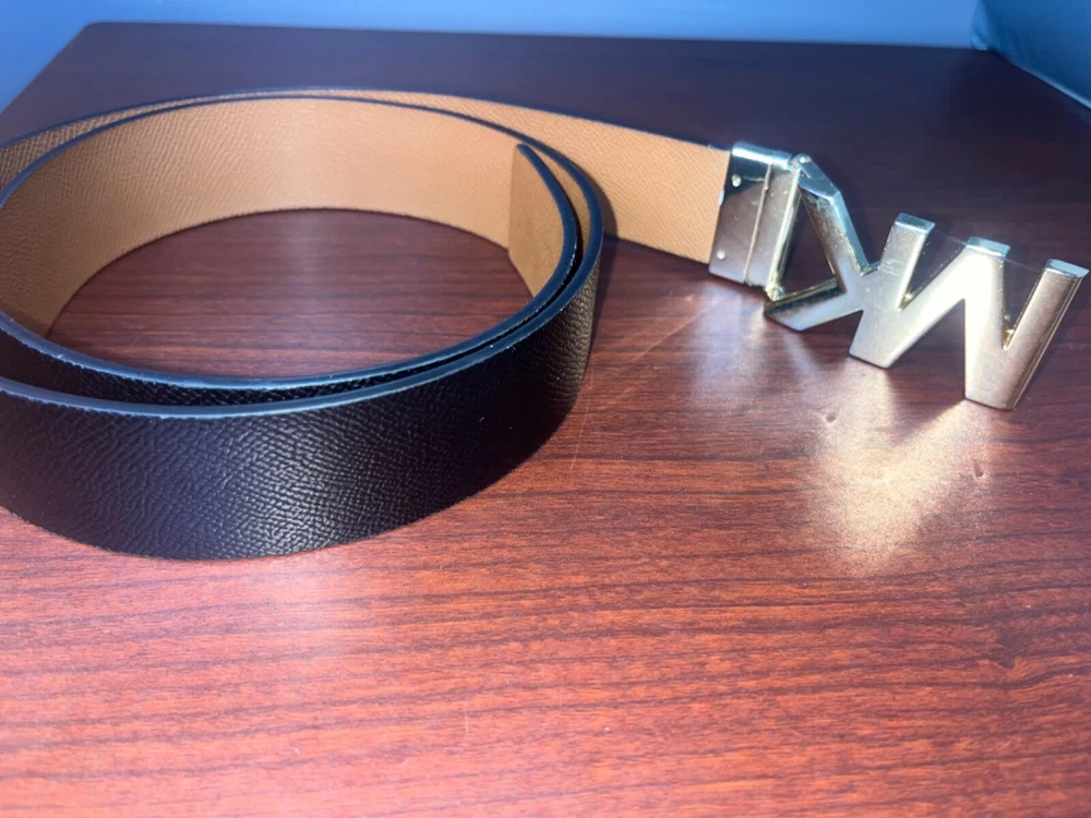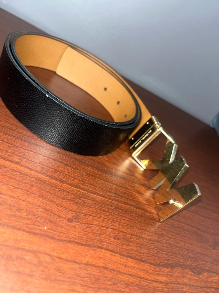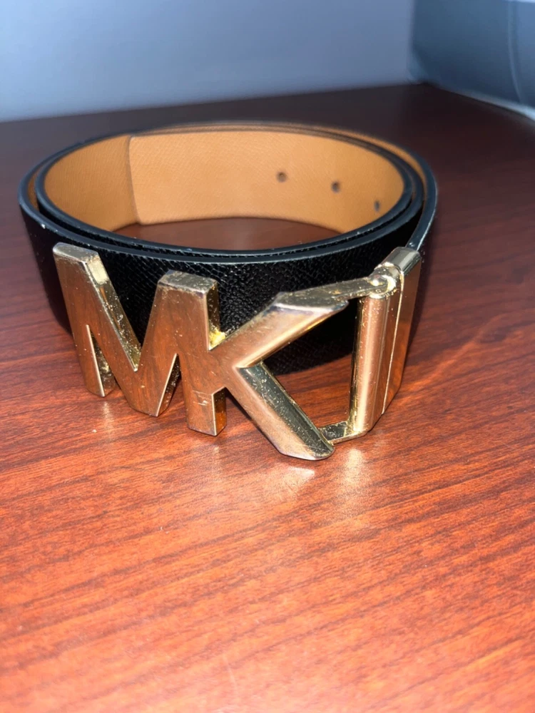 This is a men's Michael Kors belt in black or brown, featuring the brand's signature logo accents. The belt is made of leather, with a size range from 30" to 41" and a classic designer style suitable for both dressy and casual outfits. It is a preowned item with two sides, perfect for adding a touch of sophistication to any wardrobe.