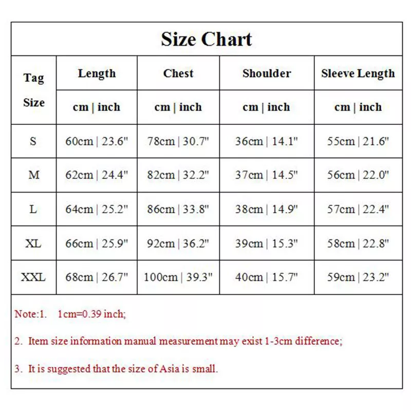 Description Feature: 100% Brand new and high quality Style: fashion,sexy,boho Size: S,M,L,XL,2XL Gender: men Color: white,grey,black,dark grey,royal blue Material: polyester Fabric: cotton blend Sleeve length: long sleeve Thickness: thin Neckline: turtleneck Length: hips Pattern: solid Season: Spring,Autumn,Winter Occasion: daily Garment:Hand washing or machine washing,line dry. Package:1pcs tops Note: 1.Due to the light and screen difference, the item's color may be slightly different from the pictures. Please understand. 2.Please allow 2-3% error due to manual measurement.Please make sure you don’t mind before you mid. 3.Size doesn’t fit all.Please carefully check size chart and select the size based on your real size. Size Chart Tag Size Length Chest Shoulder Sleeve Length cm | inch cm | inch cm | inch cm | inch S 60cm | 23.6'' 78cm | 30.7'' 36cm | 14.1'' 55cm | 21.6'' M 62cm | 24.4'' 82cm | 32.2'' 37cm | 14.5'' 56cm | 22.0'' L 64cm | 25.2'' 86cm | 33.8'' 38cm | 14.9'' 57cm | 22.4'' XL 66cm | 25.9'' 92cm | 36.2'' 39cm | 15.3'' 58cm | 22.8'' XXL 68cm | 26.7'' 100cm | 39.3'' 40cm | 15.7'' 59cm | 23.2'' Note:1. 1cm=0.39 inch; 2. Item size information manual measurement may exist 1-3cm difference; 3. It is suggested that the size of Asia is small.