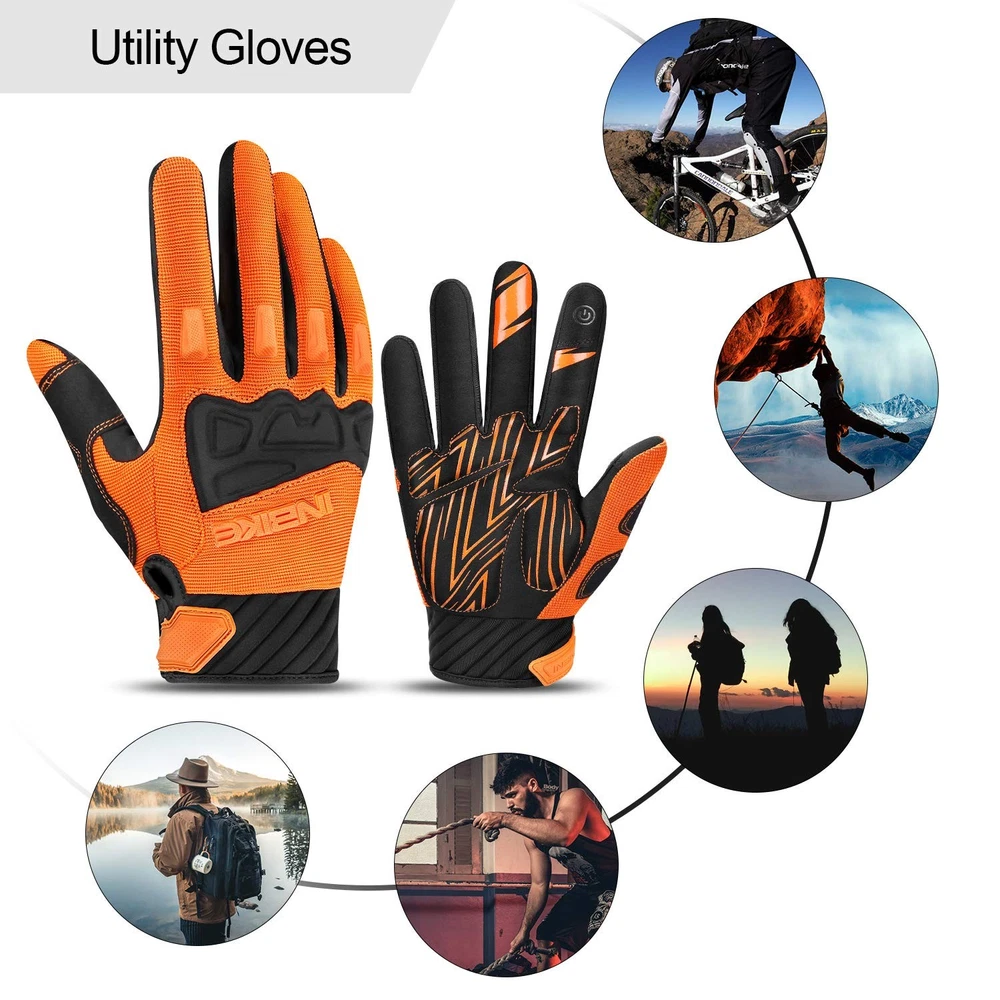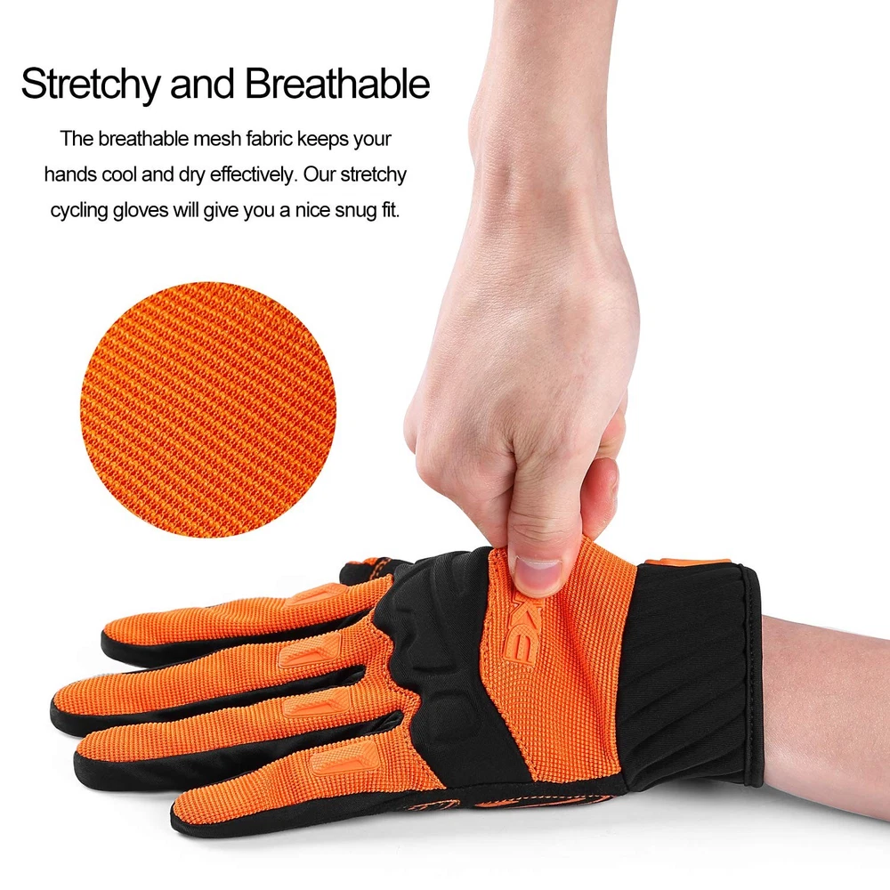 [Knuckles Protection]: The environmentally friendly SCR and TPR rubber on the back of bicycle gloves, will protect knuckles from injury when encounter friction or collision. Covering rubber only in critical areas makes the gloves more breathable. [Wear-resistant/Non-slip/Shock-resistant]: The 5MM palm pads will effectively absorb shock, reduce pain and numbness, and non-slip silicone strips on it, make riding easier. [Comfortable and Breathable]: The high-stretch and breathable fabric used in the back of this cycling gloves, will give you a good hand wrapping feeling, and the mesh will keep hands fresh and comfortable in hot weather. The microfiber fabric in palm is more durable than regular fabrics, extending the life of the glove. [Touch Screen Design]: This dirt bike glove can touch the screen with your index finger and thumb, allowing you to use your mobile device flexibly without taking off the glove. Additional, Hoop and loop strap allow for easy glove removal. [After-sales Service]: If you have any problems, please feel free to contact us, we will provide you with refund and replacement services.