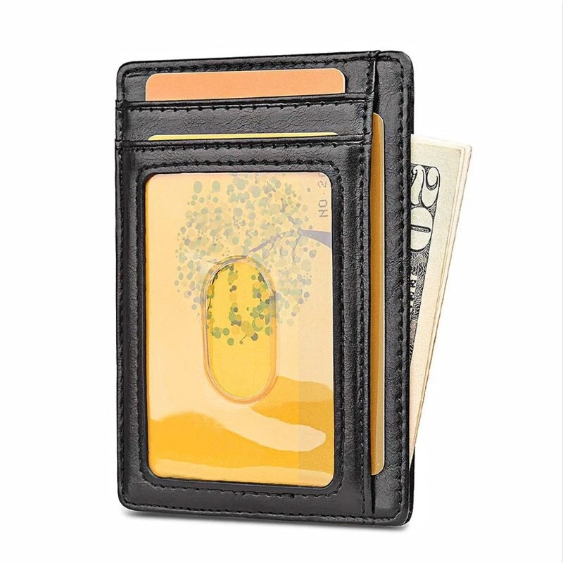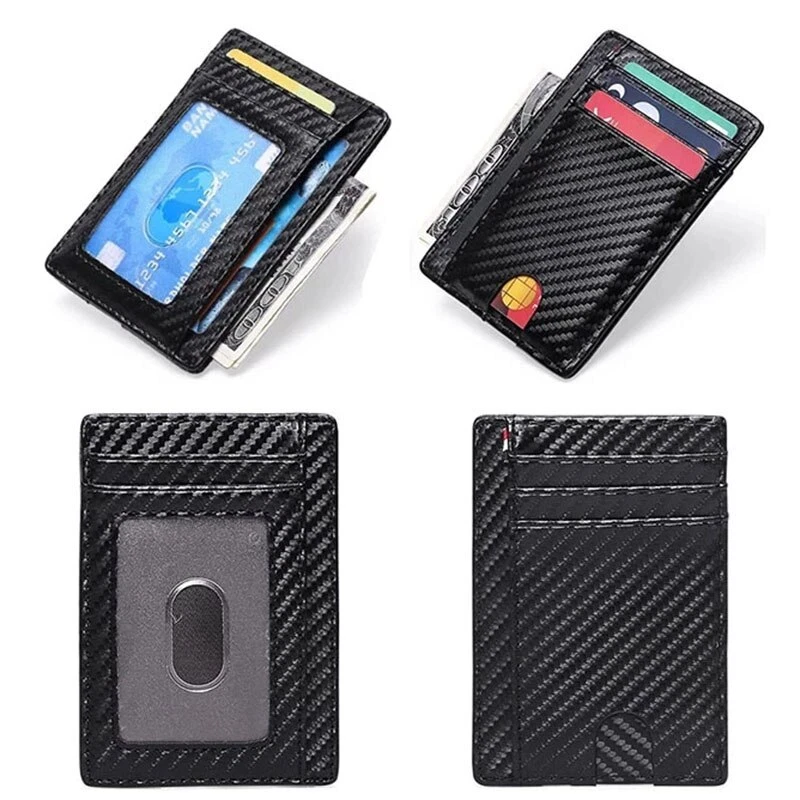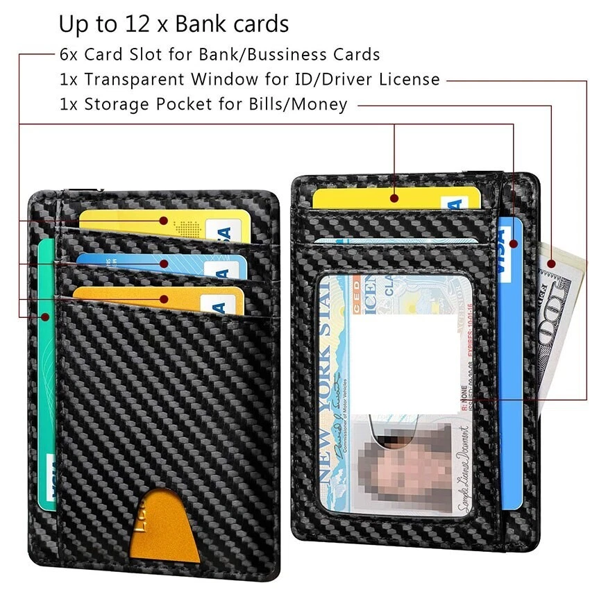 Slim RFID Blocking Leather Wallet Minimalist Credit Card Money Purse Holder Unisex Fashion Bag Holds up to 12 Cards Description: brand new and high quality Features: Made of highest quality materials for RFID blocking wallet. Help prevent their sensitive information from being stolen. Securely stores 12 of your bank or store cards, while also benefiting from a side pocket to keep your notes safe too. A clear PVC window allows you to quickly and easily show your work badge or ID card. Wallet only, other accessories demo in the picture is not included. Specification: Type: Credit Card Purse Material: Leather Applications: Credit Card Money Bank Notes Storage Features: Credit Card Purse, Slim Blocking Wallet, Minimalist, Money Holder, Unisex Fashion Bag, Multipurpose Storage Dimension: app.11x8cm / 4.33x3.15in Color: Black , Carbon Fiber (optional) Quantity: 1 Pc Note: 1.No retail package 2.Please allow 0-1cm error due to manual measurement. pls make sure you do not mind before you bid. 3.Due to the difference between different monitors, the picture may not reflect the actual color of the item. Thank you! Package includes: 1 Piece Card Purse