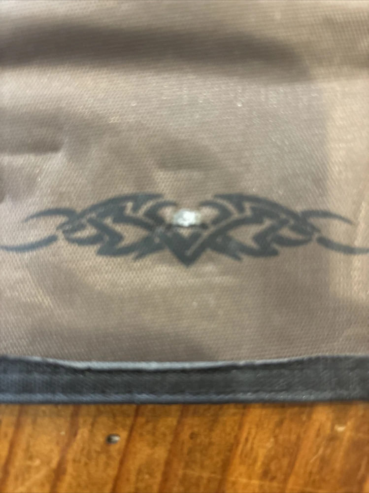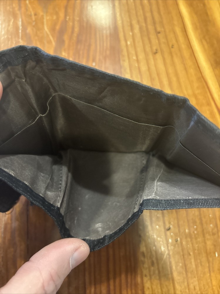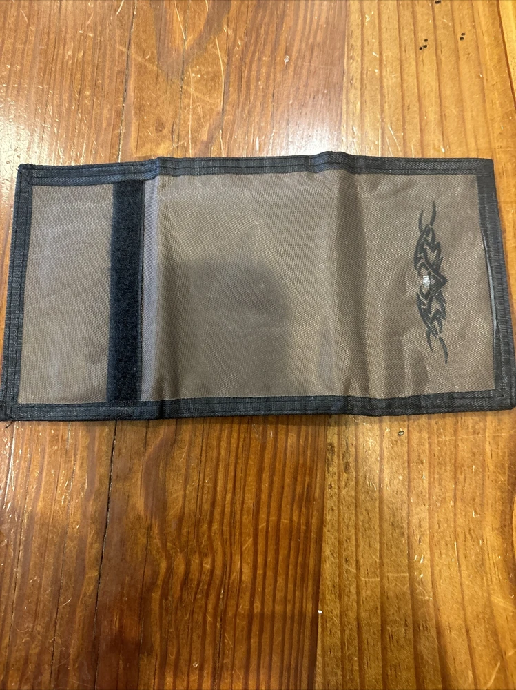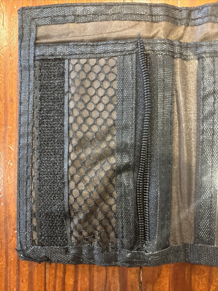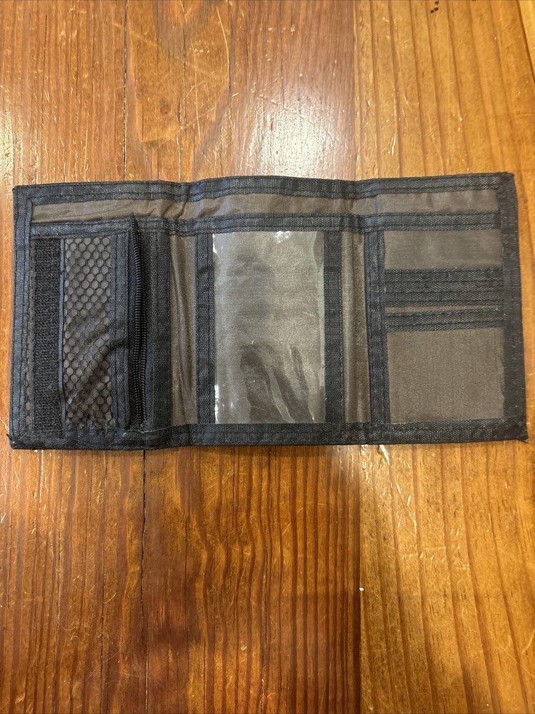 Mens Credit Card Trifold Nylon Wallet Olive Green w/ Touch Fasteners Closure This olive green trifold wallet is the perfect accessory for any biker or classic style enthusiast. Made of durable nylon microfiber fabric, this wallet features a hook and loop closure and enough space for all your credit cards. The wallet is accented with a logo, adding a touch of personality to your everyday style. Note: zipper missing