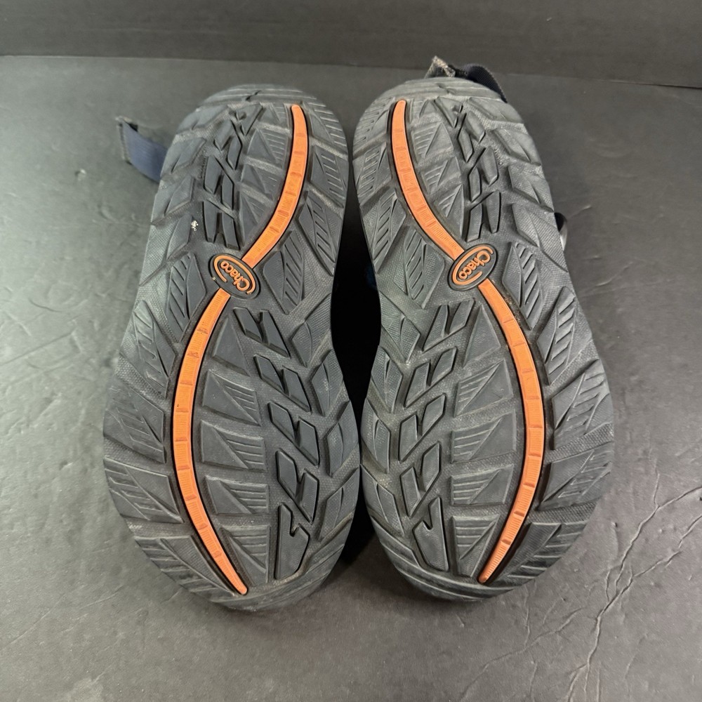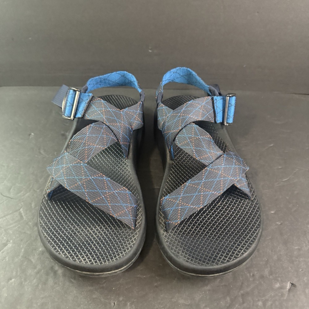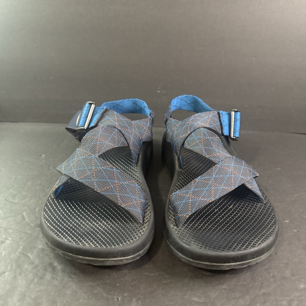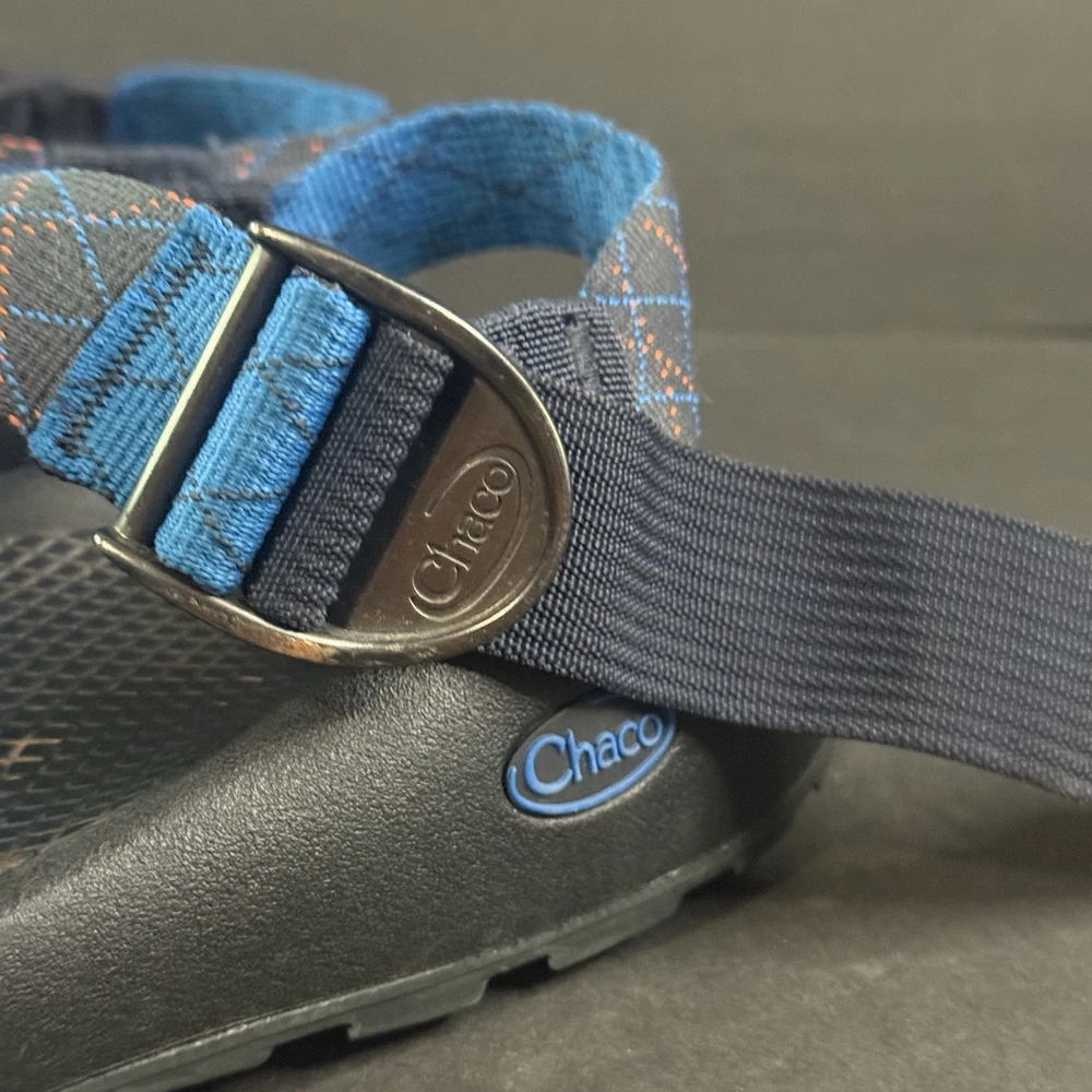 The product is a pair of Men’s Chaco adjustable sandals in size 9, featuring a blue and orange pattern. These sporty casual sandals are designed for hiking and other outdoor activities, with an adjustable fit for added comfort. The synthetic upper material and slip-on style make them durable and easy to wear for various occasions. Ideal for men who enjoy blending style and functionality in their footwear.