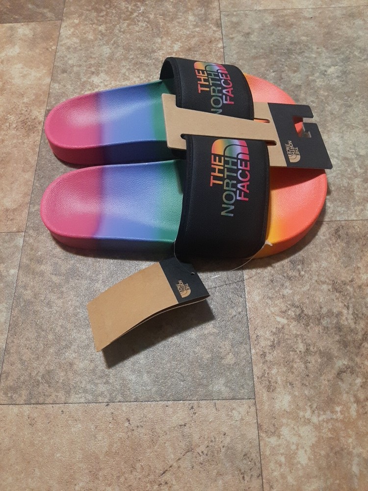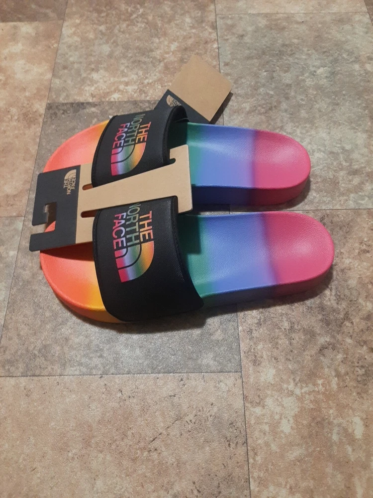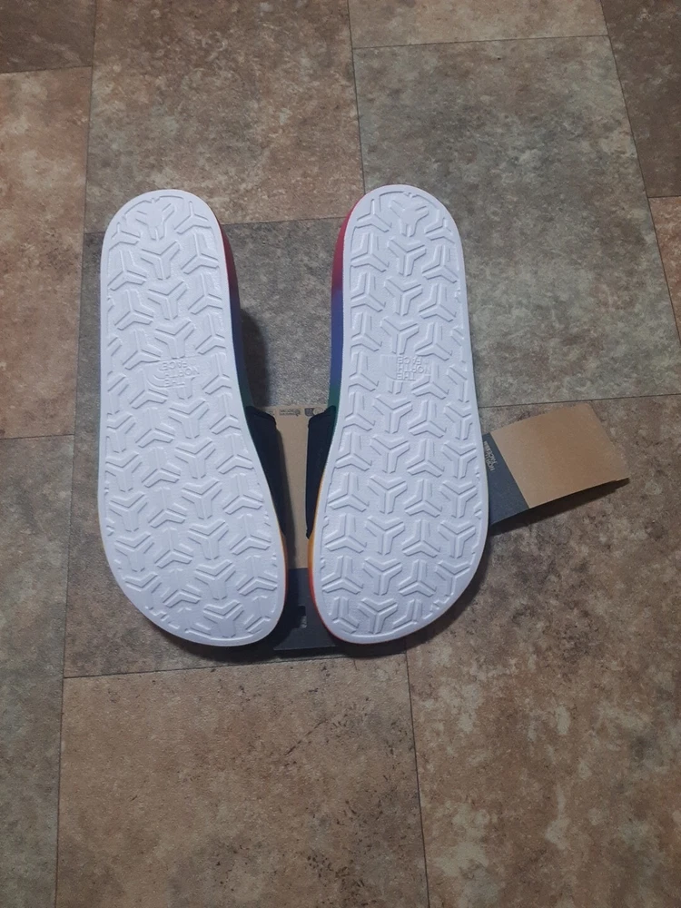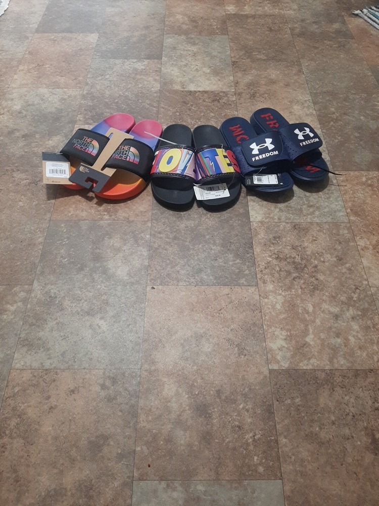 Elevate your style and comfort with this limited edition bundle of 3 pairs of men's slides, size 10. The striped pattern and multicolor design make these sandals perfect for any occasion, whether it's for travel, activewear, party/cocktail, casual, formal, workwear, or business. The cushioned, lightweight, and adjustable features of these slides make them perfect for any season, including winter, summer, fall, and spring. The outsole material is made of fabric and the insole material is made of rubber. These slides are vintage and belong to the Under Armour and Adidas product lines. The North Face character and the Under Armour theme add to the style of these slides. Get ready to slip into comfort with these stylish slides that are perfect for any occasion.