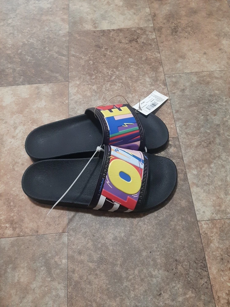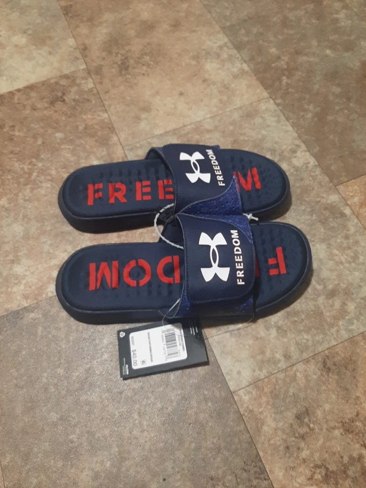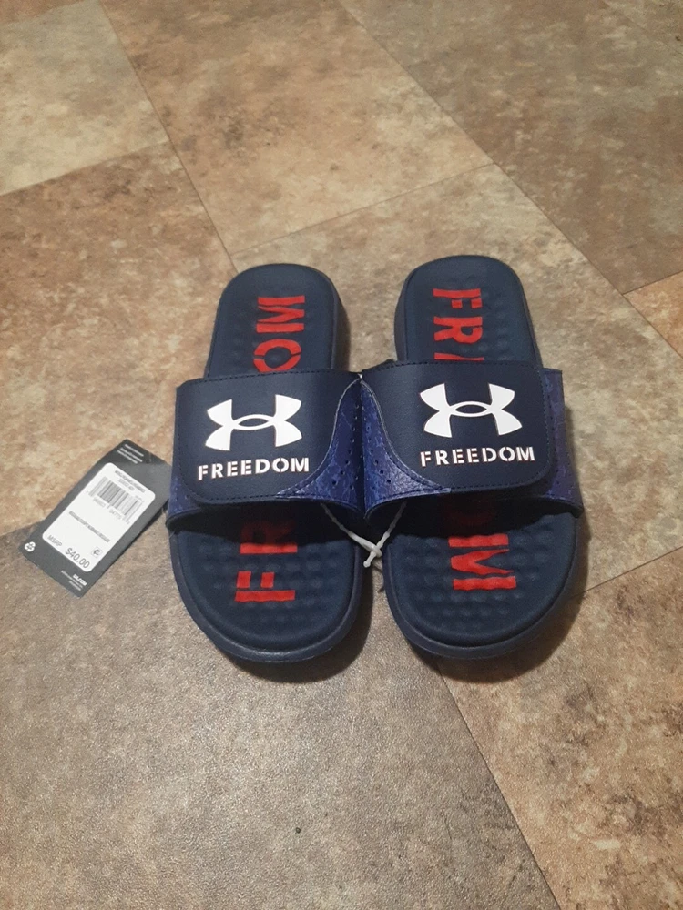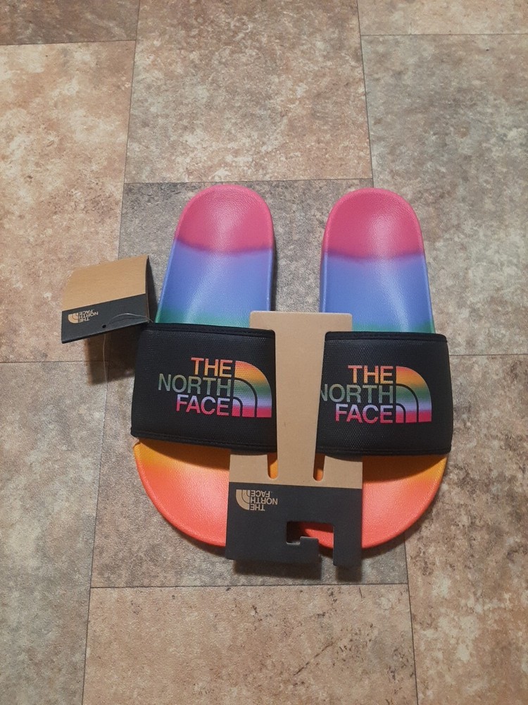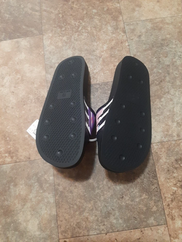 Elevate your style and comfort with this limited edition bundle of 3 pairs of men's slides, size 10. The striped pattern and multicolor design make these sandals perfect for any occasion, whether it's for travel, activewear, party/cocktail, casual, formal, workwear, or business. The cushioned, lightweight, and adjustable features of these slides make them perfect for any season, including winter, summer, fall, and spring. The outsole material is made of fabric and the insole material is made of rubber. These slides are vintage and belong to the Under Armour and Adidas product lines. The North Face character and the Under Armour theme add to the style of these slides. Get ready to slip into comfort with these stylish slides that are perfect for any occasion.