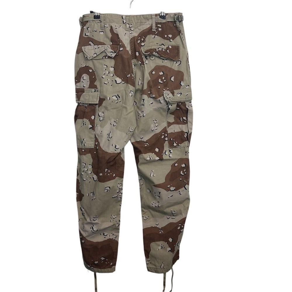 The Rothco men's cargo pants in size S feature a multicolor camouflage pattern and are made from a blend of cotton and nylon. These vintage-style pants have a mid-rise of 10-12 inches and a straight leg style. They include a drawstring closure, adjustable waist tabs, and multiple cargo pockets for convenience. The inseam measures between 26-1/2 to 29-1/2 inches, and the waist size ranges from 27 to 31 inches. The pants are pre-owned. Keywords: Rothco, men's cargo pants, multicolor, camouflage, vintage, military, cotton, nylon, adjustable waist, drawstring, cargo pockets, straight leg, pre-owned.