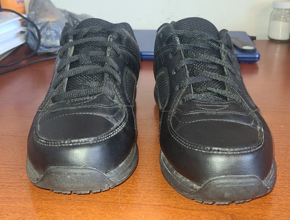 This pair of Safe T Step Comfort Work Shoes in black is perfect for men who are always on the go. The lace-up closure ensures a secure fit while the slip-resistant feature keeps you safe and stable while walking or working. The shoes have a round toe shape and a solid pattern that makes it suitable for casual wear. The upper material of the shoes is made of leather which adds durability and style. The shoe is available in size 6.5 UK, 7.5 US and 40 EU. It is a casual sneaker style with a wide shoe width that adds comfort to your feet. The brand is a reliable choice for footwear, and the shoes belong to the casual shoe category.
