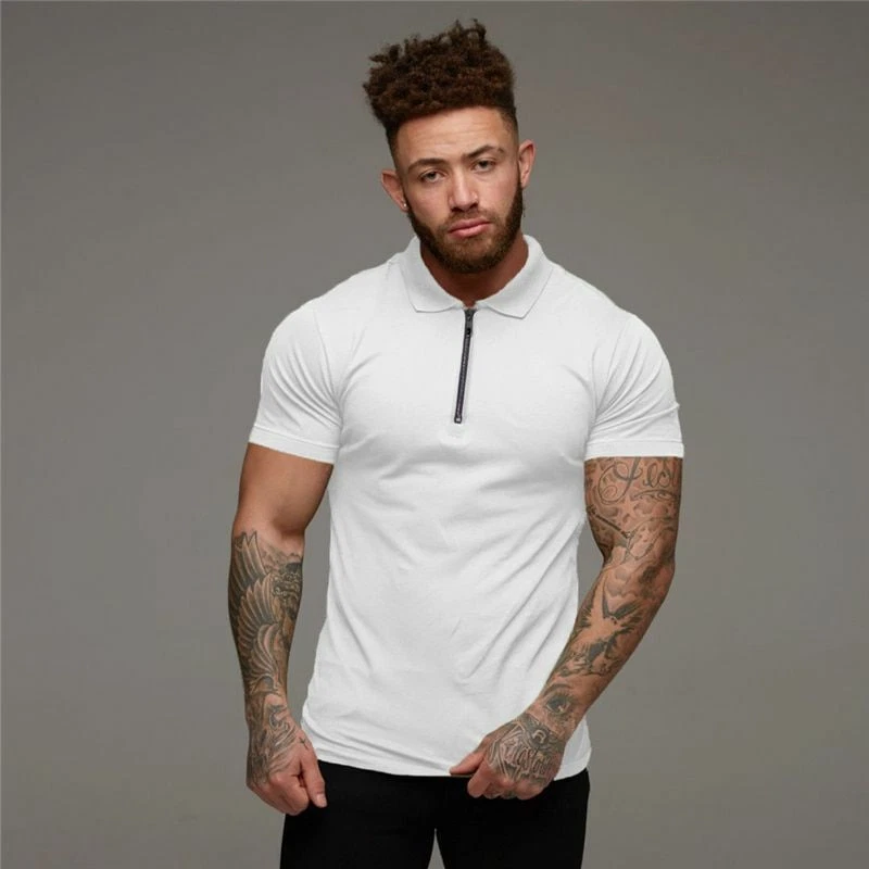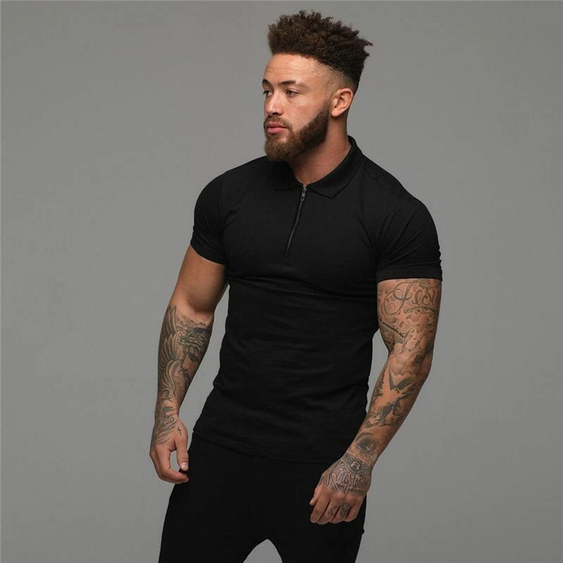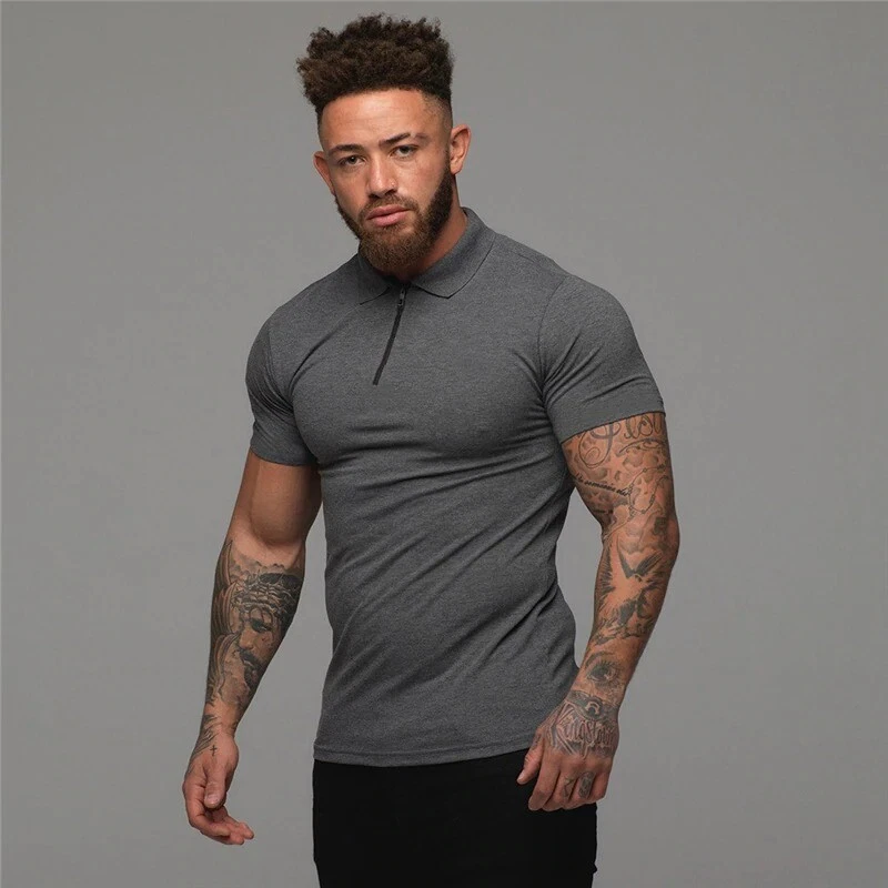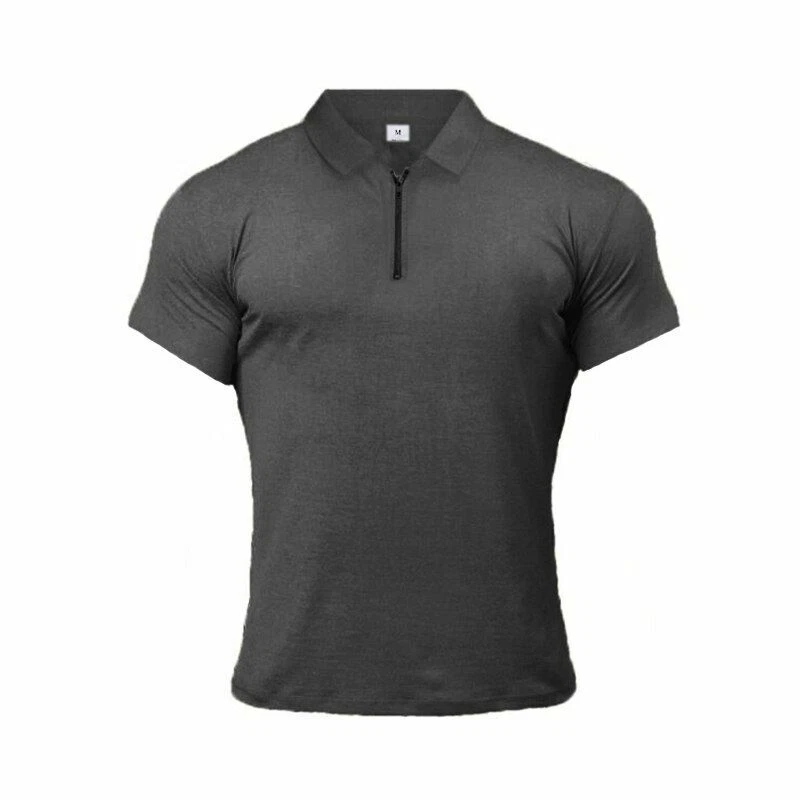Mens T Shirts Casual Fashion Gym Fitness Short Sleeve Zip Muscle Guy Polo Shirt