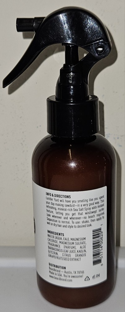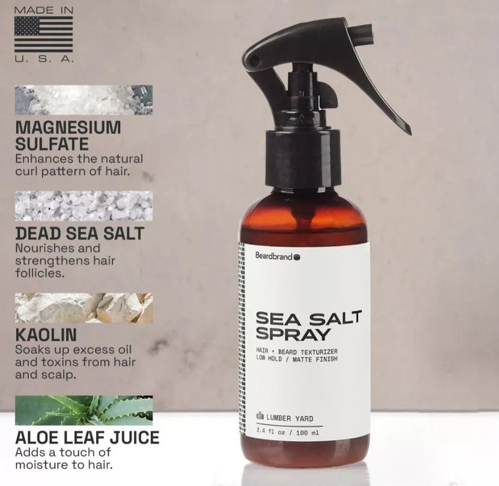 Beardbrand LUMBER YARD Sea Salt Spray 3.4 fl.oz / 100 ml NEW ABOUT THIS ITEM: TEXTURIZING SEA SALT SPRAY - Ideal for oily to average hair types, the leave-in styling mist is formulated with sea salt, which helps give hair a beautifully messy texture and hold while adding shine VOLUME & FULLNESS - Salt adds incredible volume and texturizes hair for a beach or surfer hair style. It also adds amazing richness and fullness to thinning or fine hair INSPIRED BY NATURE - Infused with kaolinite clay, to mimic the grit of beach sand, giving hair a natural boost while removing toxins and excess oil. The warm and woody scent of this hair-styling mist leaves locks smelling irresistibly good INVIGORATING SCENT - The cedarwood and sandalwood scent is subtle and not overpowering, making it ideal for those who prefer a more understated fragrance Sea Salt Spray for Men – Hair Texture Spray Adds Instant Volume, Texture & Thickness, Lightweight Hair Salt Spray for Natural, Textured Look, Lumber Yard Scent, Achieve Effortless Style & All-Day Hold