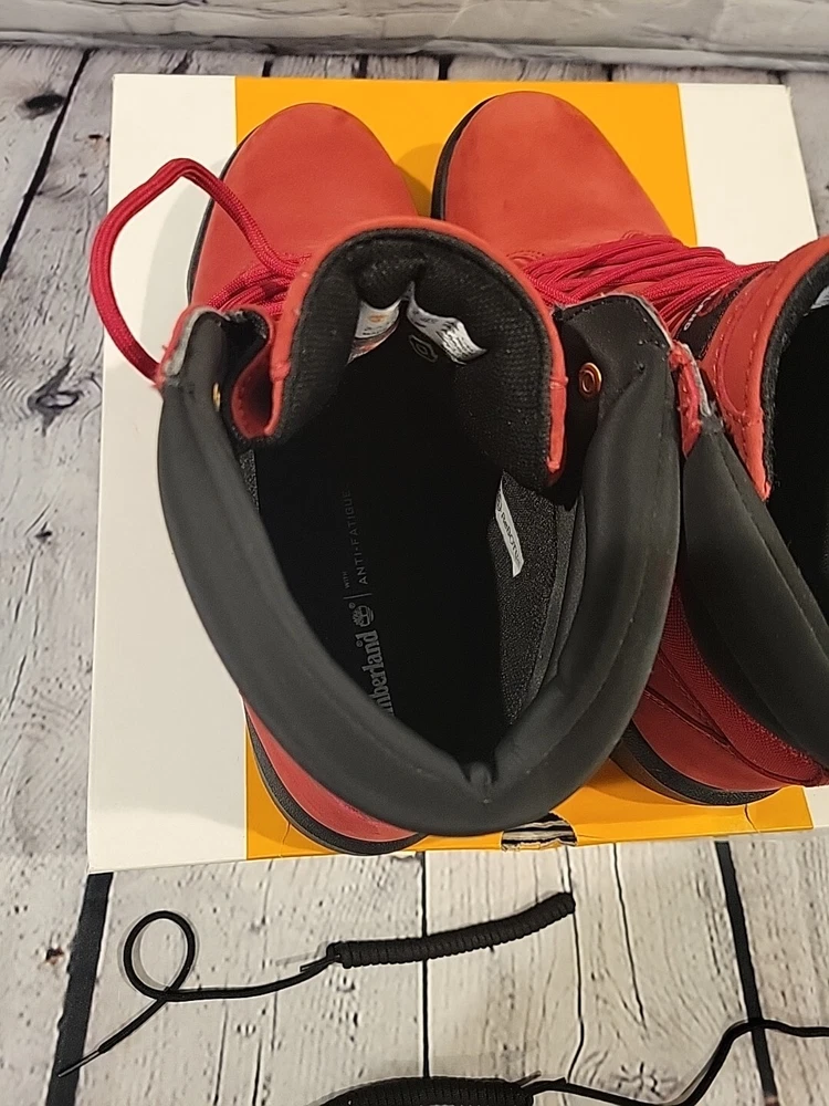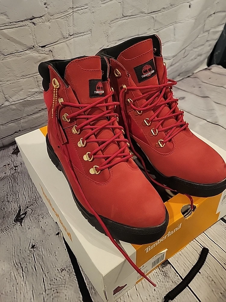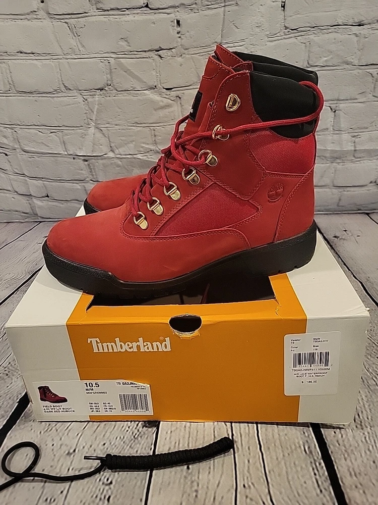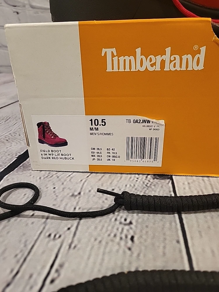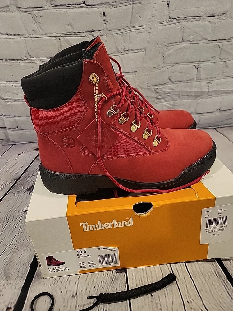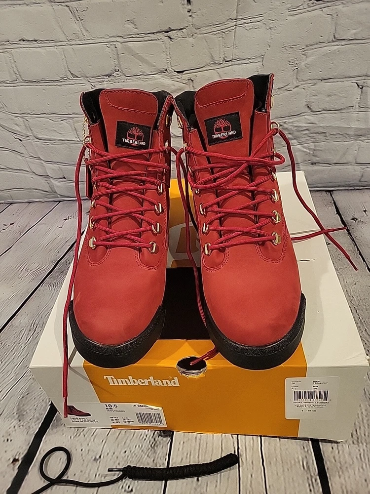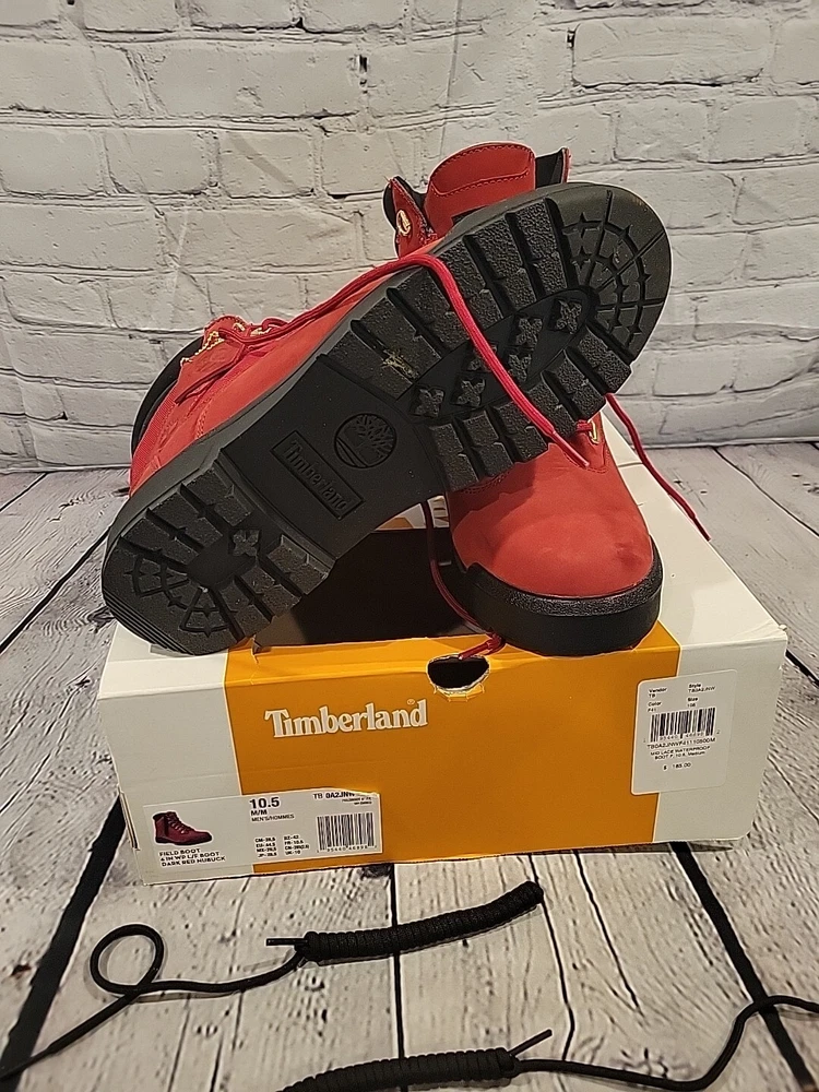 Step into the great outdoors or tackle urban jungles with the robust Timberland 6 In. Field Boot in a striking dark red hue. Crafted from premium nubuck leather, these boots offer durability and a comfortable fit that's ideal for an active lifestyle. The lace-up closure ensures a secure fit, making them perfect for both work and casual wear.The timeless solid pattern and medium-width build cater to a sleek yet versatile aesthetic, complemented by the practicality of a shoe designed for both male adventure-seekers and everyday commuters. The boots are a US size 10.5, and are not customized, ensuring you get the authentic Timberland quality and design intended. PLEASE NOTE: YOU WILL RECEIVE A SET OF BLACK LACES AS WELL TO SWITCH UP IF YOU DESIRE! IF YOU HAVE ANY QUESTIONS PLEASE ASK BEFORE PURCHASE AND I WILL BE HAPPY TO ANSWER. THANKS!