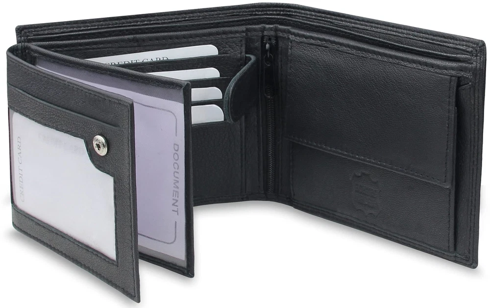 Description Discover the ultimate blend of style, functionality, and security with our Men's Trifold Genuine Leather Wallet in Black. Crafted from high-quality genuine leather and accented with sturdy double stitching, this wallet is built to last. Organization is effortless with its trifold design, featuring 9 card slots, 2 spacious bill compartments, 4 large sections for IDs and receipts, a convenient coin pocket, and a secure zipper pocket for added versatility. Whether you need quick access to your debit cards or a safe spot for your spare change, this wallet has you covered. For added peace of mind, our wallet comes equipped with RFID protection, safeguarding your personal information from unauthorized scanning. No need for additional protective sleeves or cards — your essentials are protected within its sleek design. Ideal for any occasion, it arrives beautifully packaged in an elegant gift box, making it a perfect choice for birthdays, anniversaries, or any special celebration. Elevate your everyday carry with the sophistication and practicality of our Men's Trifold Genuine Leather Wallet. PREMIUM QUALITY: Crafted from 100% genuine leather with durable double stitching, ensuring long-lasting use. AMPLE STORAGE: This trifold wallet features 9 card slots, 2 bill compartments, 4 large sections for IDs and receipts, plus a coin pocket and a secure zipper pocket. SMART DESIGN: Includes 3 clear ID windows, perfect for displaying photos, driver’s licenses, or other important IDs. RFID BLOCKING: Built-in RFID protection keeps your personal data safe from electronic theft, eliminating the need for extra sleeves or cards. PERFECT GIFT: Comes in an elegant gift box, making it an excellent choice for birthdays, anniversaries, or any special occasion.